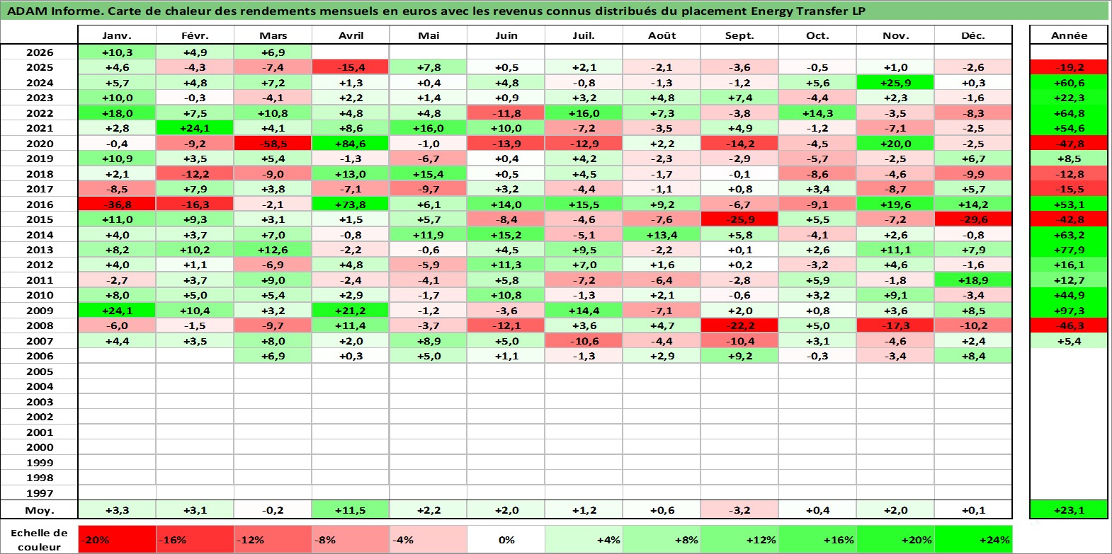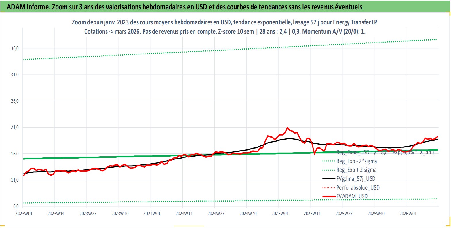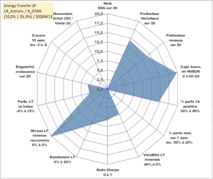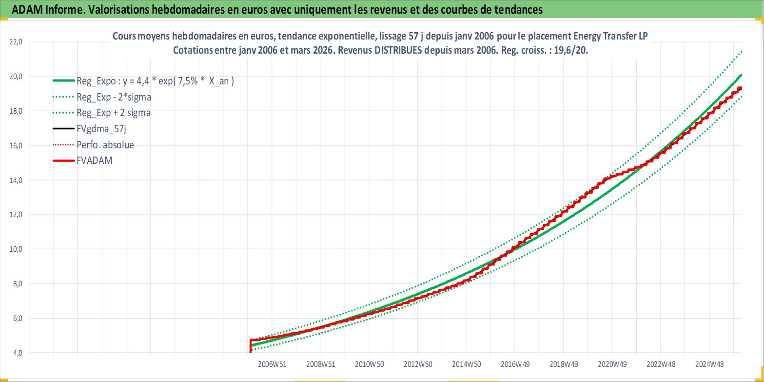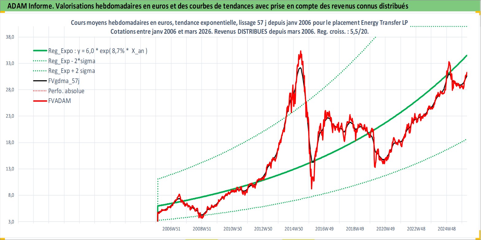 Site dédié aux investisseursPage dédiée sur site financeAnalyse des valorisations hebdomadaires de l'action Energy Transfer LP. Cet actif est cote en USD. Les valorisations sont en contrevaleur EURO et couvrent les semaines 2006W05 a 2026W13. Les revenus de cet actif financier sont pris en compte depuis la semaine 2006W13. La note ESG de cet actif n'est pas connue.