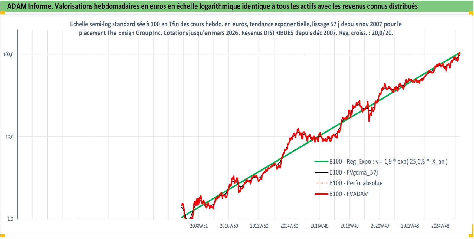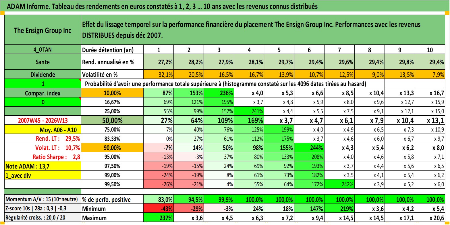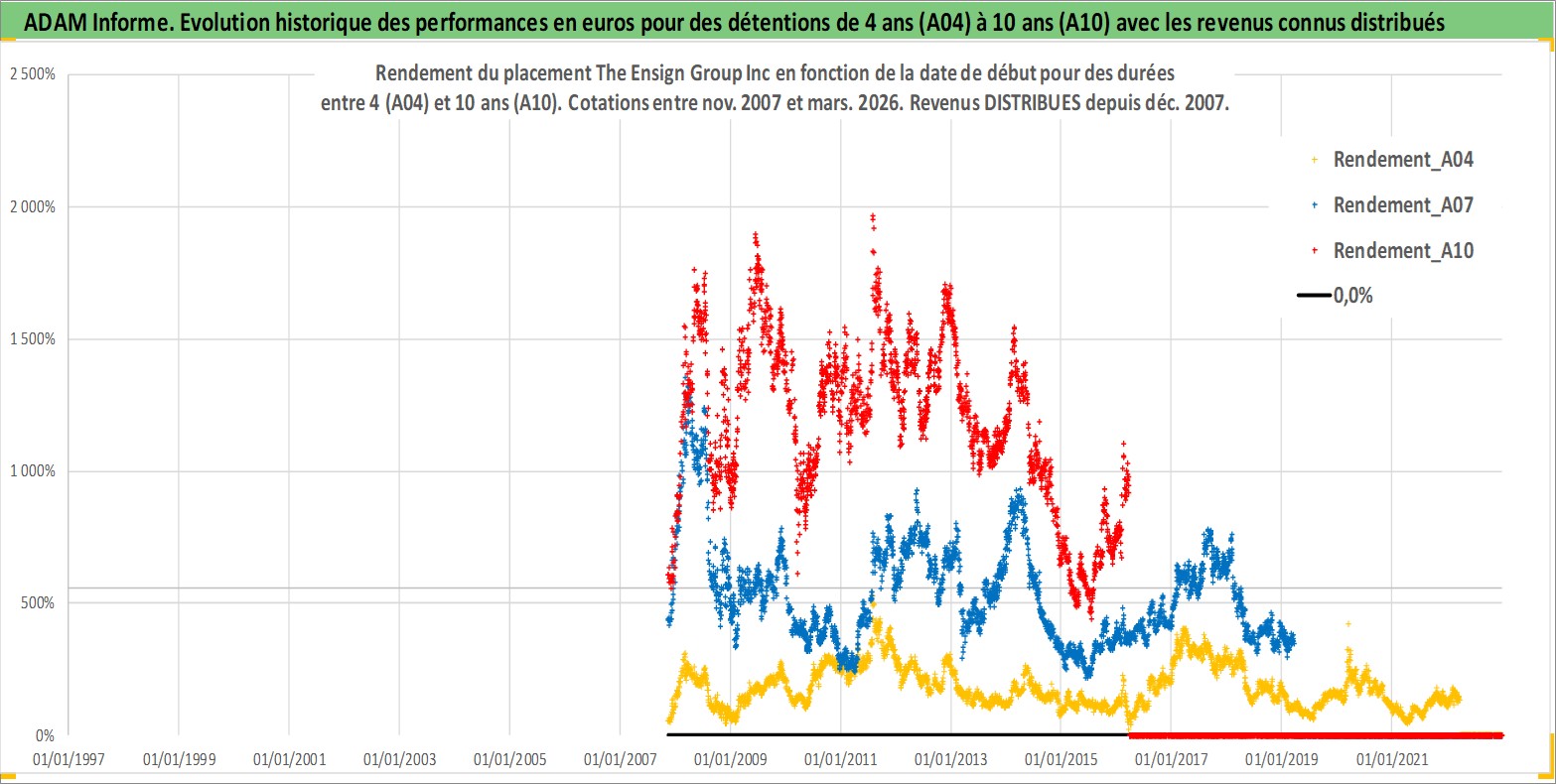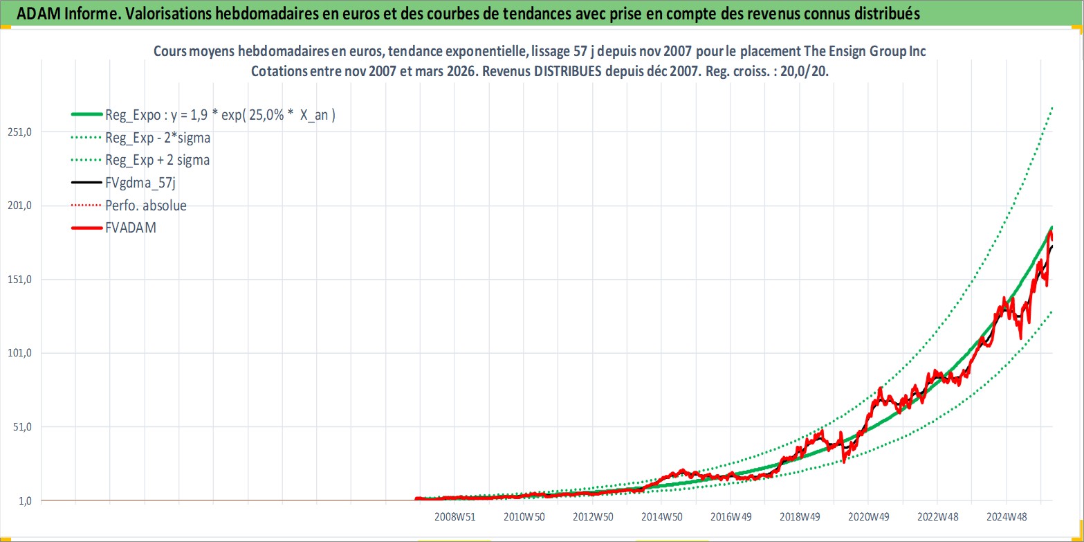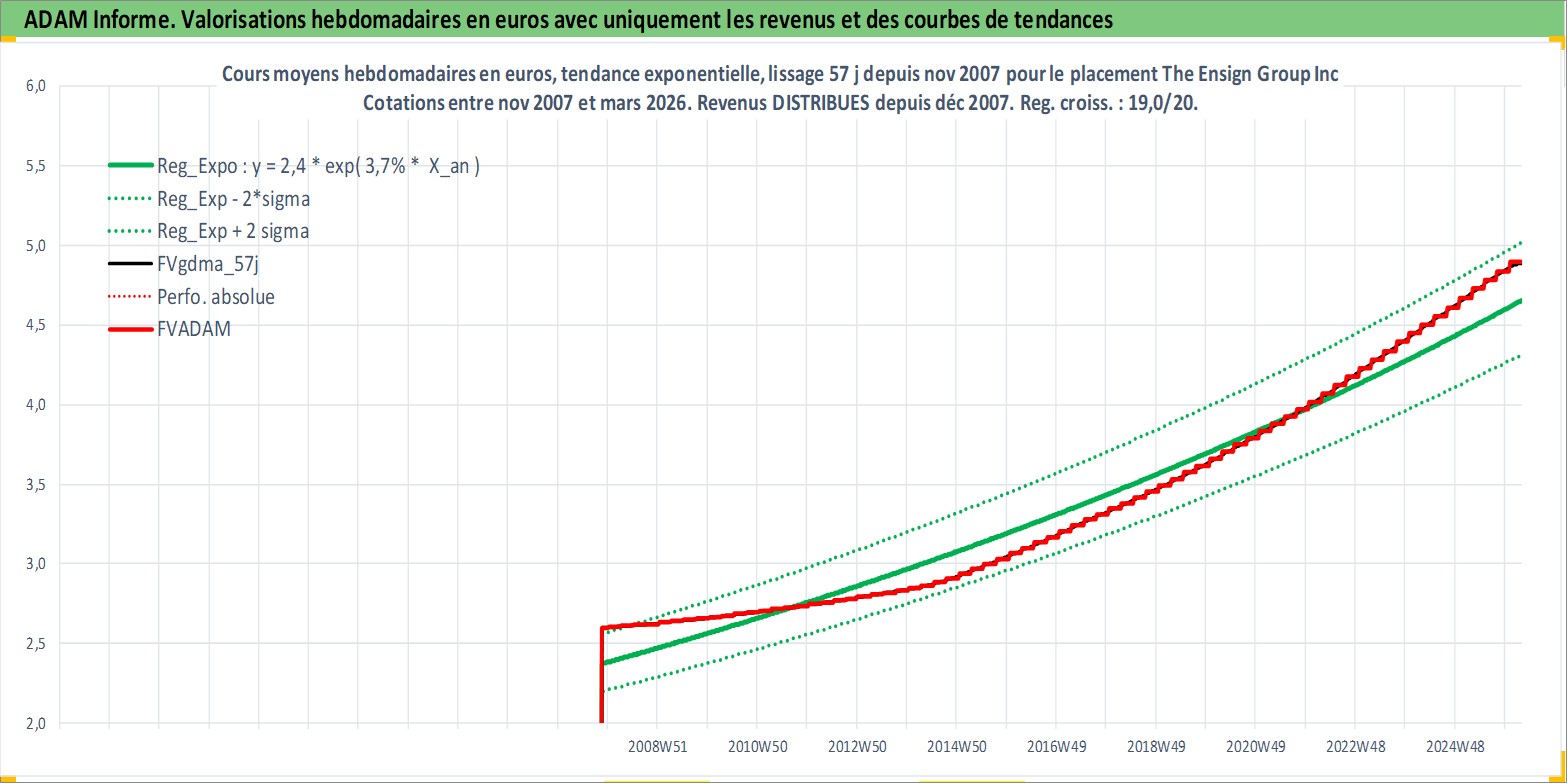Site dédié aux investisseursPage dédiée sur site financeAnalyse des valorisations hebdomadaires de l'action The Ensign Group Inc. Cet actif est cote en USD. Les valorisations sont en contrevaleur EURO et couvrent les semaines 2007W45 a 2026W13. Les revenus de cet actif financier sont pris en compte depuis la semaine 2007W52. La note ESG de cet actif n'est pas connue.