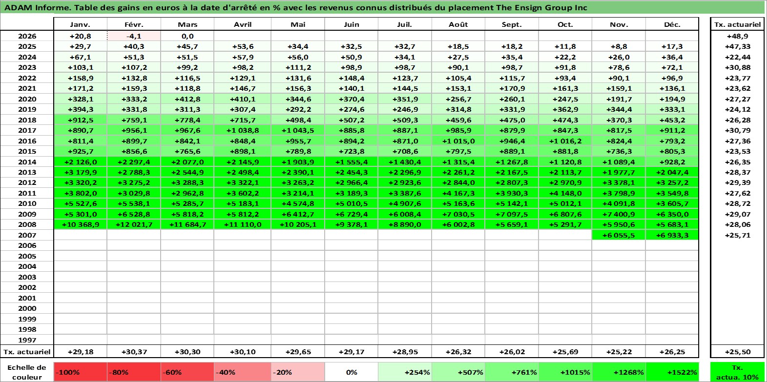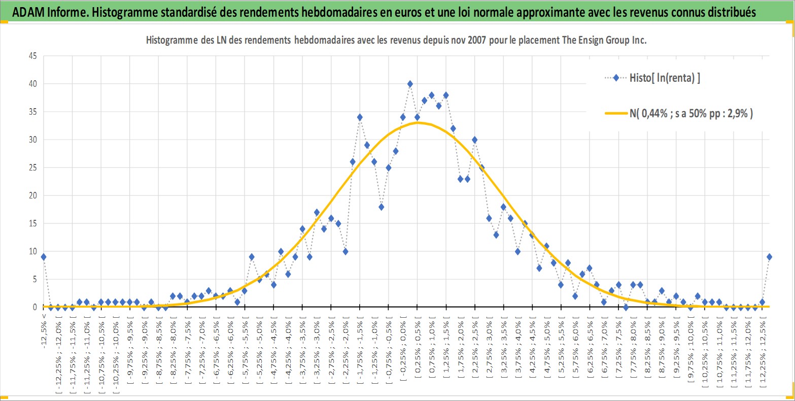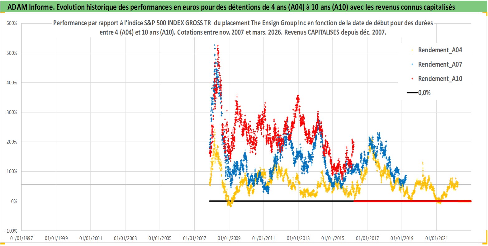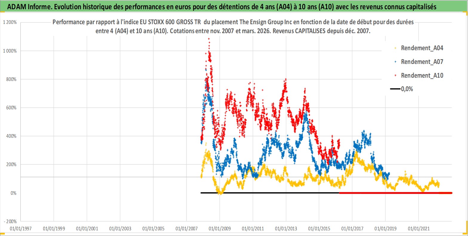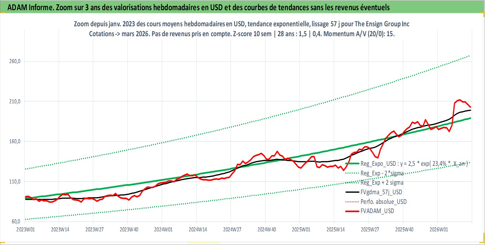 Site dédié aux investisseursPage dédiée sur site financeAnalyse des valorisations hebdomadaires de l'action The Ensign Group Inc. Cet actif est cote en USD. Les valorisations sont en contrevaleur EURO et couvrent les semaines 2007W45 a 2026W13. Les revenus de cet actif financier sont pris en compte depuis la semaine 2007W52. La note ESG de cet actif n'est pas connue.