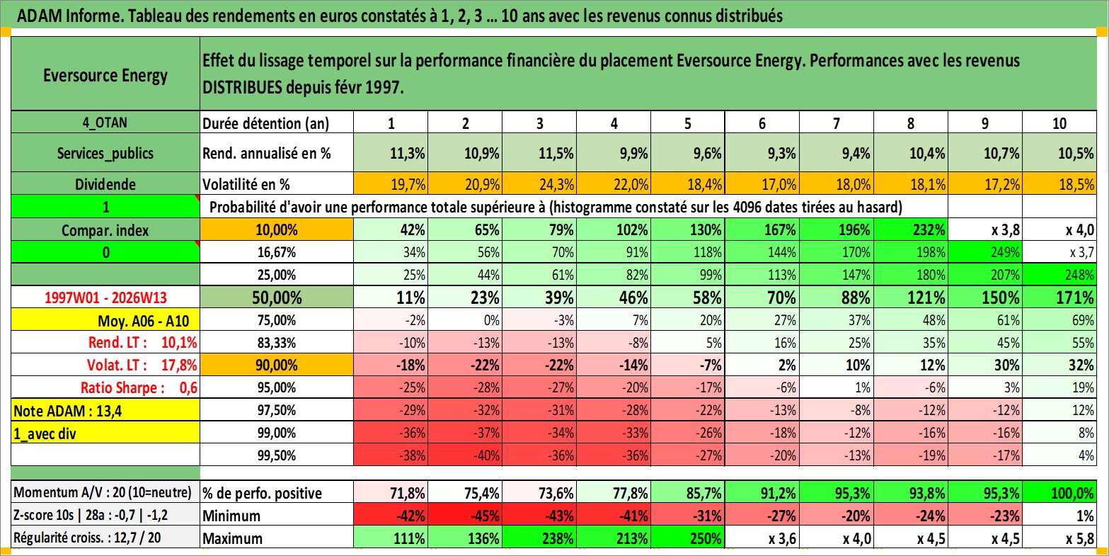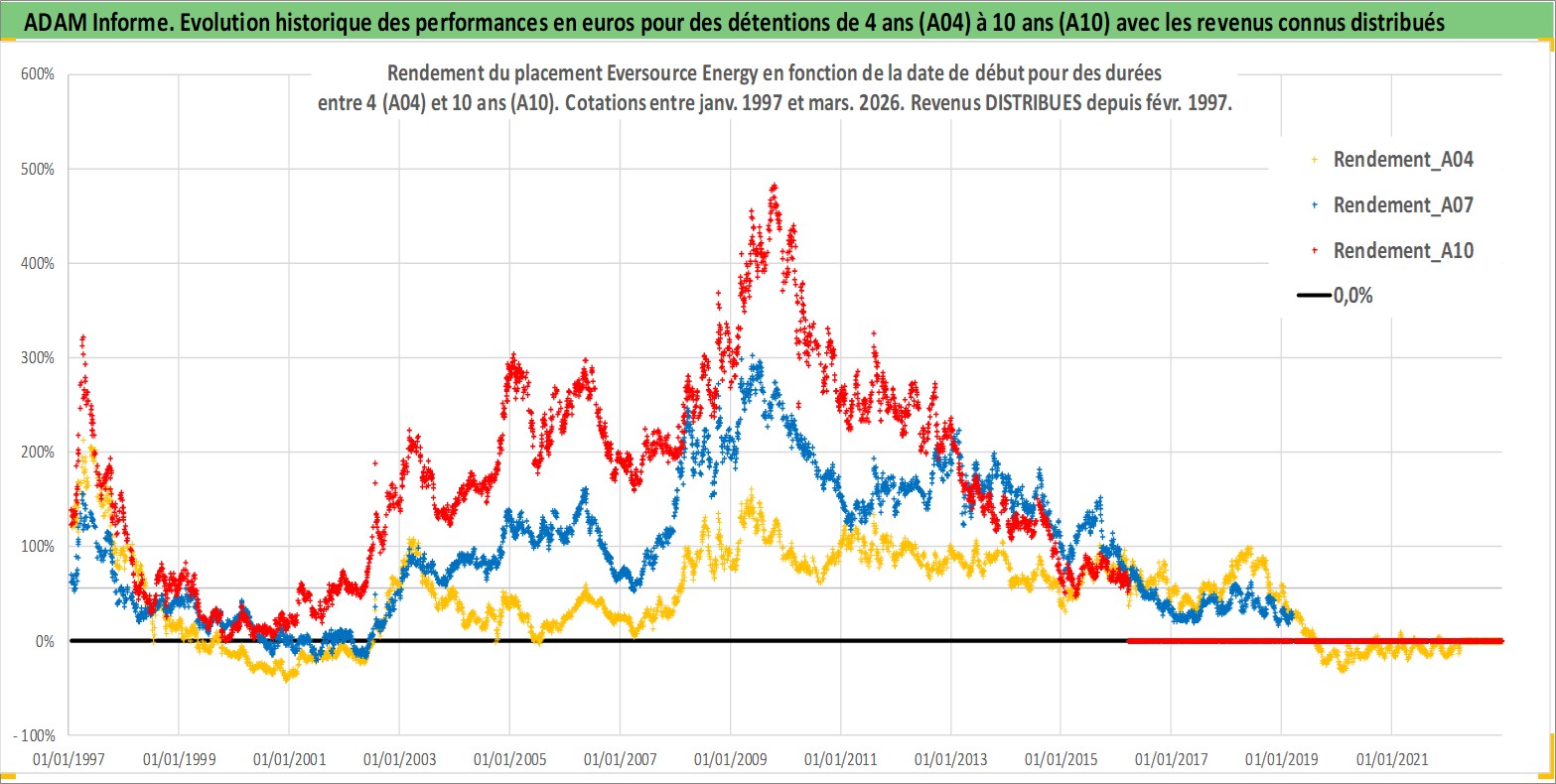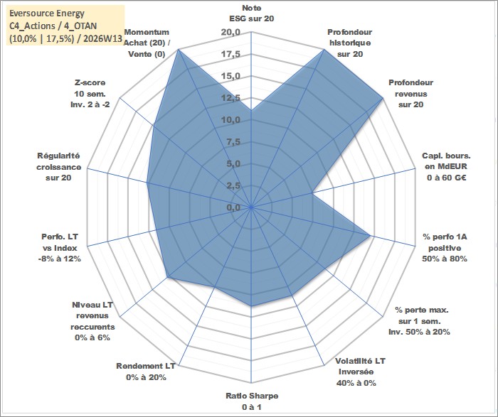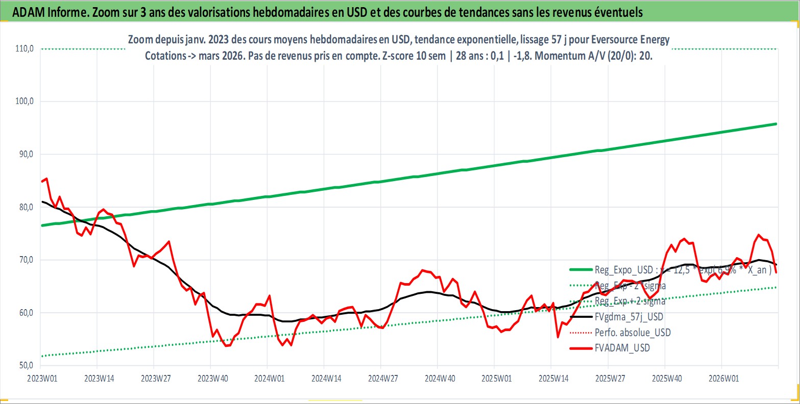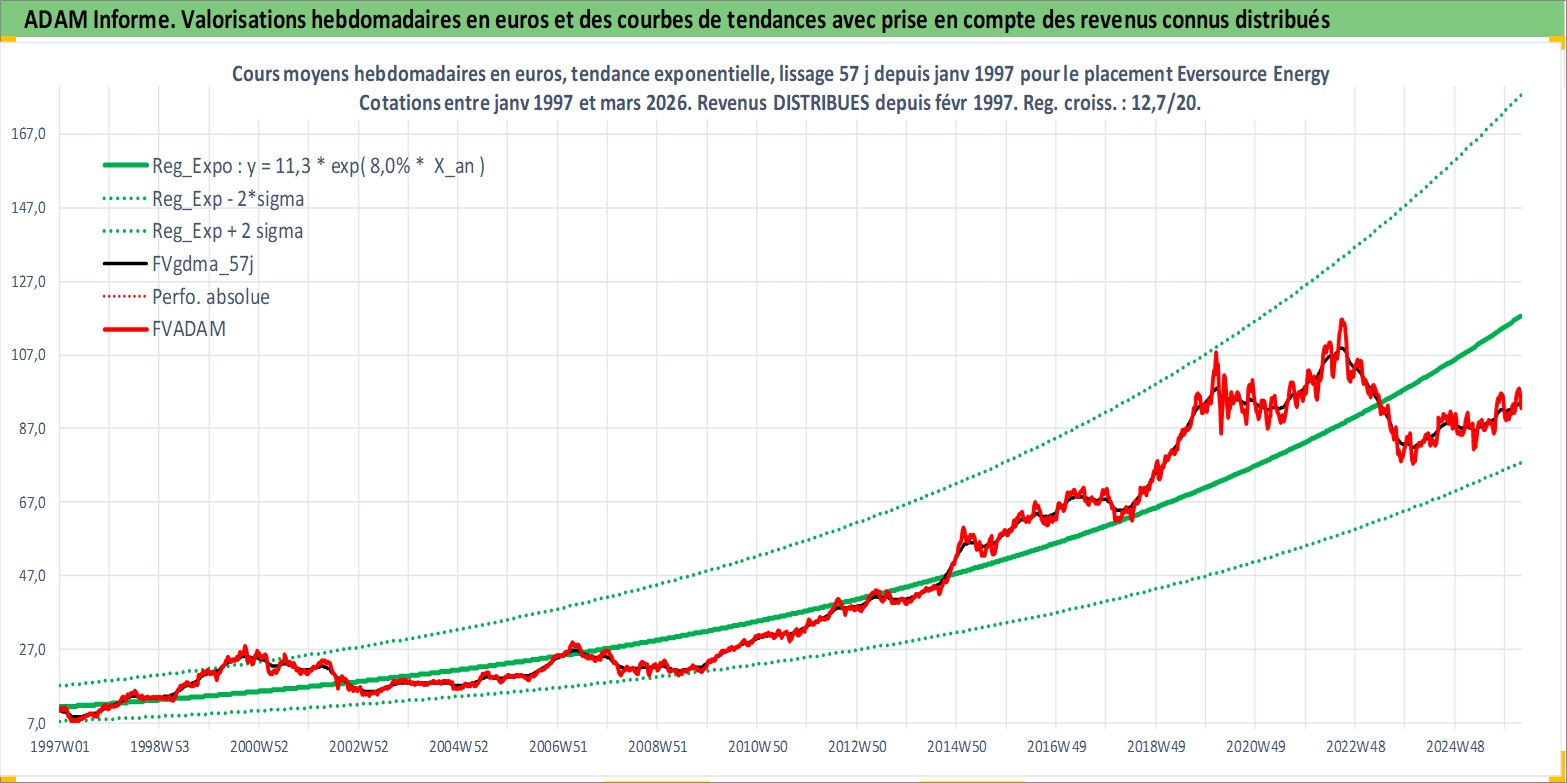 Site dédié aux investisseursPage dédiée sur site financeAnalyse des valorisations hebdomadaires de l'action Eversource Energy. Cet actif est cote en USD. Les valorisations sont en contrevaleur EURO et couvrent les semaines 1997W01 a 2026W13. Les revenus de cet actif financier sont pris en compte depuis la semaine 1997W09. La note globale ESG de cet actif est estimee a 11.0 (apres rebasage entre 0 et 20).