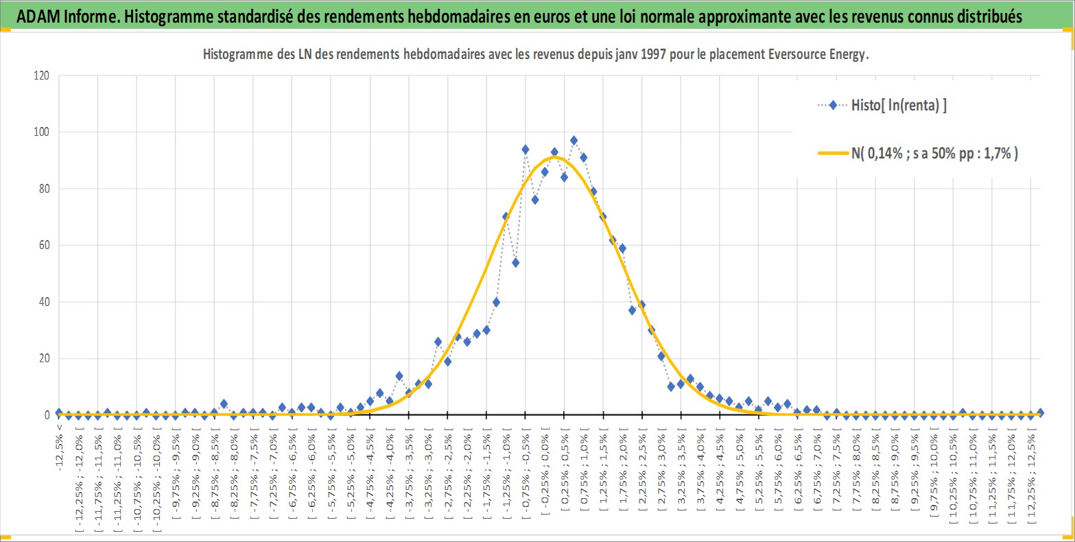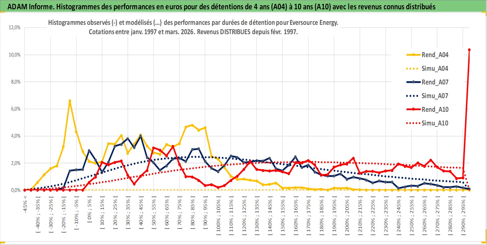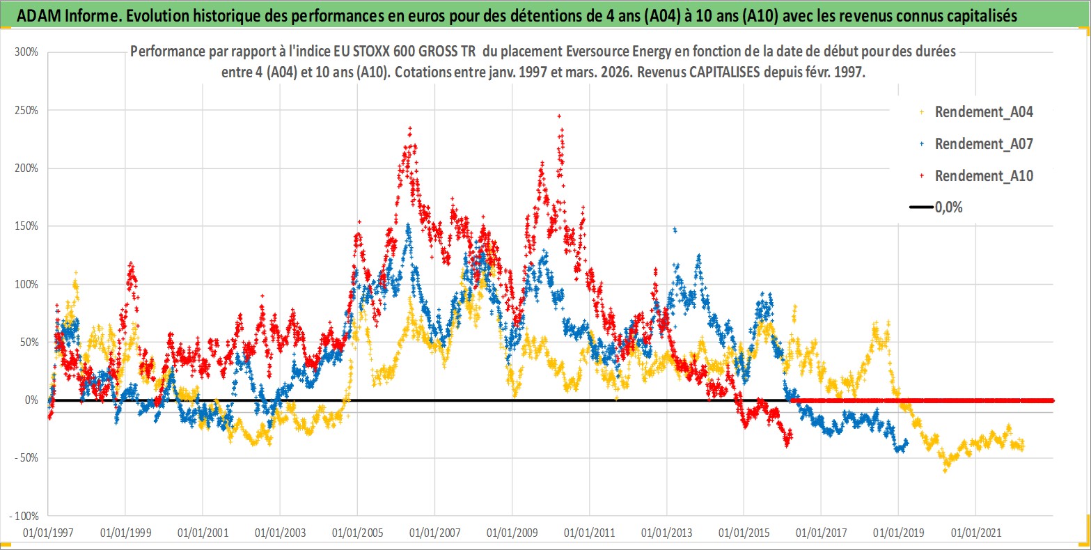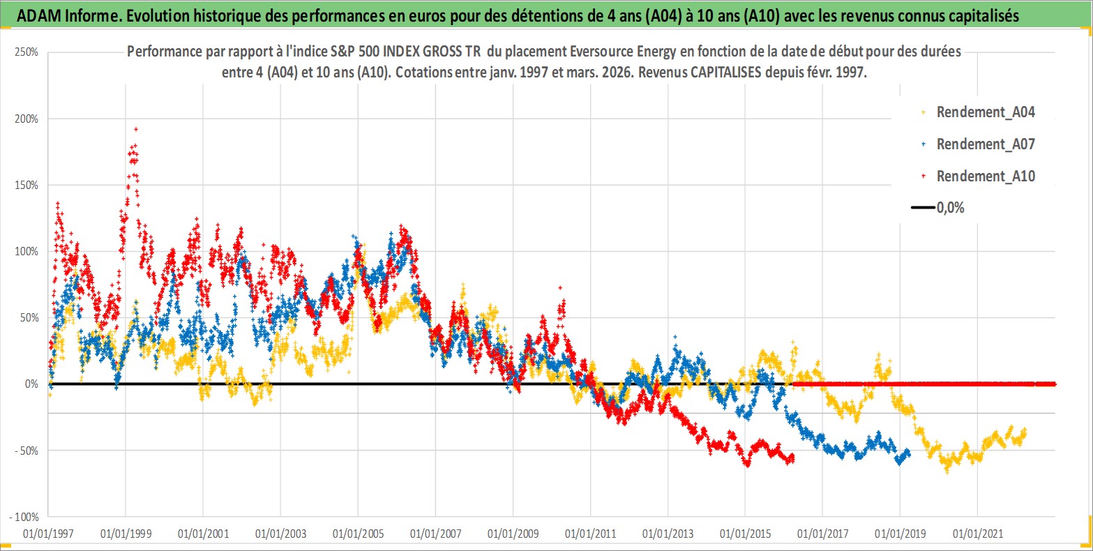Site dédié aux investisseursPage dédiée sur site financeAnalyse des valorisations hebdomadaires de l'action Eversource Energy. Cet actif est cote en USD. Les valorisations sont en contrevaleur EURO et couvrent les semaines 1997W01 a 2026W13. Les revenus de cet actif financier sont pris en compte depuis la semaine 1997W09. La note globale ESG de cet actif est estimee a 11.0 (apres rebasage entre 0 et 20).