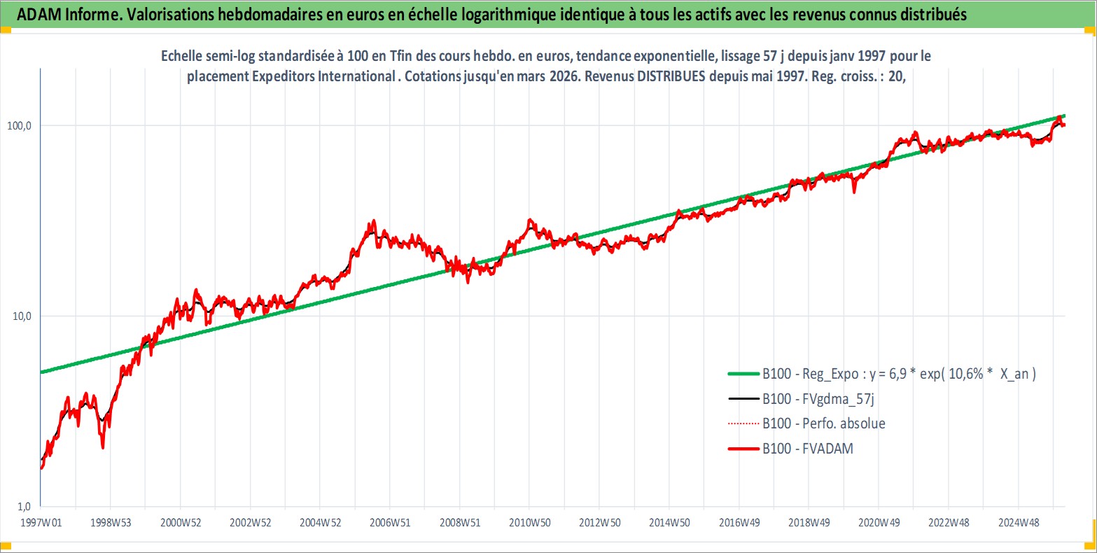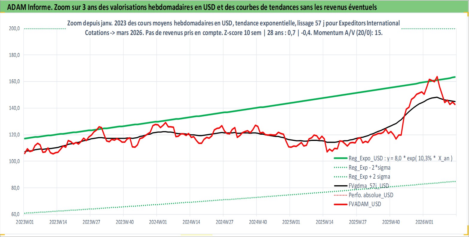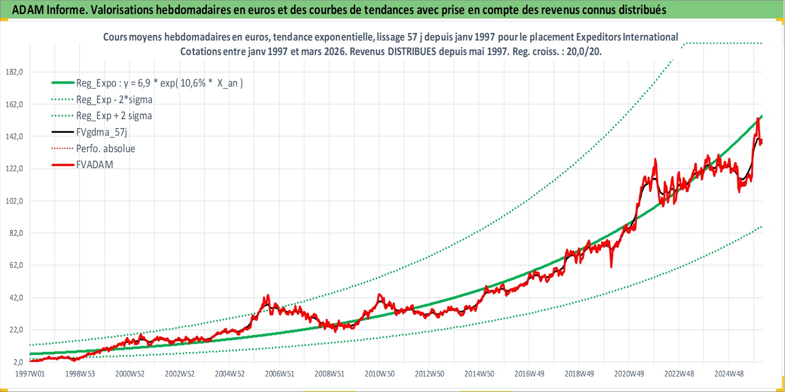 Site dédié aux investisseursPage dédiée sur site financeAnalyse des valorisations hebdomadaires de l'action Expeditors International of Washington I. Cet actif est cote en USD. Les valorisations sont en contrevaleur EURO et couvrent les semaines 1997W01 a 2026W13. Les revenus de cet actif financier sont pris en compte depuis la semaine 1997W22. La note globale ESG de cet actif est estimee a 13.0 (apres rebasage entre 0 et 20).
