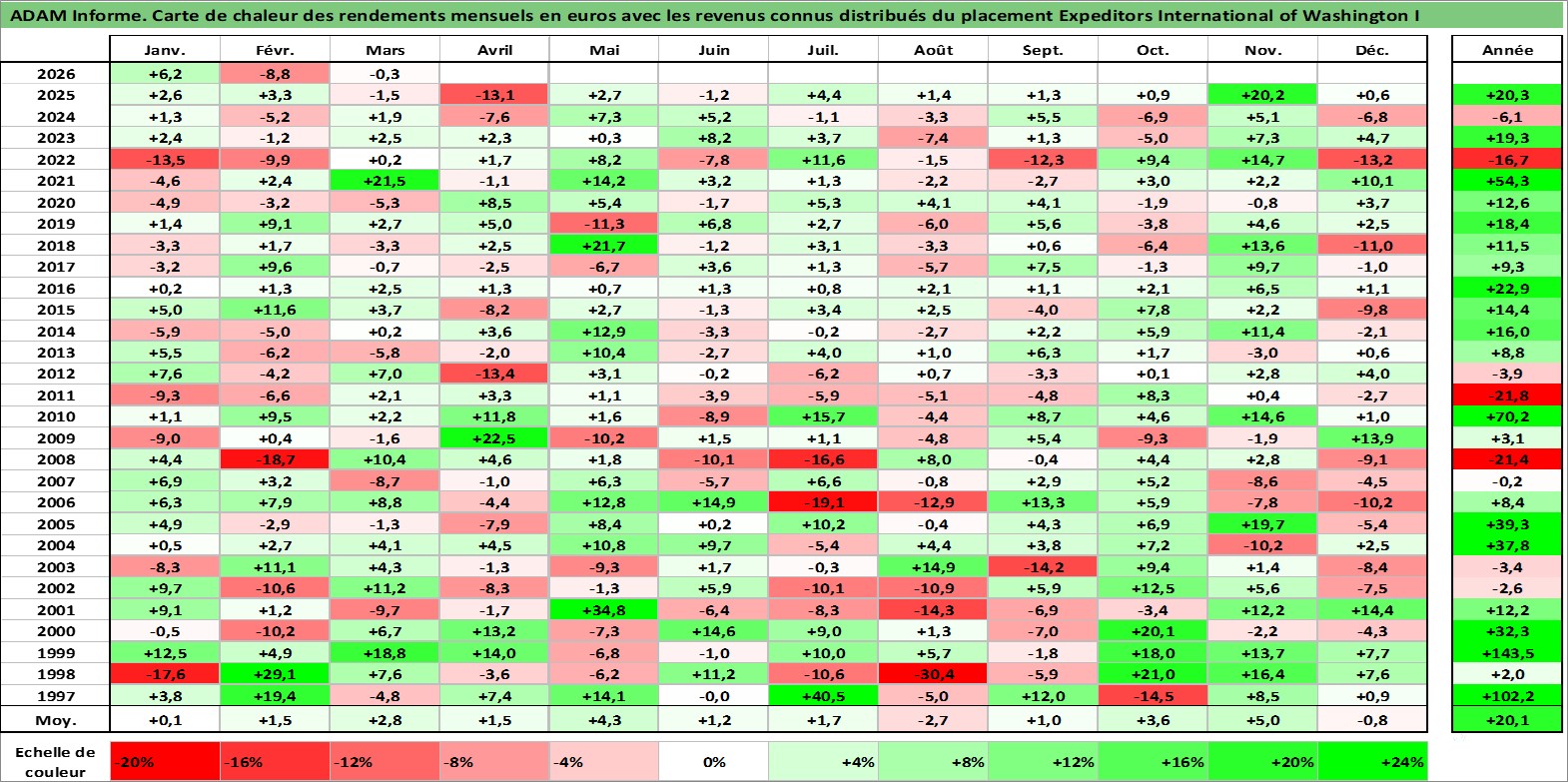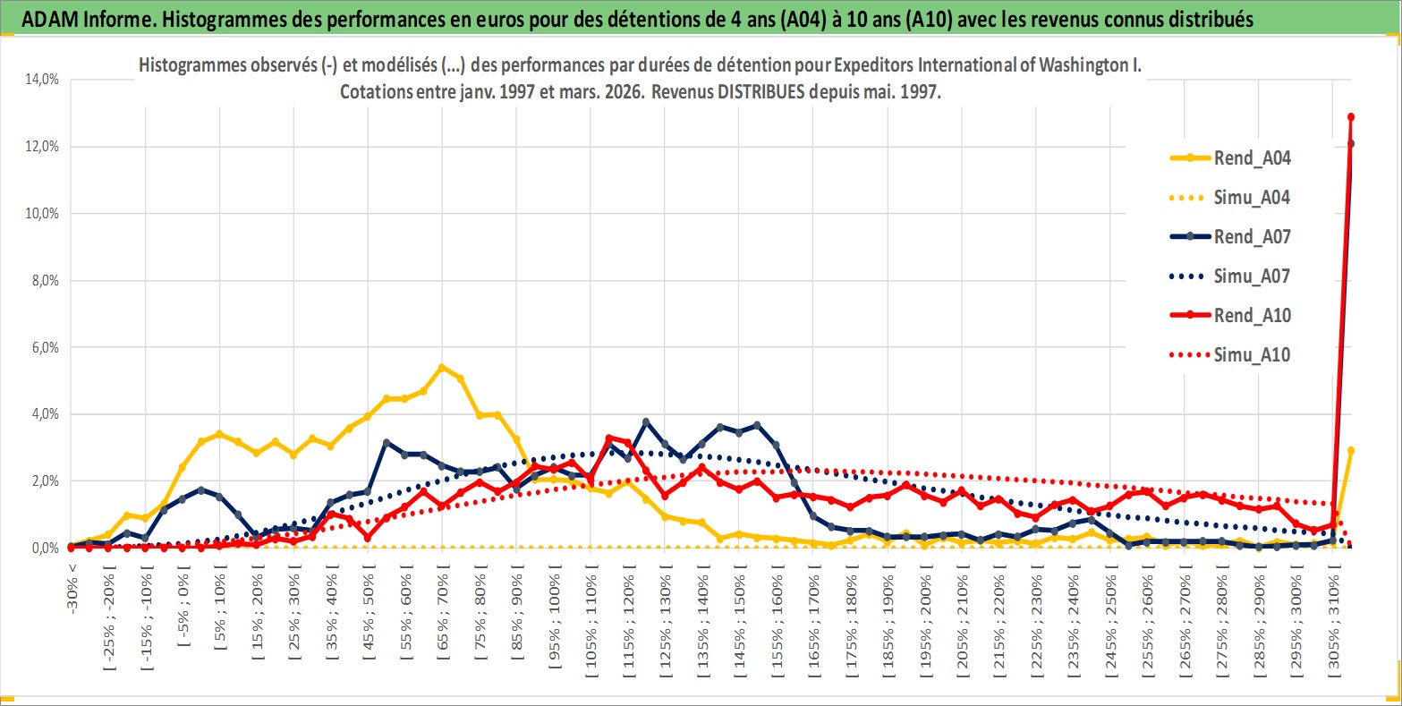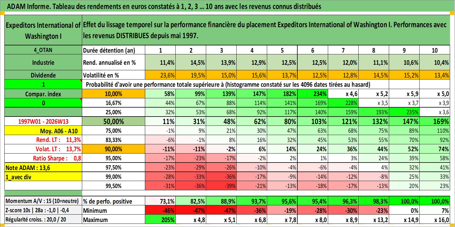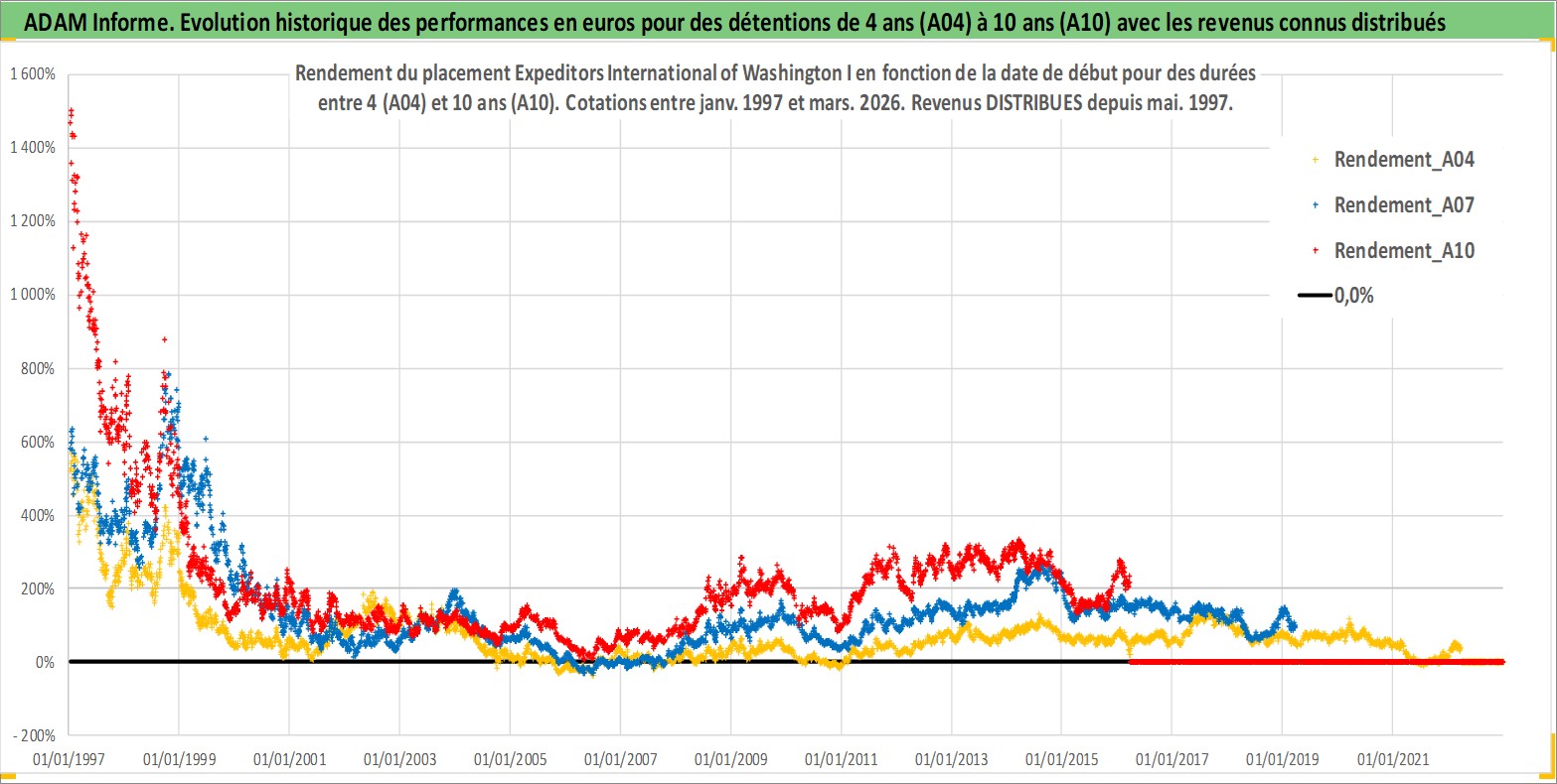 Site dédié aux investisseursPage dédiée sur site financeAnalyse des valorisations hebdomadaires de l'action Expeditors International of Washington I. Cet actif est cote en USD. Les valorisations sont en contrevaleur EURO et couvrent les semaines 1997W01 a 2026W13. Les revenus de cet actif financier sont pris en compte depuis la semaine 1997W22. La note globale ESG de cet actif est estimee a 13.0 (apres rebasage entre 0 et 20).