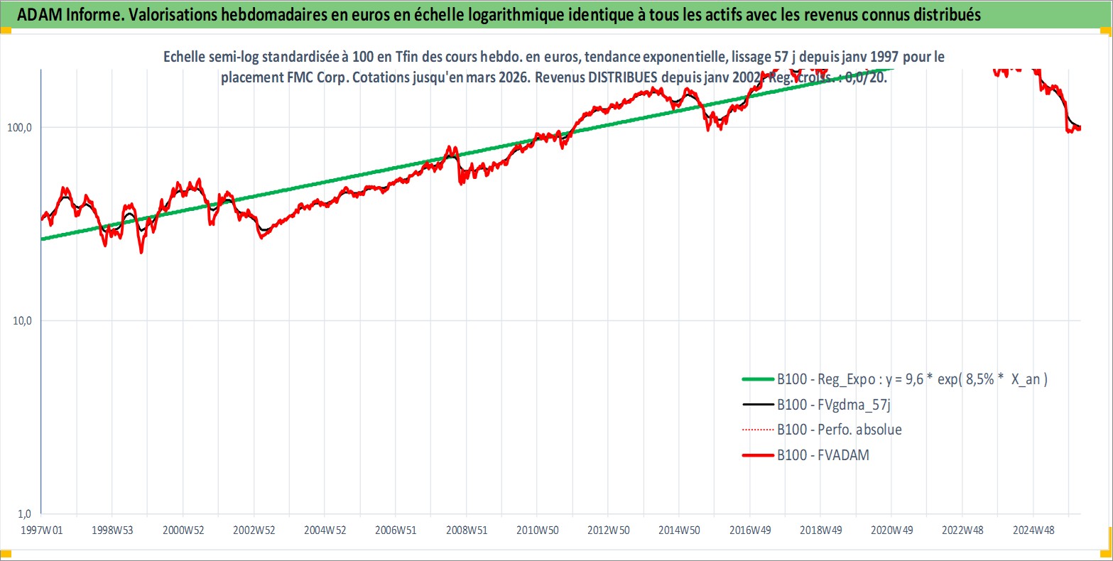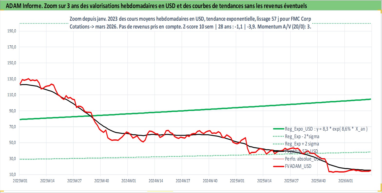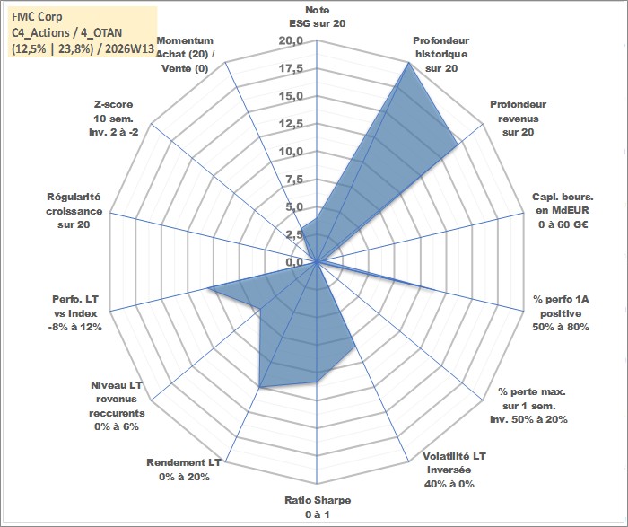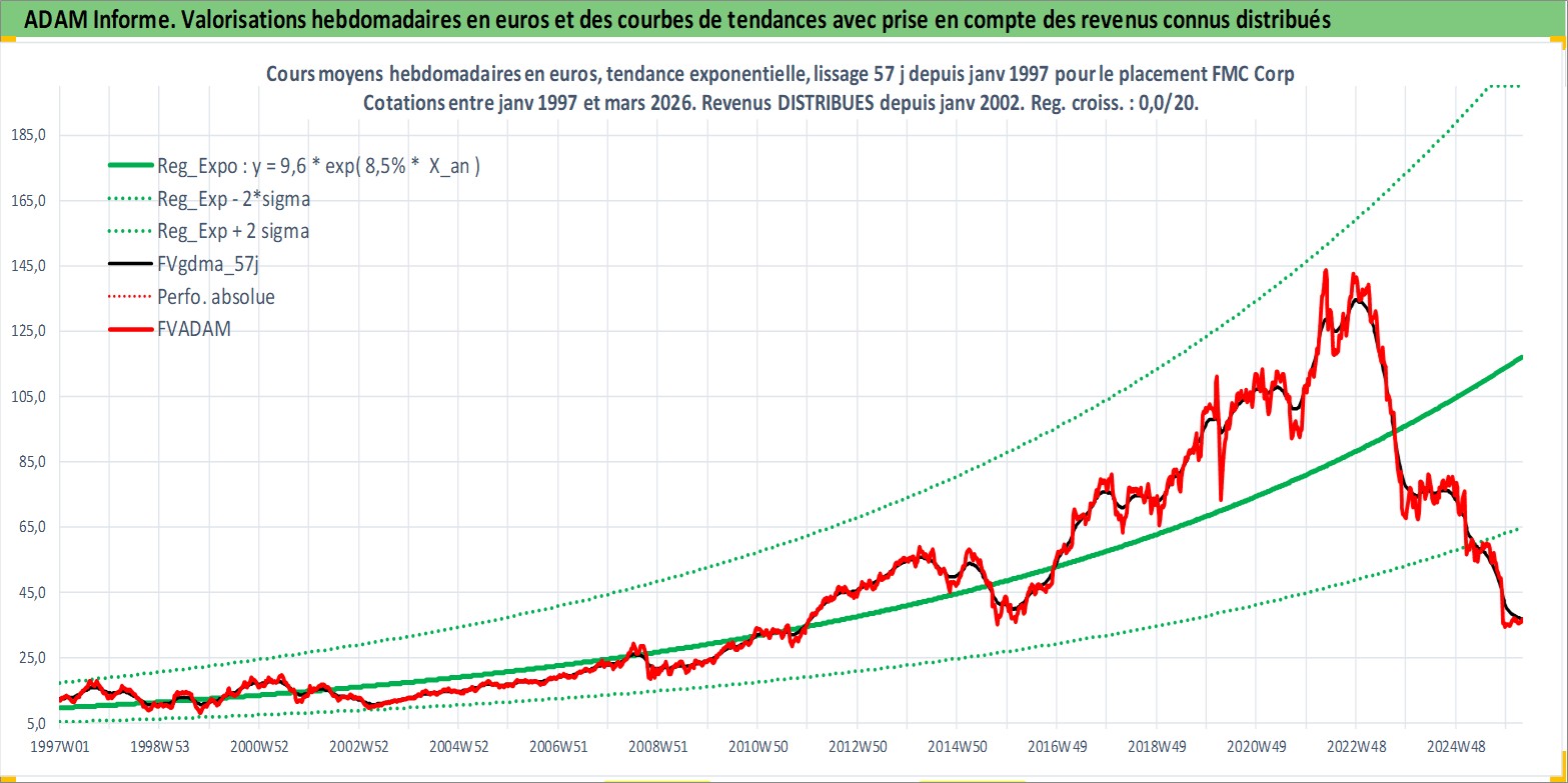 Site dédié aux investisseursPage dédiée sur site financeAnalyse des valorisations hebdomadaires de l'action FMC Corp. Cet actif est cote en USD. Les valorisations sont en contrevaleur EURO et couvrent les semaines 1997W01 a 2026W13. Les revenus de cet actif financier sont pris en compte depuis la semaine 2002W01. La note globale ESG de cet actif est estimee a 4.0 (apres rebasage entre 0 et 20).