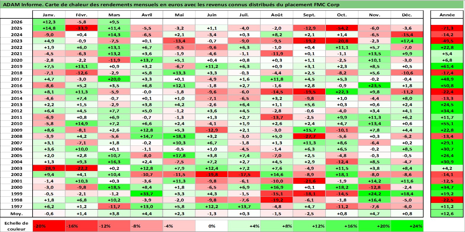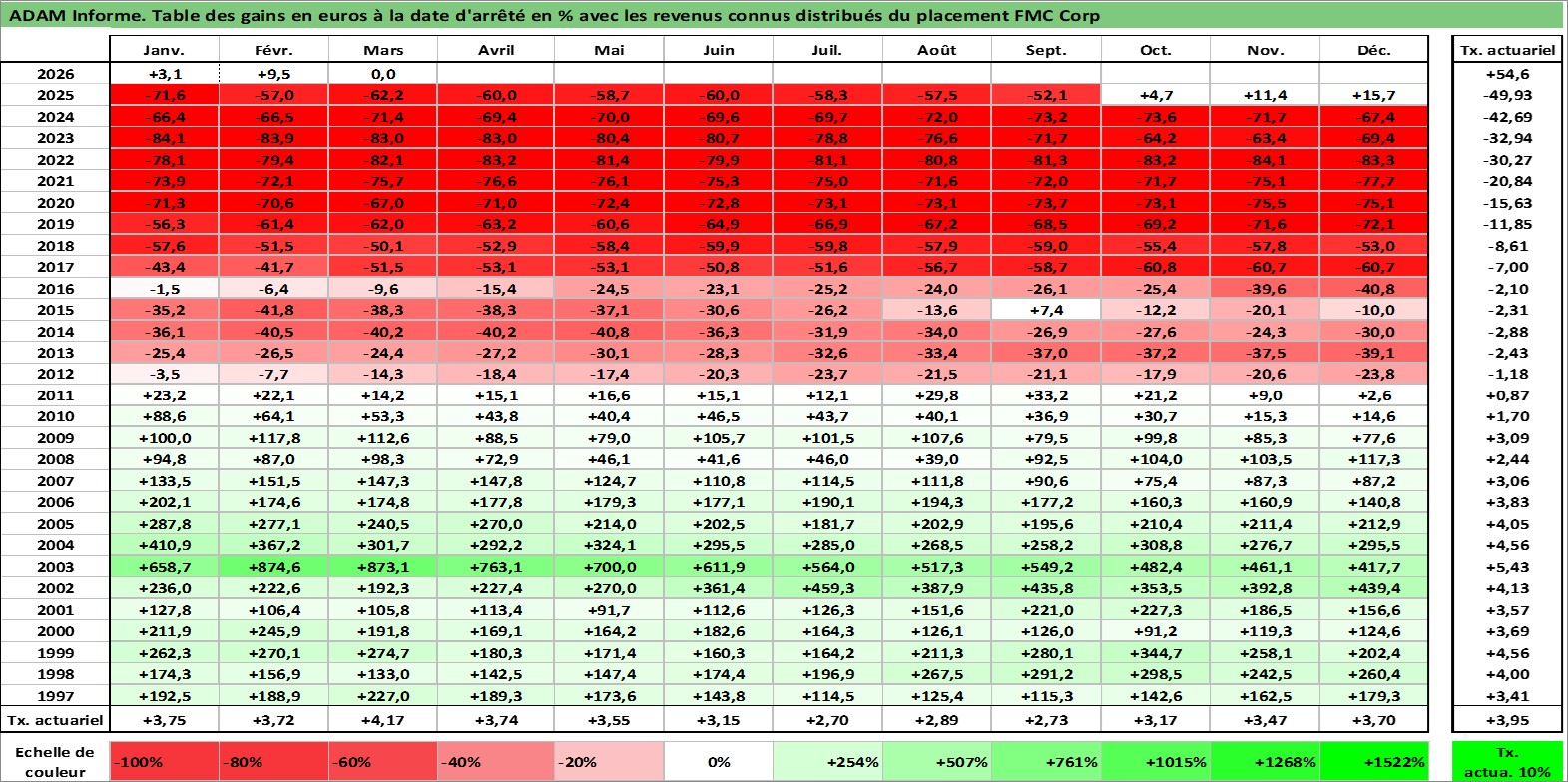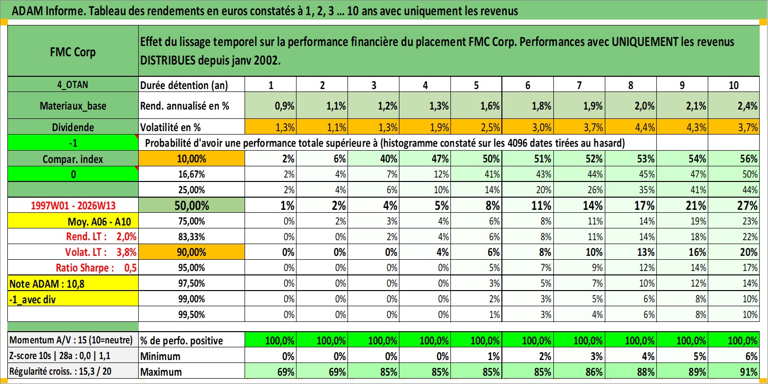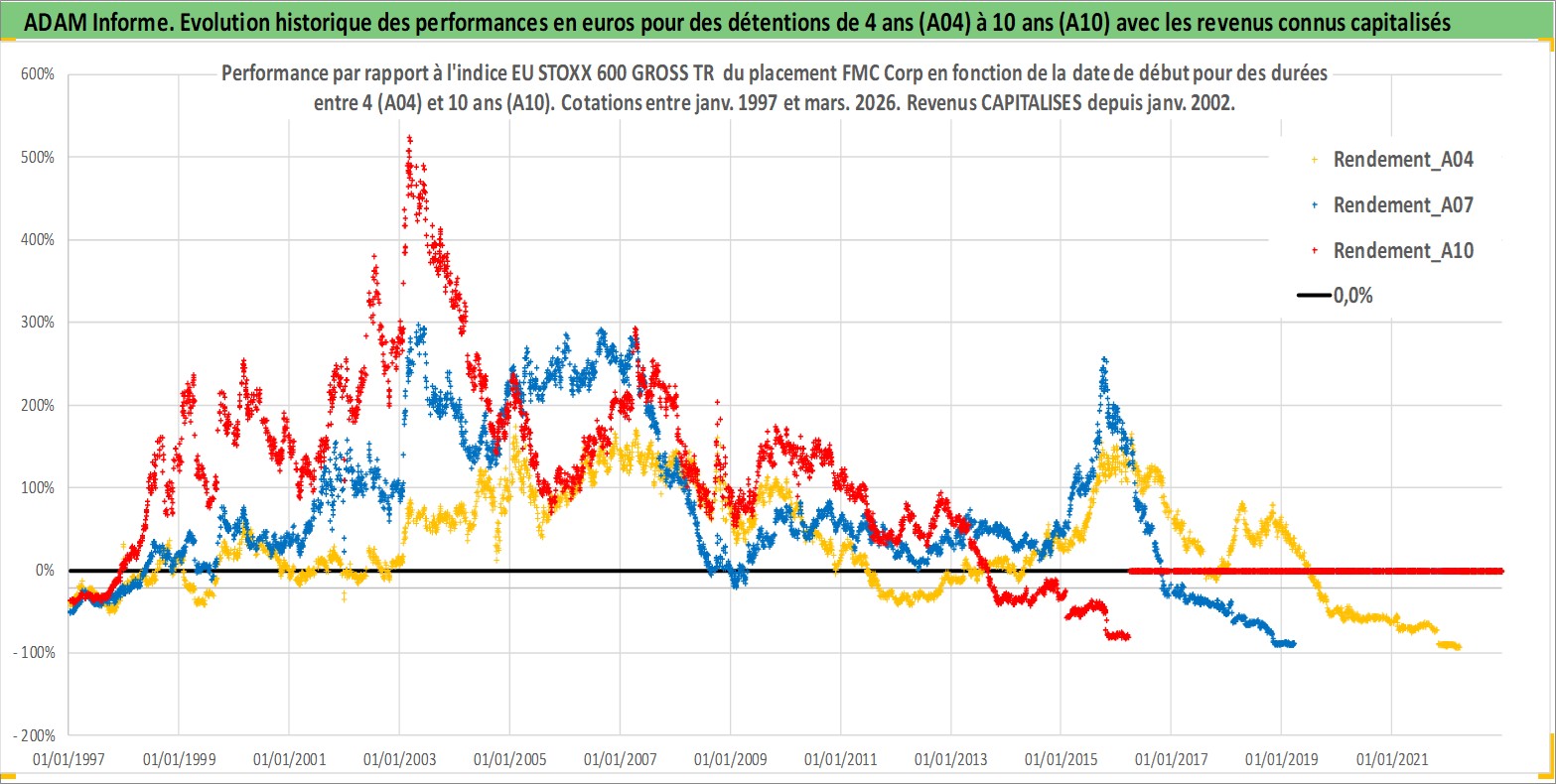 Site dédié aux investisseursPage dédiée sur site financeAnalyse des valorisations hebdomadaires de l'action FMC Corp. Cet actif est cote en USD. Les valorisations sont en contrevaleur EURO et couvrent les semaines 1997W01 a 2026W13. Les revenus de cet actif financier sont pris en compte depuis la semaine 2002W01. La note globale ESG de cet actif est estimee a 4.0 (apres rebasage entre 0 et 20).