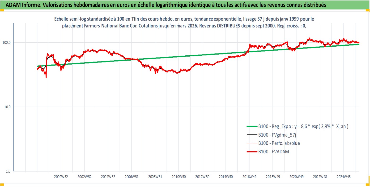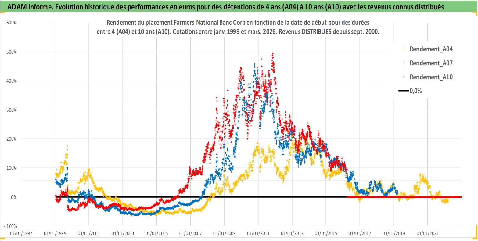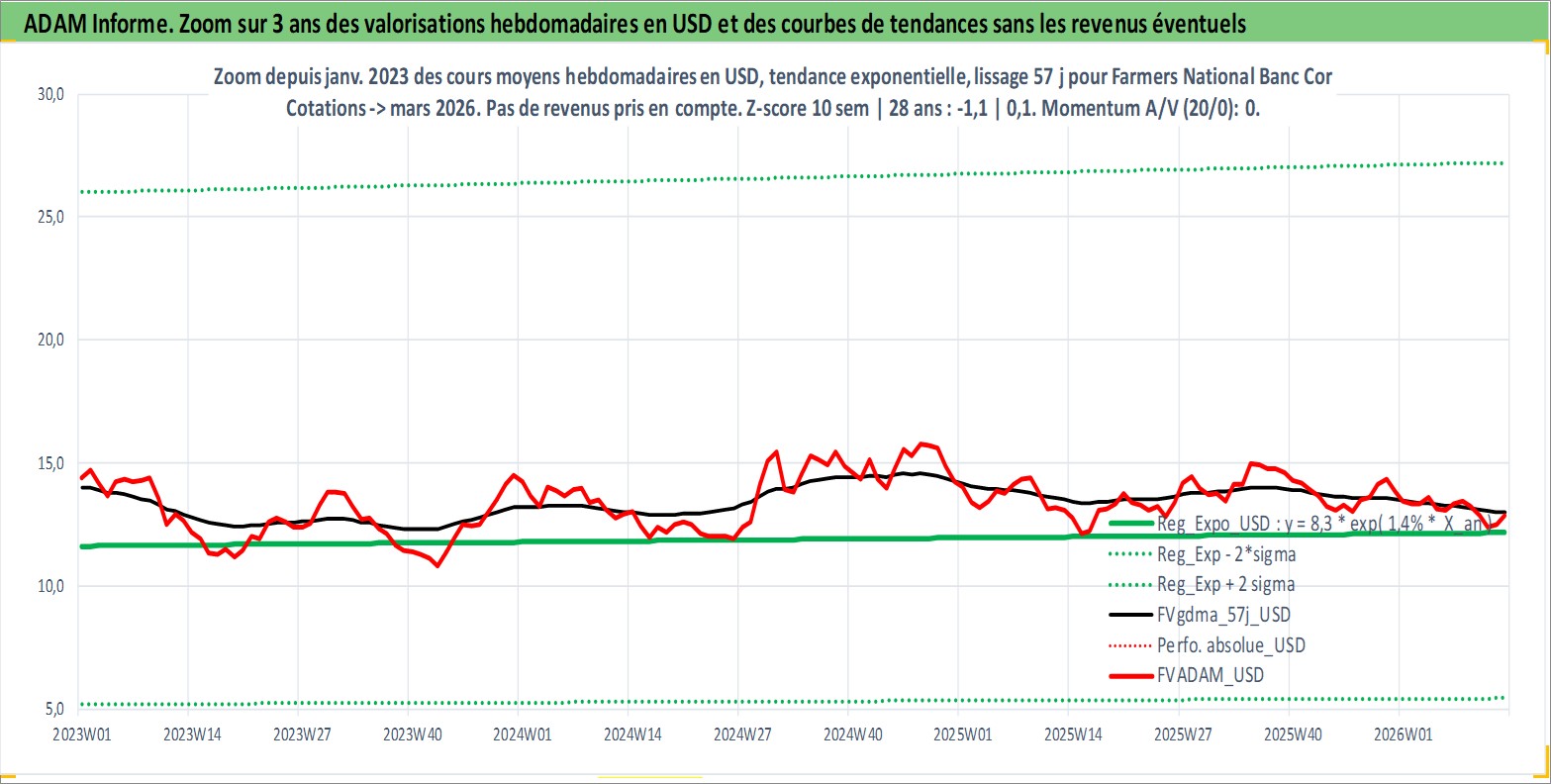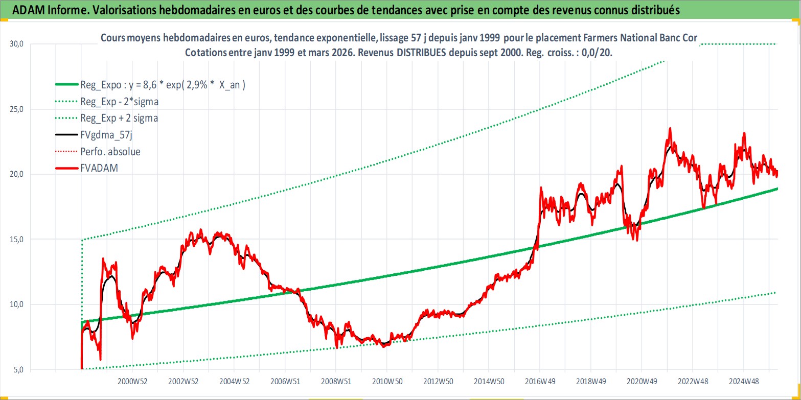 Site dédié aux investisseursPage dédiée sur site financeAnalyse des valorisations hebdomadaires de l'action Farmers National Banc Corp. Cet actif est cote en USD. Les valorisations sont en contrevaleur EURO et couvrent les semaines 1999W01 a 2026W13. Les revenus de cet actif financier sont pris en compte depuis la semaine 2000W36. La note ESG de cet actif n'est pas connue.