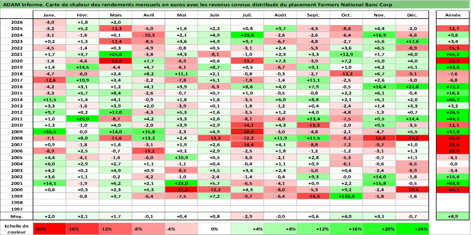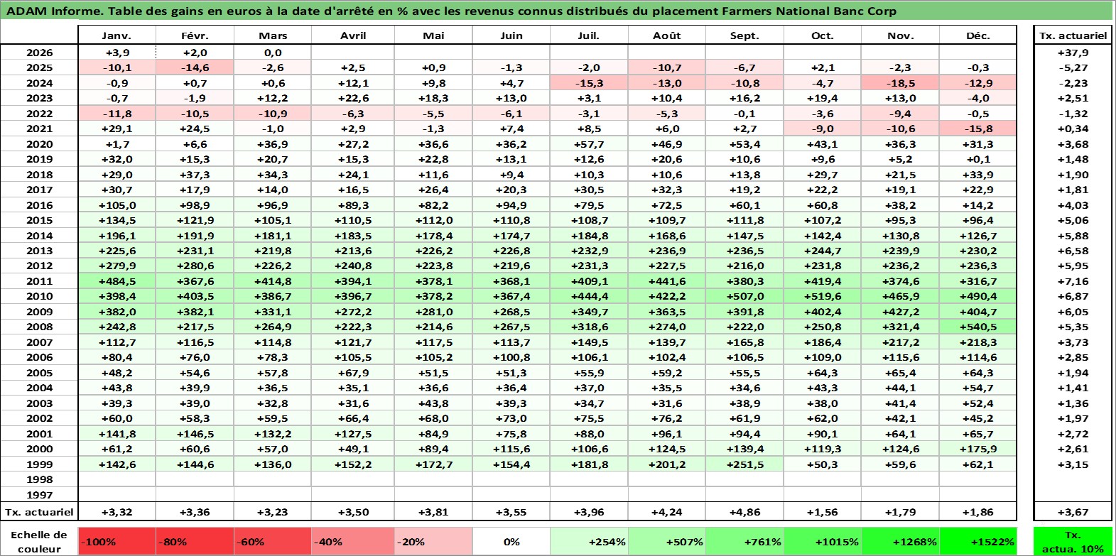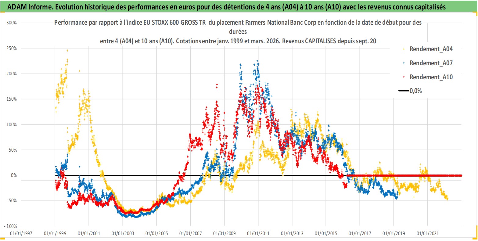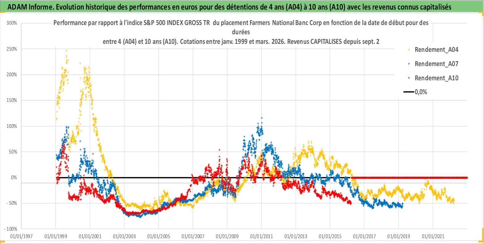 Site dédié aux investisseursPage dédiée sur site financeAnalyse des valorisations hebdomadaires de l'action Farmers National Banc Corp. Cet actif est cote en USD. Les valorisations sont en contrevaleur EURO et couvrent les semaines 1999W01 a 2026W13. Les revenus de cet actif financier sont pris en compte depuis la semaine 2000W36. La note ESG de cet actif n'est pas connue.