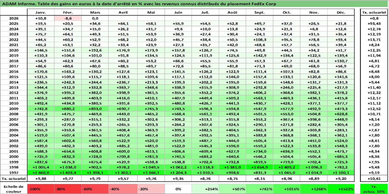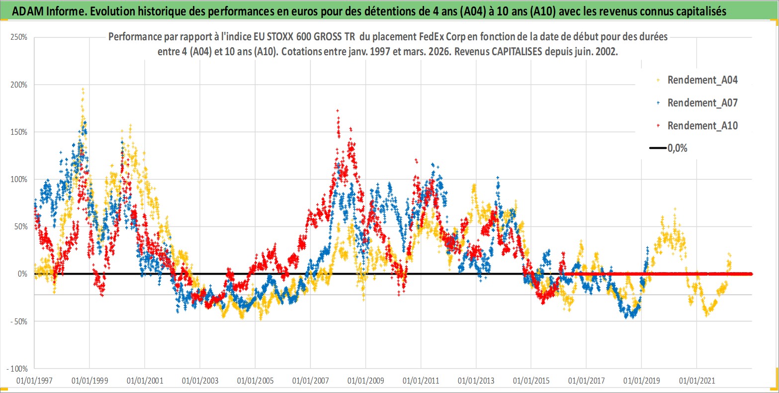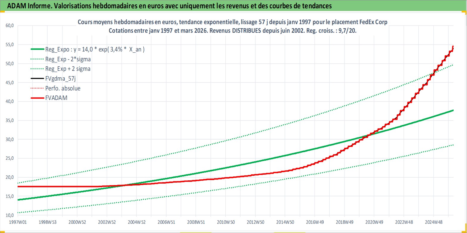 Site dédié aux investisseursPage dédiée sur site financeAnalyse des valorisations hebdomadaires de l'action FedEx Corp. Cet actif est cote en USD. Les valorisations sont en contrevaleur EURO et couvrent les semaines 1997W01 a 2026W13. Les revenus de cet actif financier sont pris en compte depuis la semaine 2002W24. La note globale ESG de cet actif est estimee a 10.0 (apres rebasage entre 0 et 20).