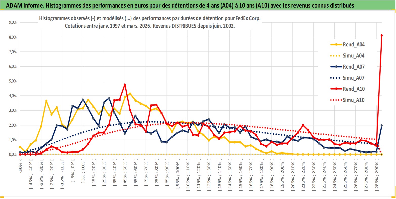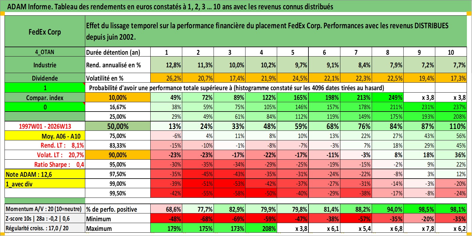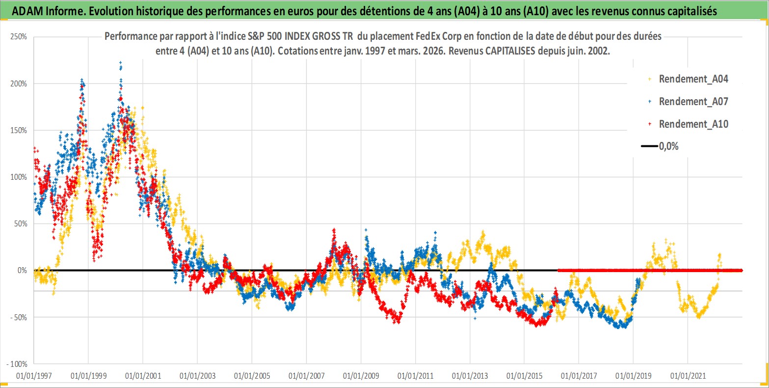 Site dédié aux investisseursPage dédiée sur site financeAnalyse des valorisations hebdomadaires de l'action FedEx Corp. Cet actif est cote en USD. Les valorisations sont en contrevaleur EURO et couvrent les semaines 1997W01 a 2026W13. Les revenus de cet actif financier sont pris en compte depuis la semaine 2002W24. La note globale ESG de cet actif est estimee a 10.0 (apres rebasage entre 0 et 20).