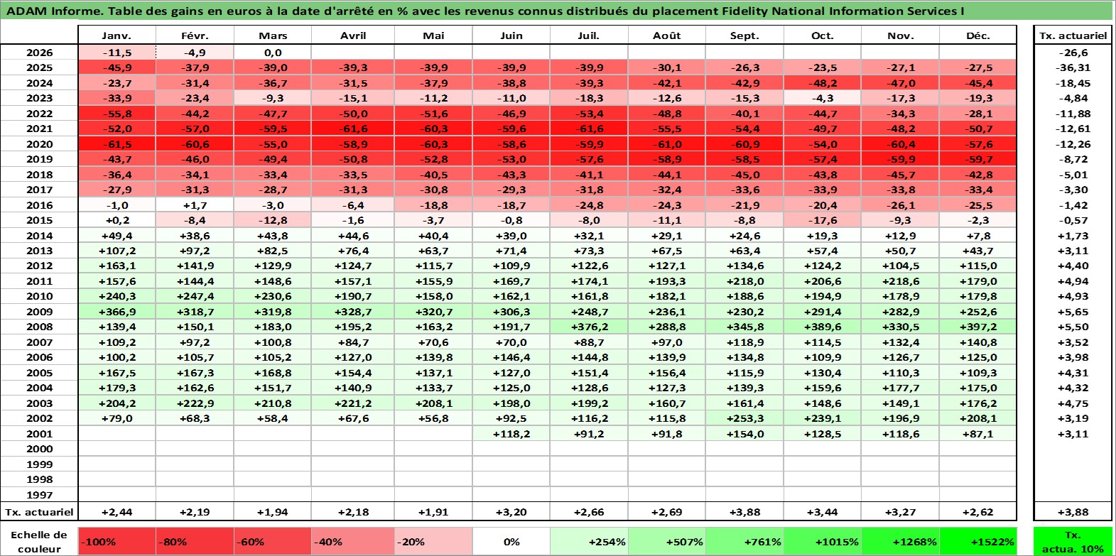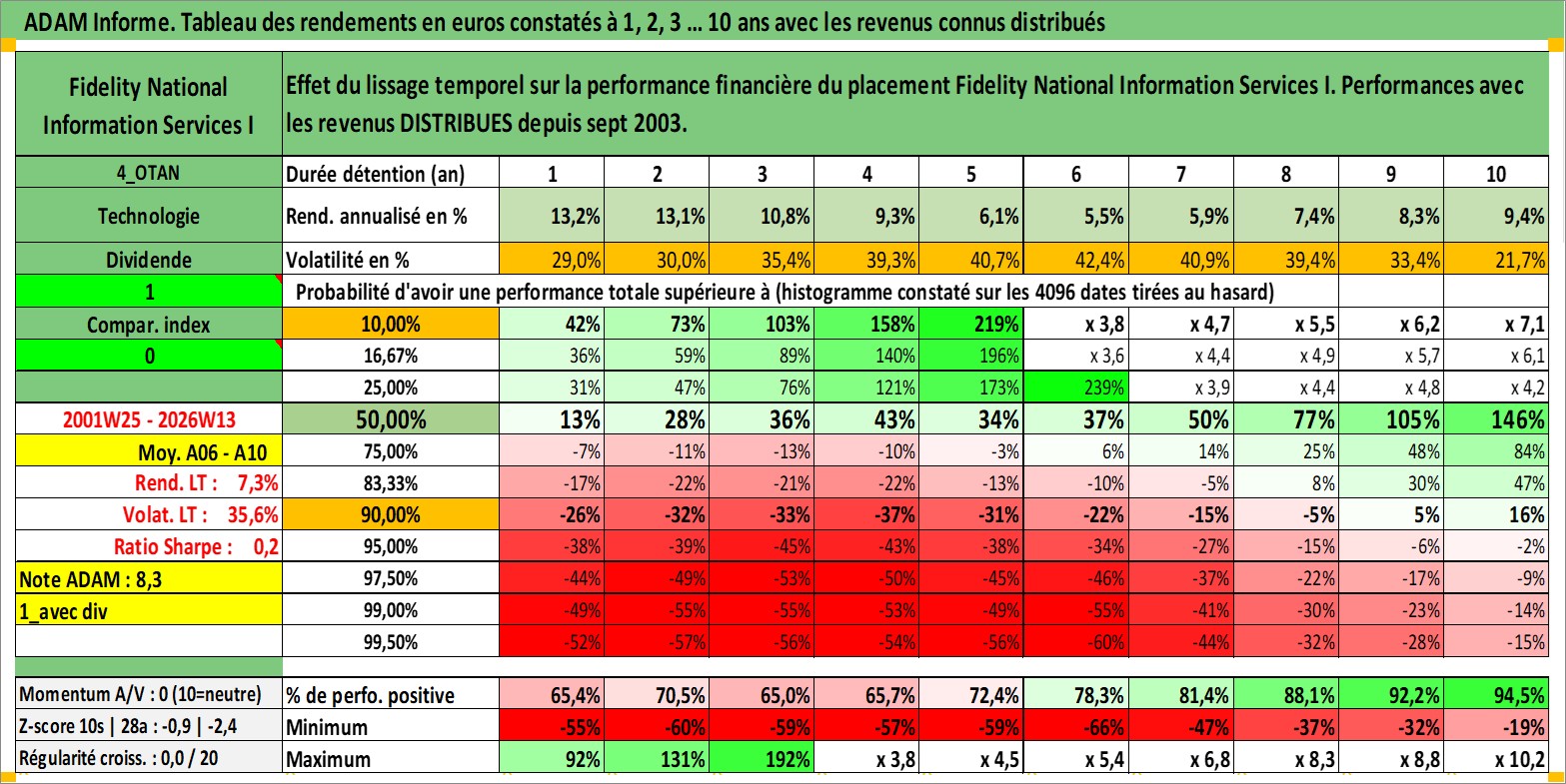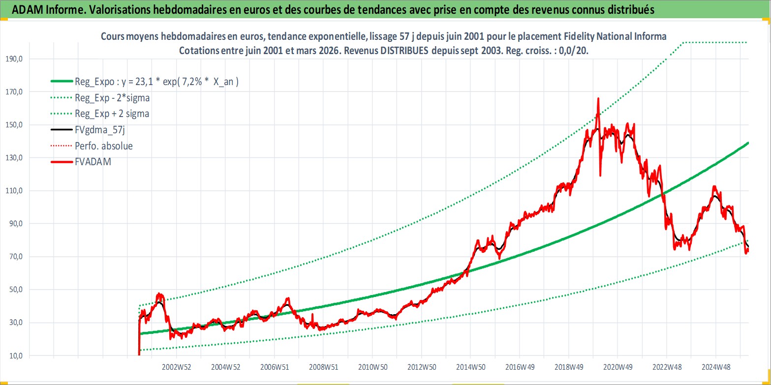 Site dédié aux investisseursPage dédiée sur site financeAnalyse des valorisations hebdomadaires de l'action Fidelity National Information Services I. Cet actif est cote en USD. Les valorisations sont en contrevaleur EURO et couvrent les semaines 2001W25 a 2026W13. Les revenus de cet actif financier sont pris en compte depuis la semaine 2003W40. La note globale ESG de cet actif est estimee a 11.0 (apres rebasage entre 0 et 20).