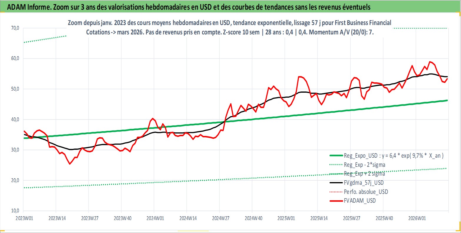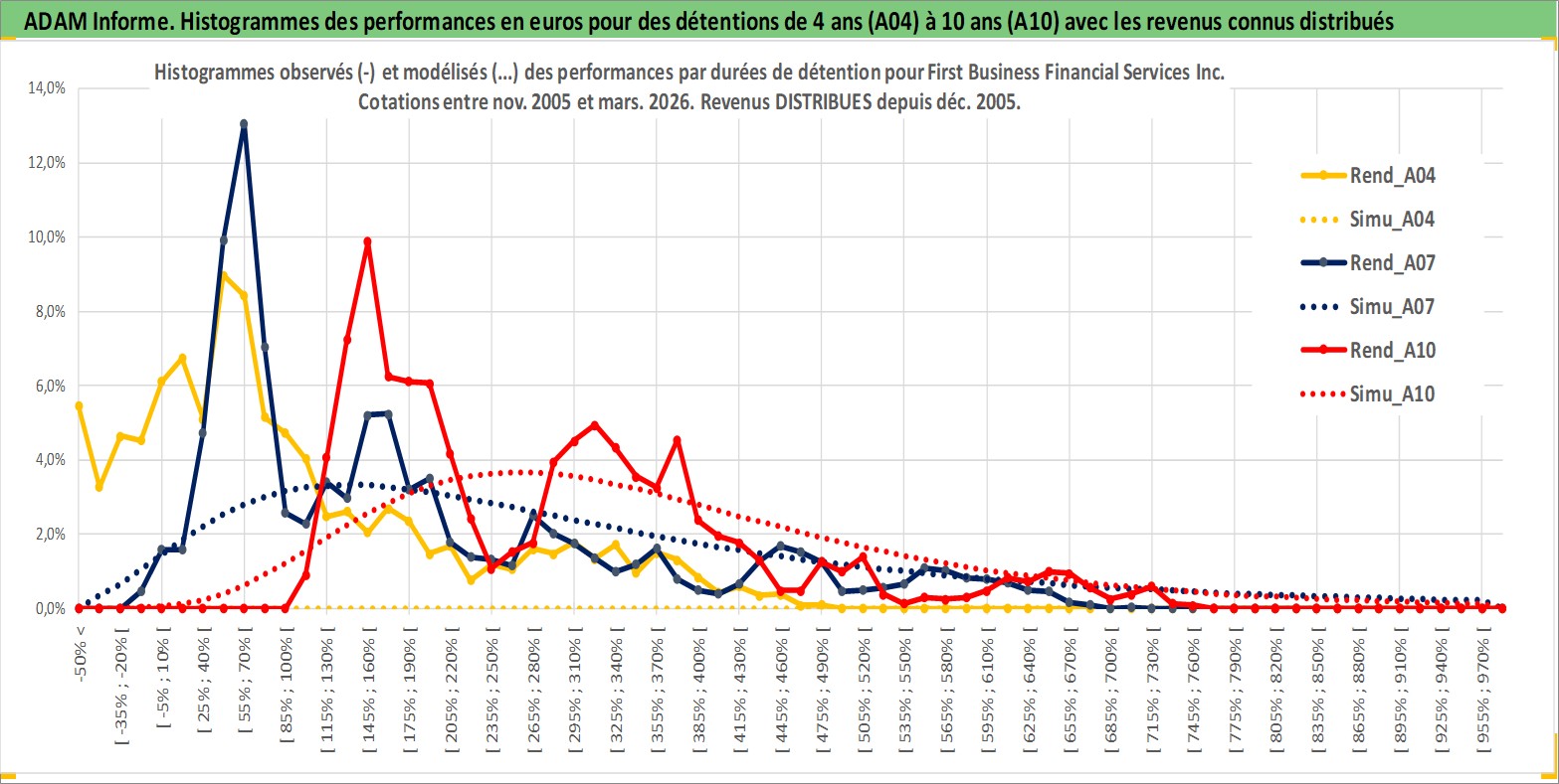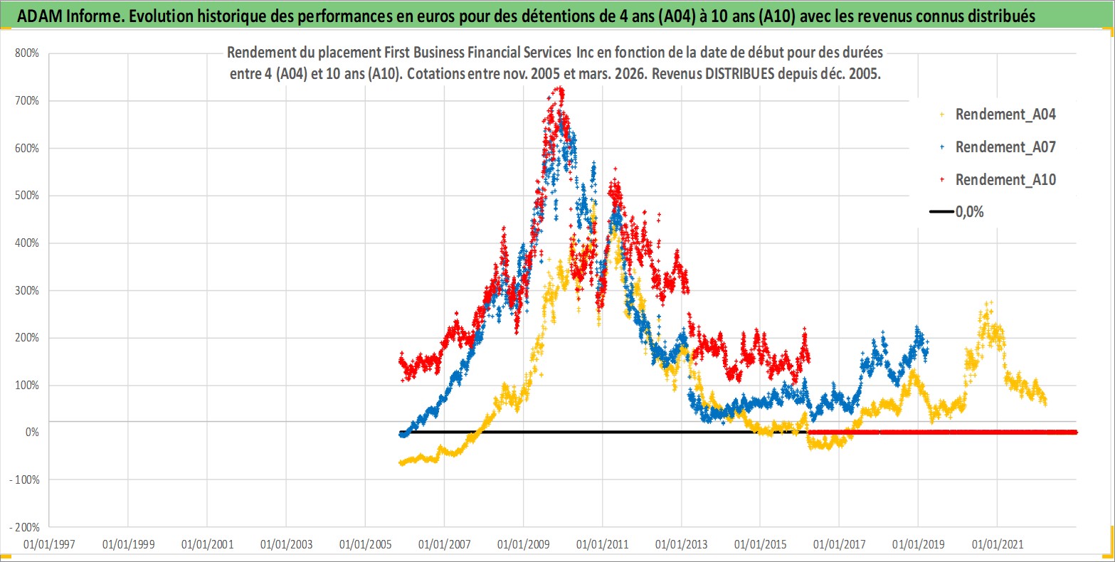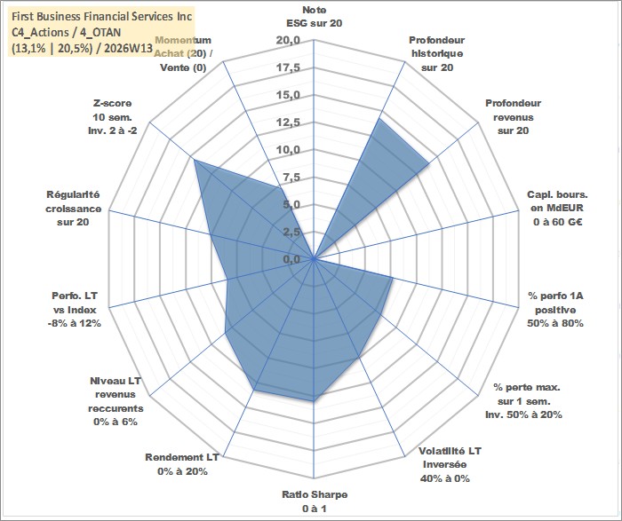 Site dédié aux investisseursPage dédiée sur site financeAnalyse des valorisations hebdomadaires de l'action First Business Financial Services Inc. Cet actif est cote en USD. Les valorisations sont en contrevaleur EURO et couvrent les semaines 2005W45 a 2026W13. Les revenus de cet actif financier sont pris en compte depuis la semaine 2005W52. La note ESG de cet actif n'est pas connue.