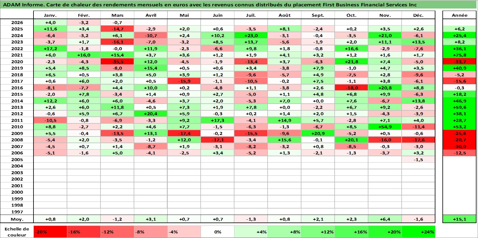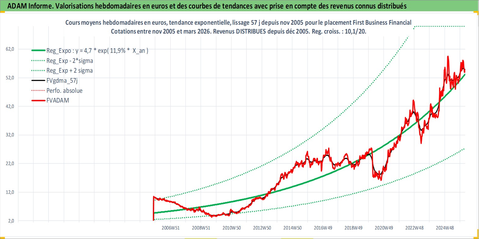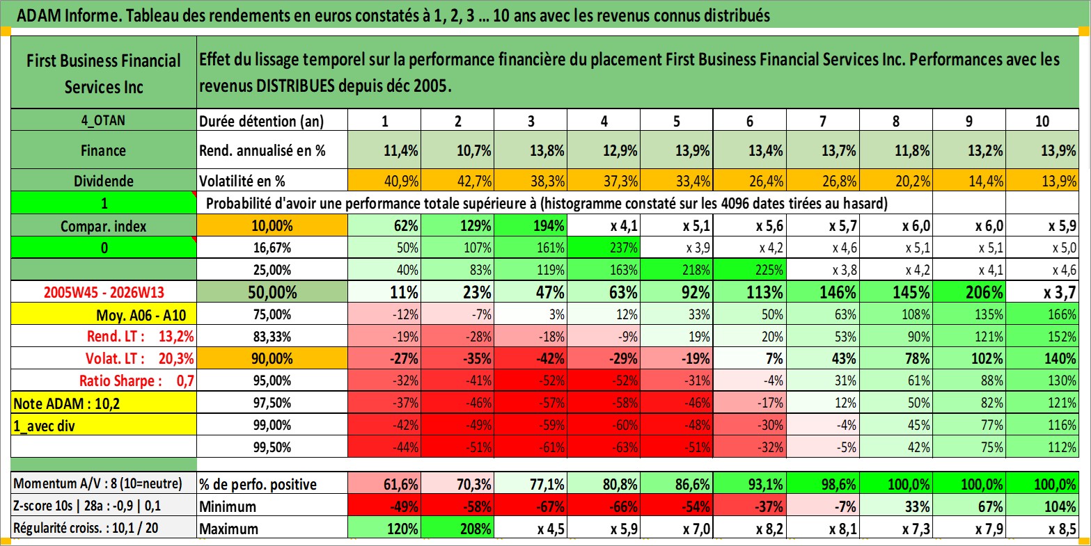 Site dédié aux investisseursPage dédiée sur site financeAnalyse des valorisations hebdomadaires de l'action First Business Financial Services Inc. Cet actif est cote en USD. Les valorisations sont en contrevaleur EURO et couvrent les semaines 2005W45 a 2026W13. Les revenus de cet actif financier sont pris en compte depuis la semaine 2005W52. La note ESG de cet actif n'est pas connue.