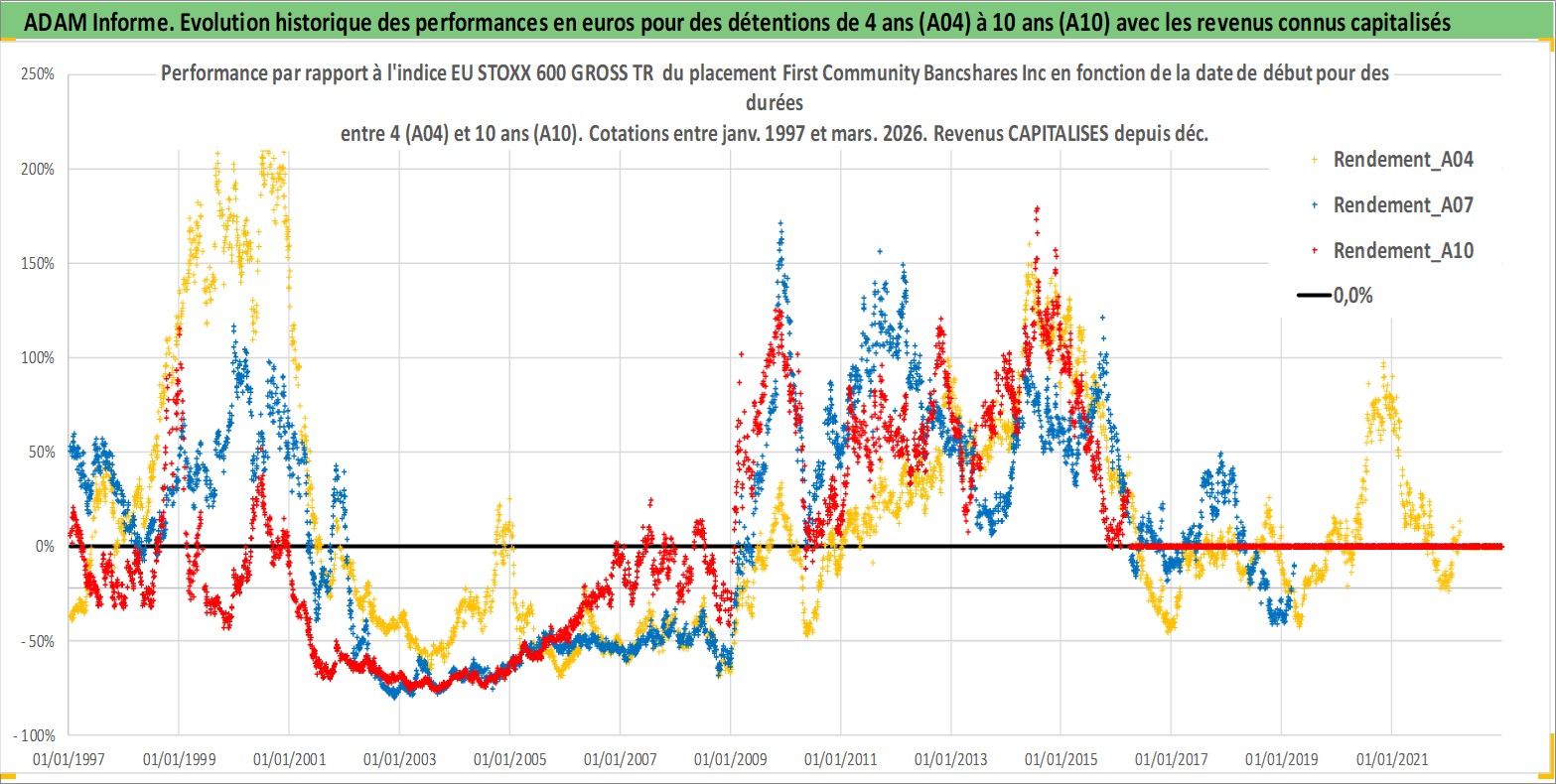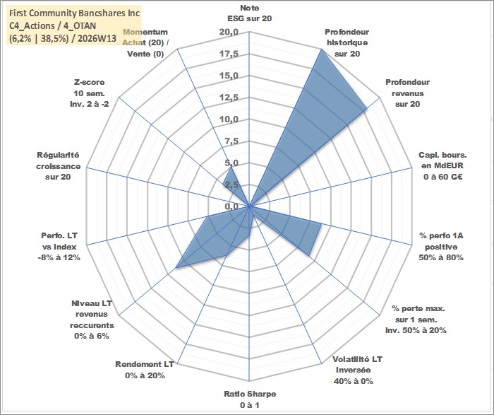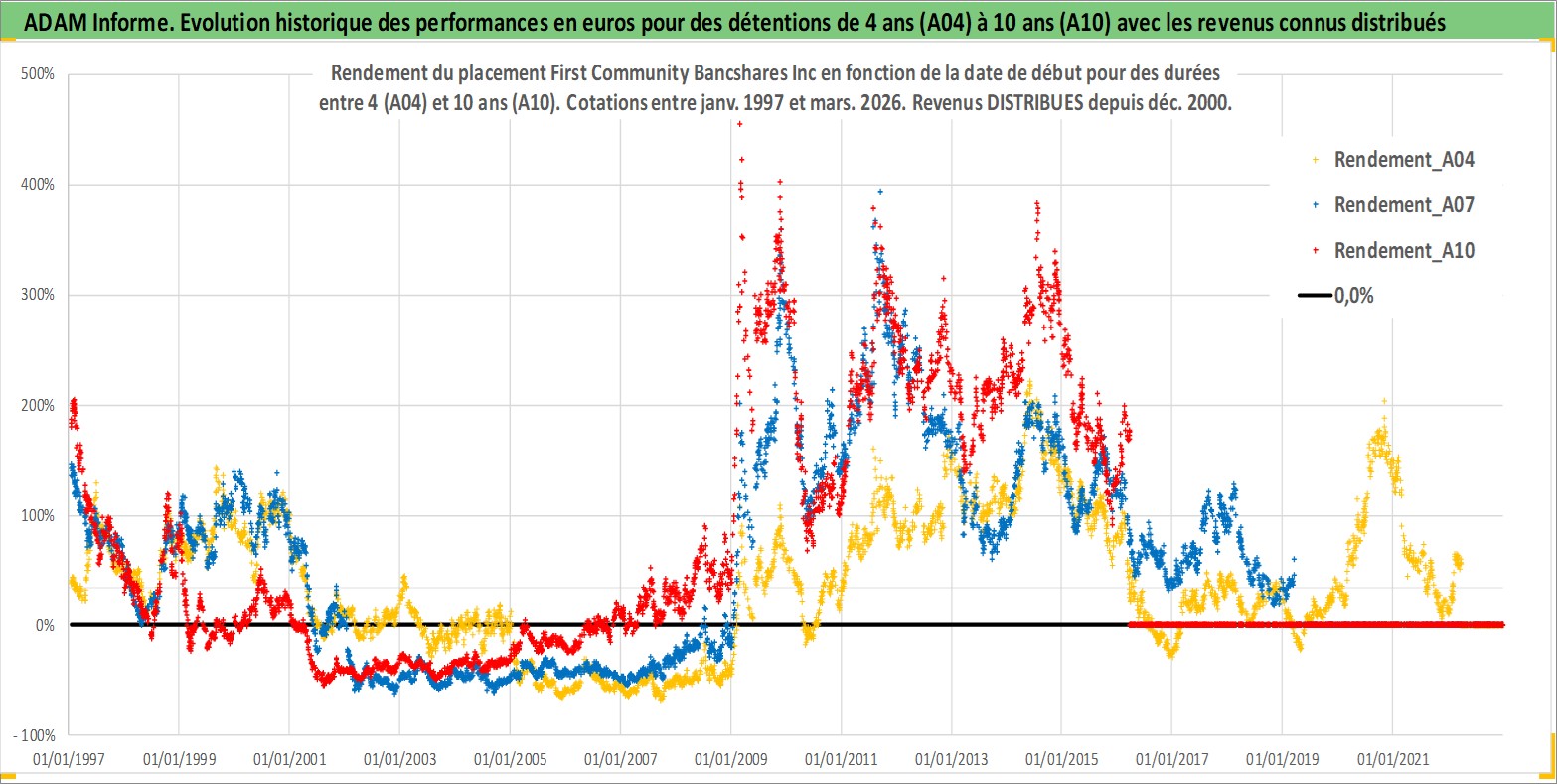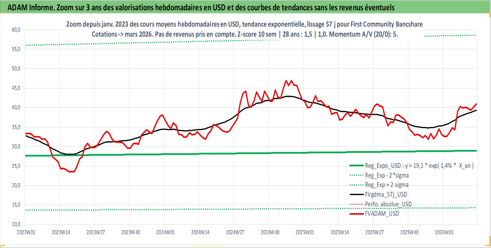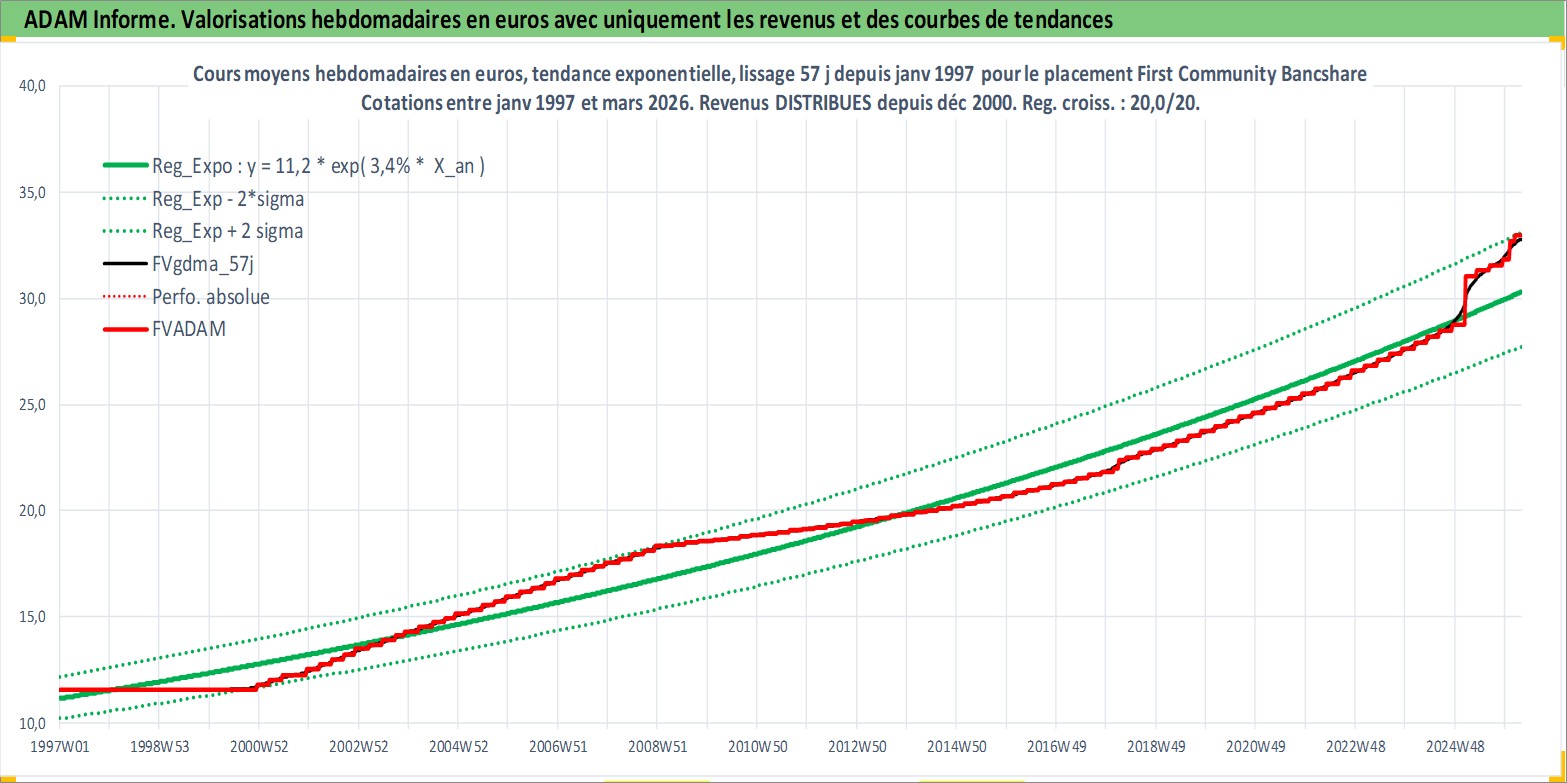 Site dédié aux investisseursPage dédiée sur site financeAnalyse des valorisations hebdomadaires de l'action First Community Bancshares Inc. Cet actif est cote en USD. Les valorisations sont en contrevaleur EURO et couvrent les semaines 1997W01 a 2026W13. Les revenus de cet actif financier sont pris en compte depuis la semaine 2000W50. La note ESG de cet actif n'est pas connue.