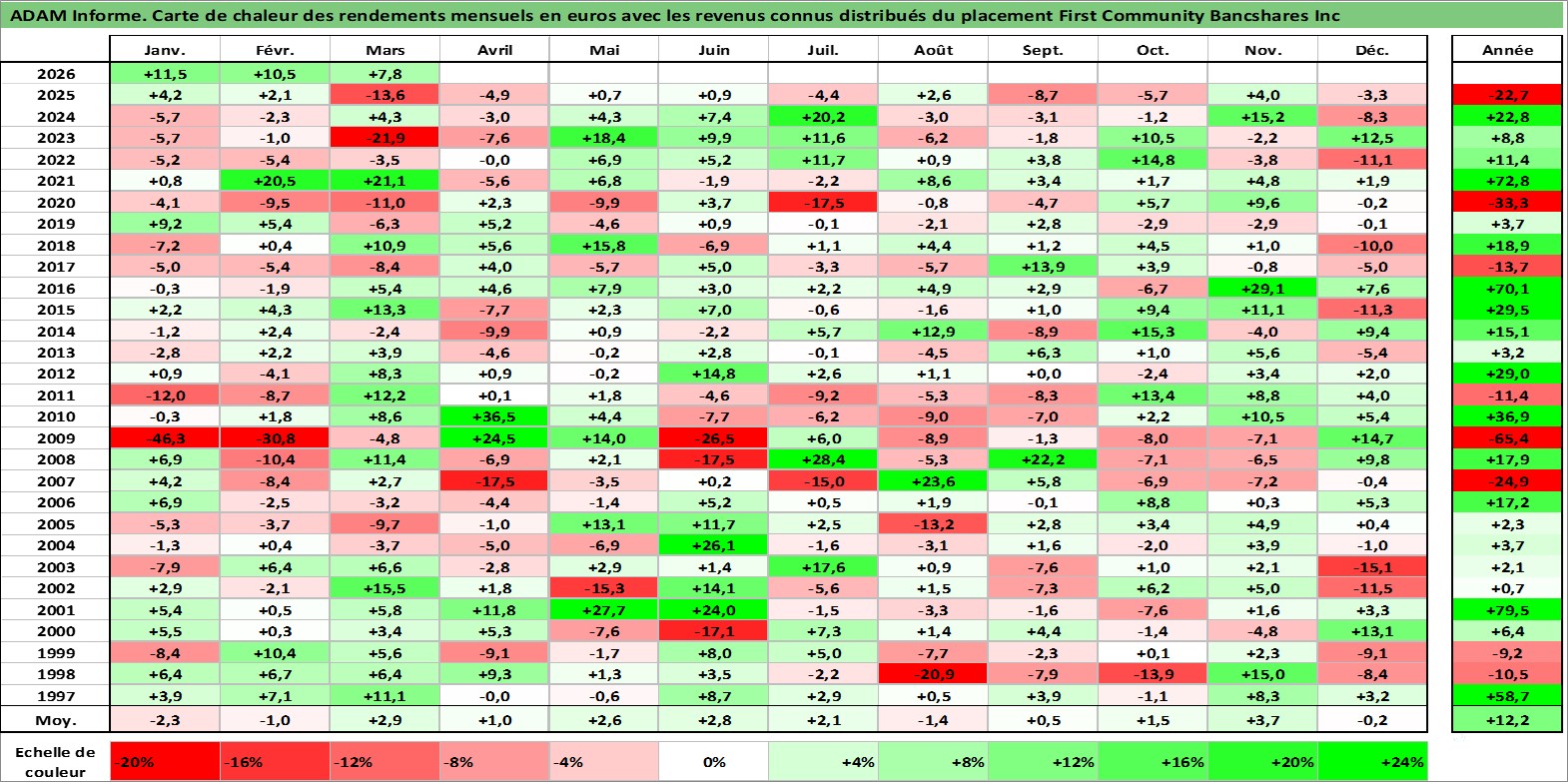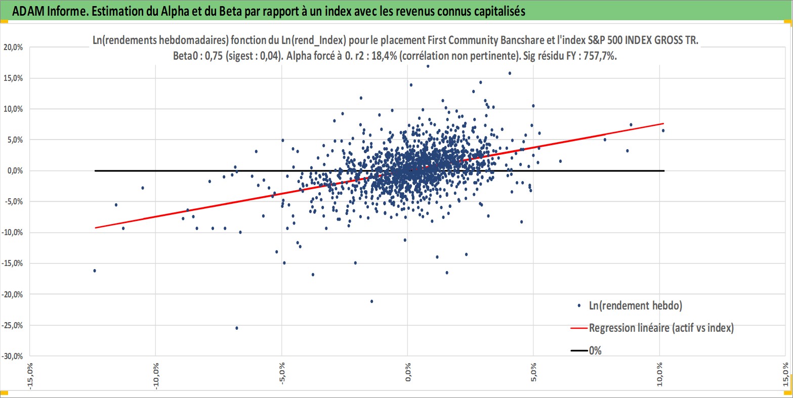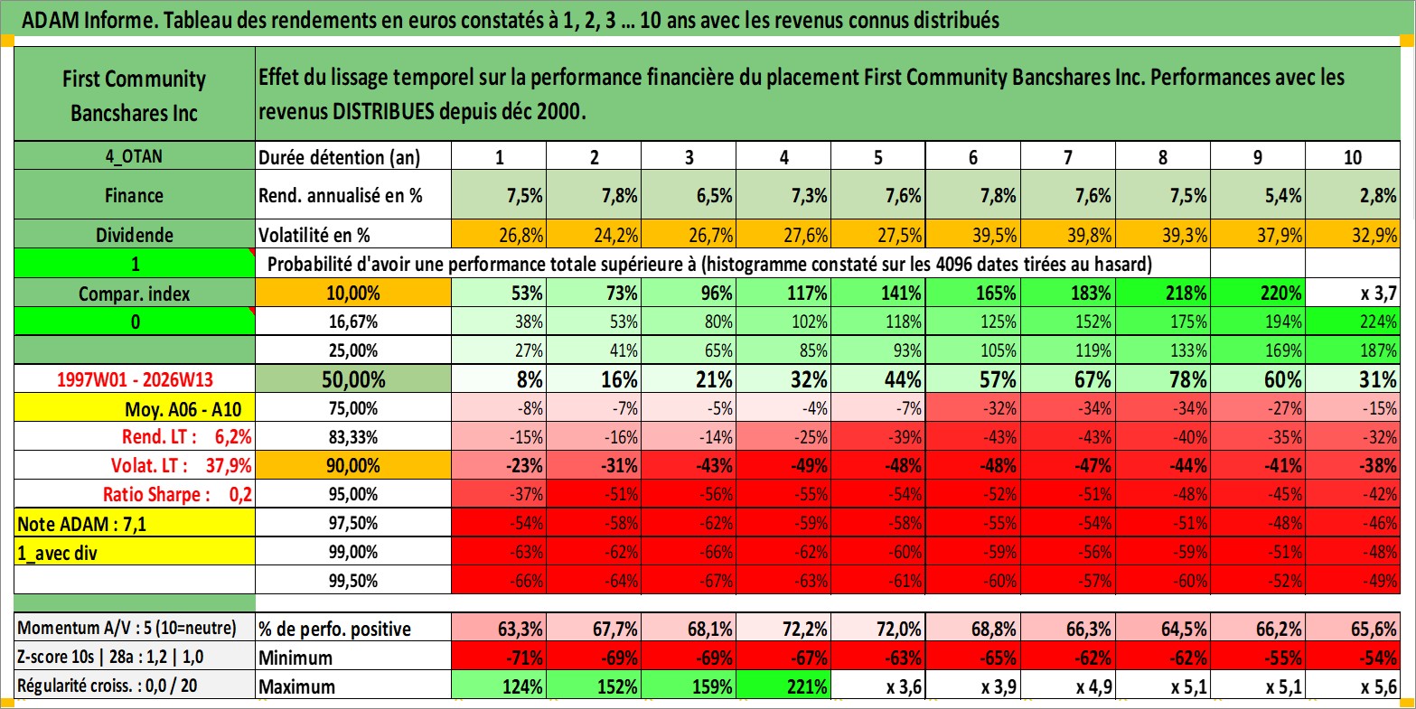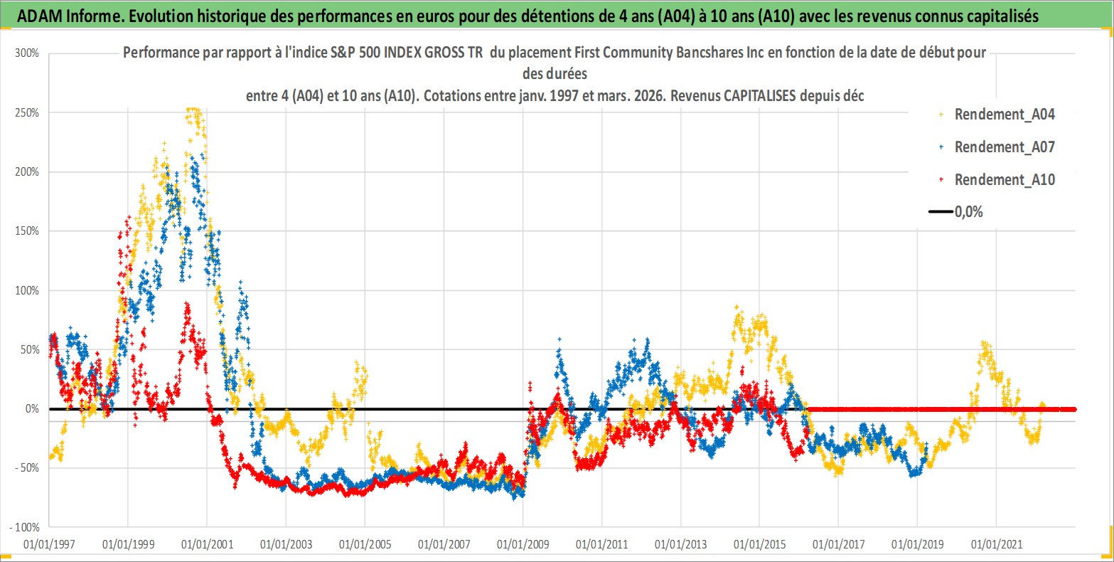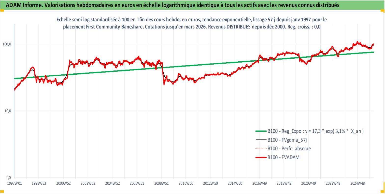 Site dédié aux investisseursPage dédiée sur site financeAnalyse des valorisations hebdomadaires de l'action First Community Bancshares Inc. Cet actif est cote en USD. Les valorisations sont en contrevaleur EURO et couvrent les semaines 1997W01 a 2026W13. Les revenus de cet actif financier sont pris en compte depuis la semaine 2000W50. La note ESG de cet actif n'est pas connue.