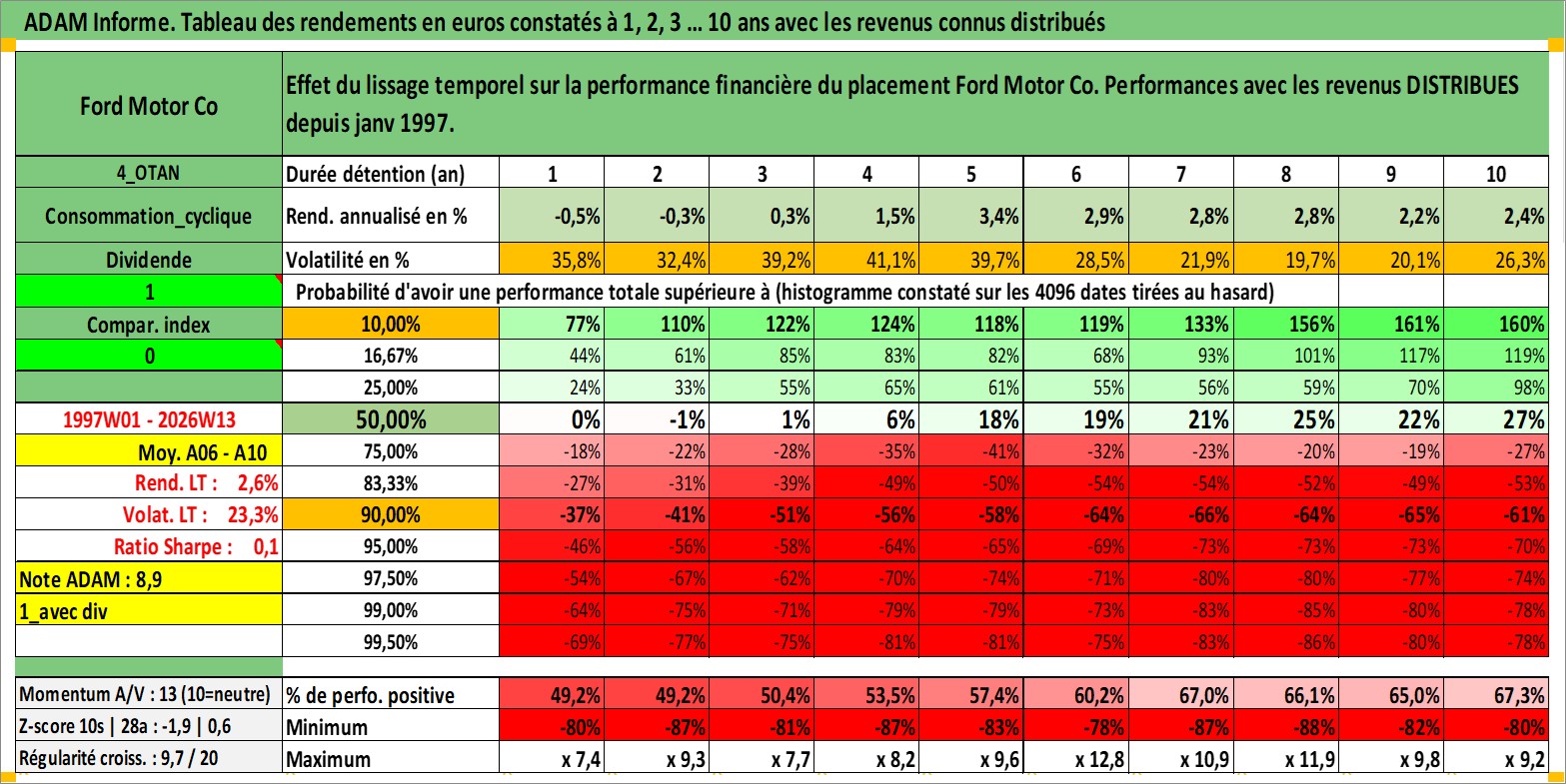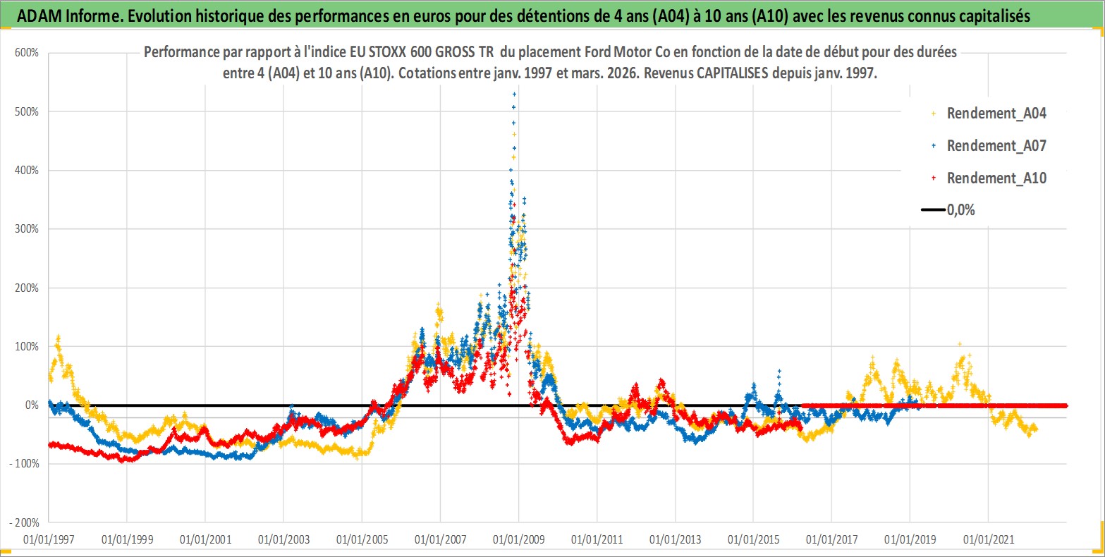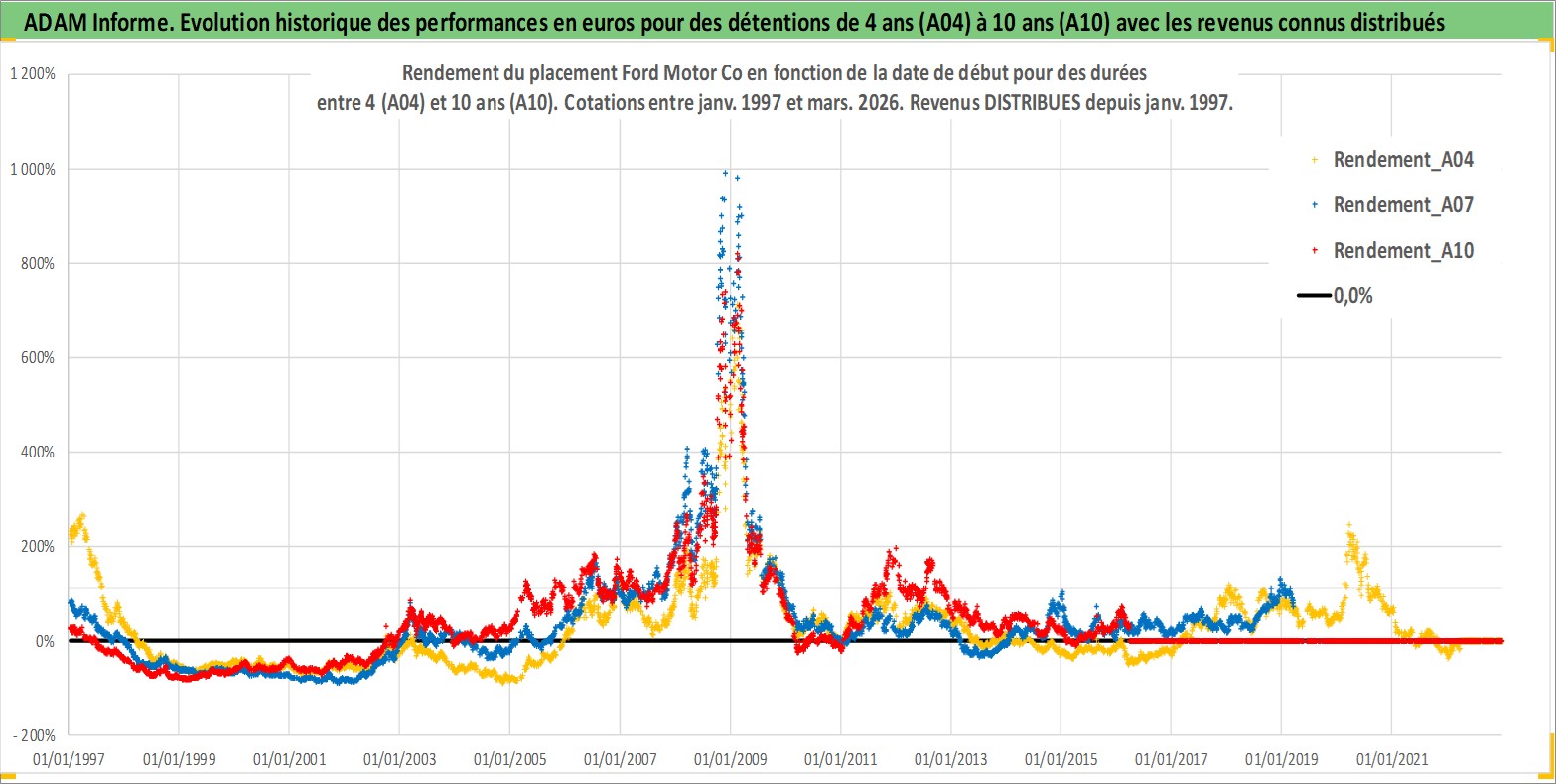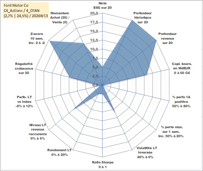 Site dédié aux investisseursPage dédiée sur site financeAnalyse des valorisations hebdomadaires de l'action Ford Motor Co. Cet actif est cote en USD. Les valorisations sont en contrevaleur EURO et couvrent les semaines 1997W01 a 2026W13. Les revenus de cet actif financier sont pris en compte depuis la semaine 1997W05. La note globale ESG de cet actif est estimee a 5.0 (apres rebasage entre 0 et 20).