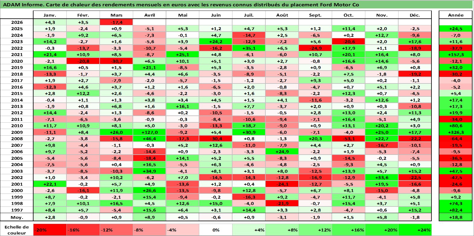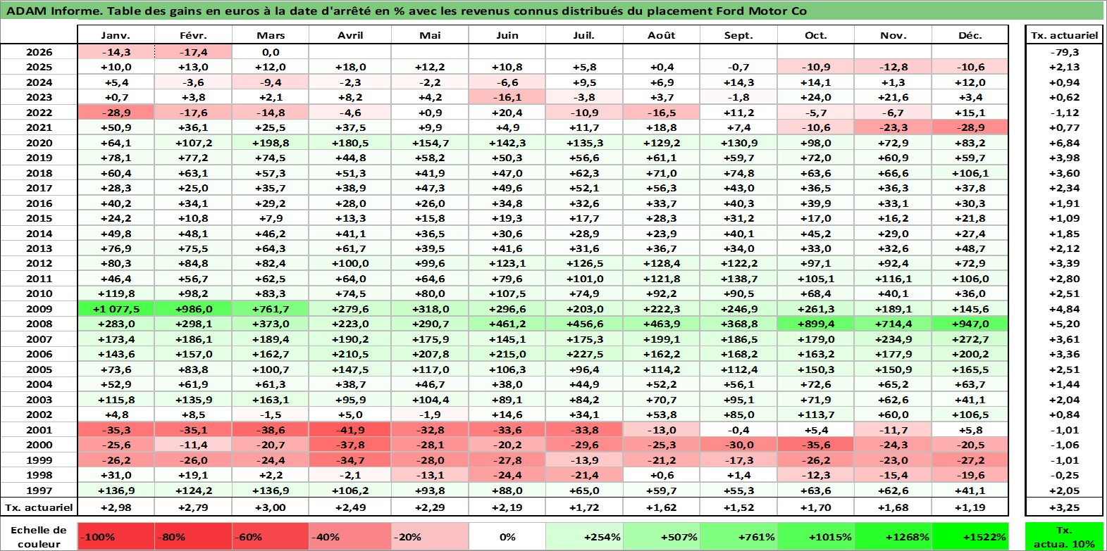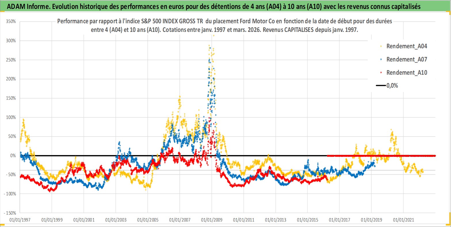 Site dédié aux investisseursPage dédiée sur site financeAnalyse des valorisations hebdomadaires de l'action Ford Motor Co. Cet actif est cote en USD. Les valorisations sont en contrevaleur EURO et couvrent les semaines 1997W01 a 2026W13. Les revenus de cet actif financier sont pris en compte depuis la semaine 1997W05. La note globale ESG de cet actif est estimee a 5.0 (apres rebasage entre 0 et 20).