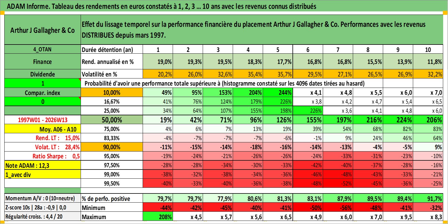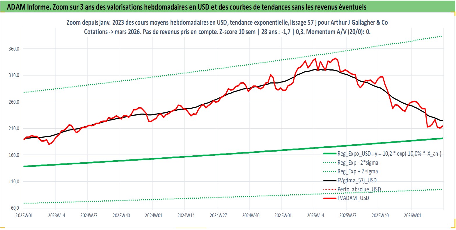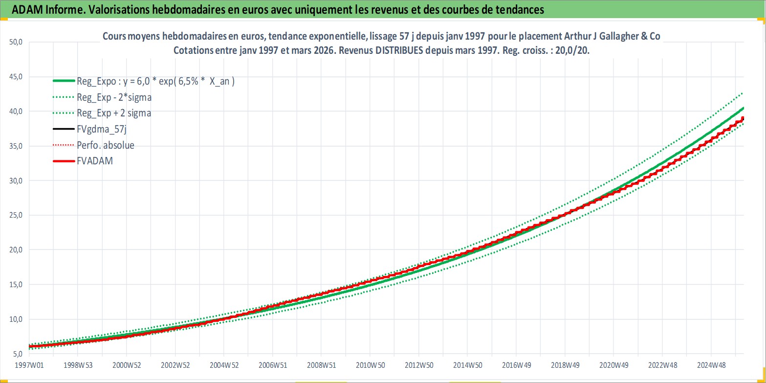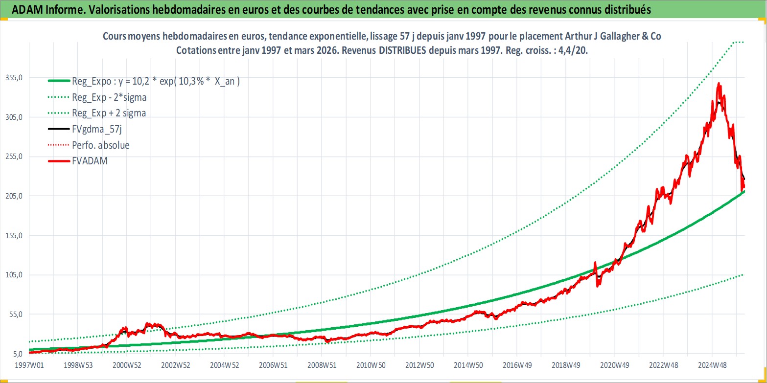 Site dédié aux investisseursPage dédiée sur site financeAnalyse des valorisations hebdomadaires de l'action Arthur J Gallagher & Co. Cet actif est cote en USD. Les valorisations sont en contrevaleur EURO et couvrent les semaines 1997W01 a 2026W13. Les revenus de cet actif financier sont pris en compte depuis la semaine 1997W13. La note globale ESG de cet actif est estimee a 10.0 (apres rebasage entre 0 et 20).