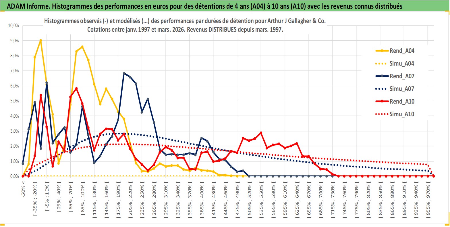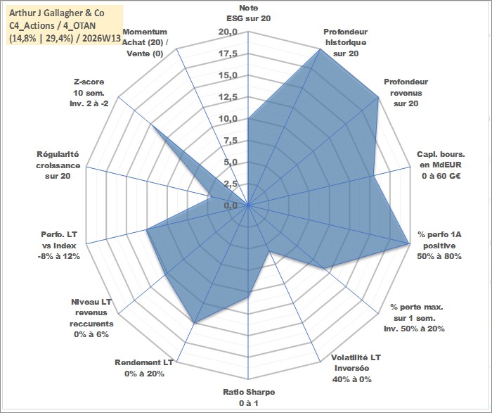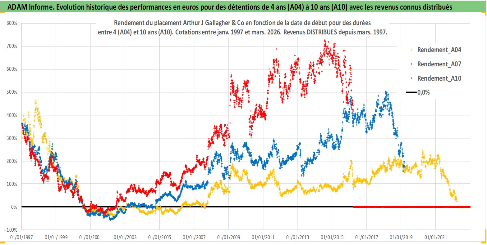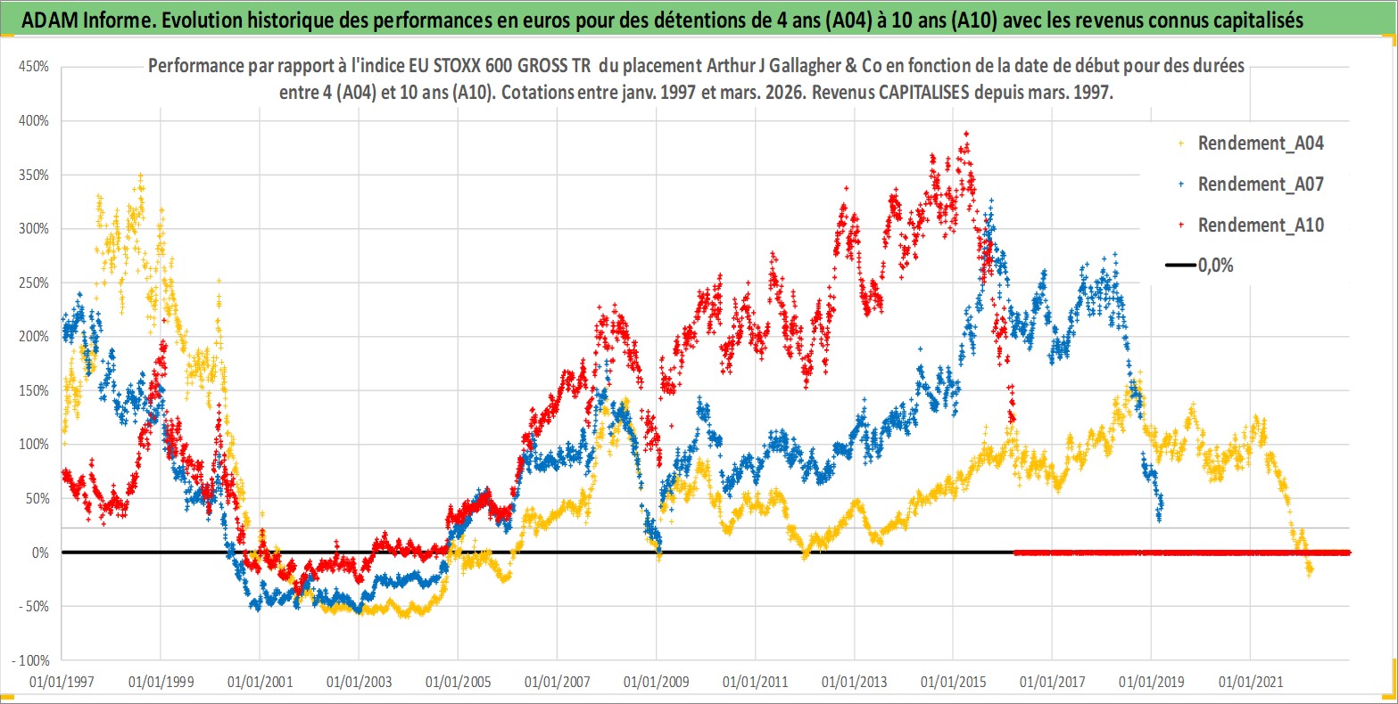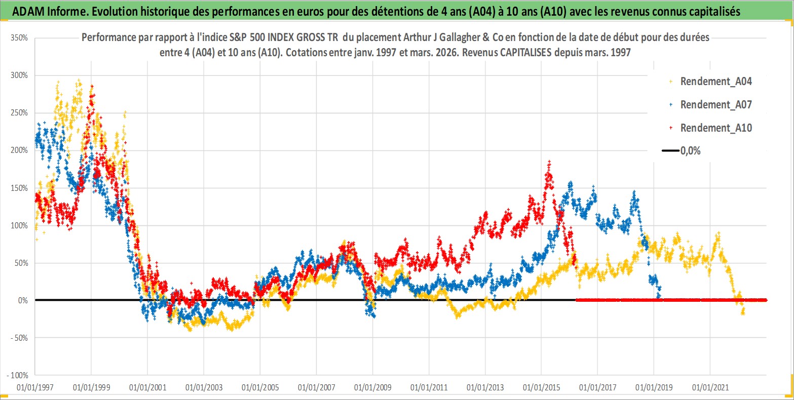 Site dédié aux investisseursPage dédiée sur site financeAnalyse des valorisations hebdomadaires de l'action Arthur J Gallagher & Co. Cet actif est cote en USD. Les valorisations sont en contrevaleur EURO et couvrent les semaines 1997W01 a 2026W13. Les revenus de cet actif financier sont pris en compte depuis la semaine 1997W13. La note globale ESG de cet actif est estimee a 10.0 (apres rebasage entre 0 et 20).