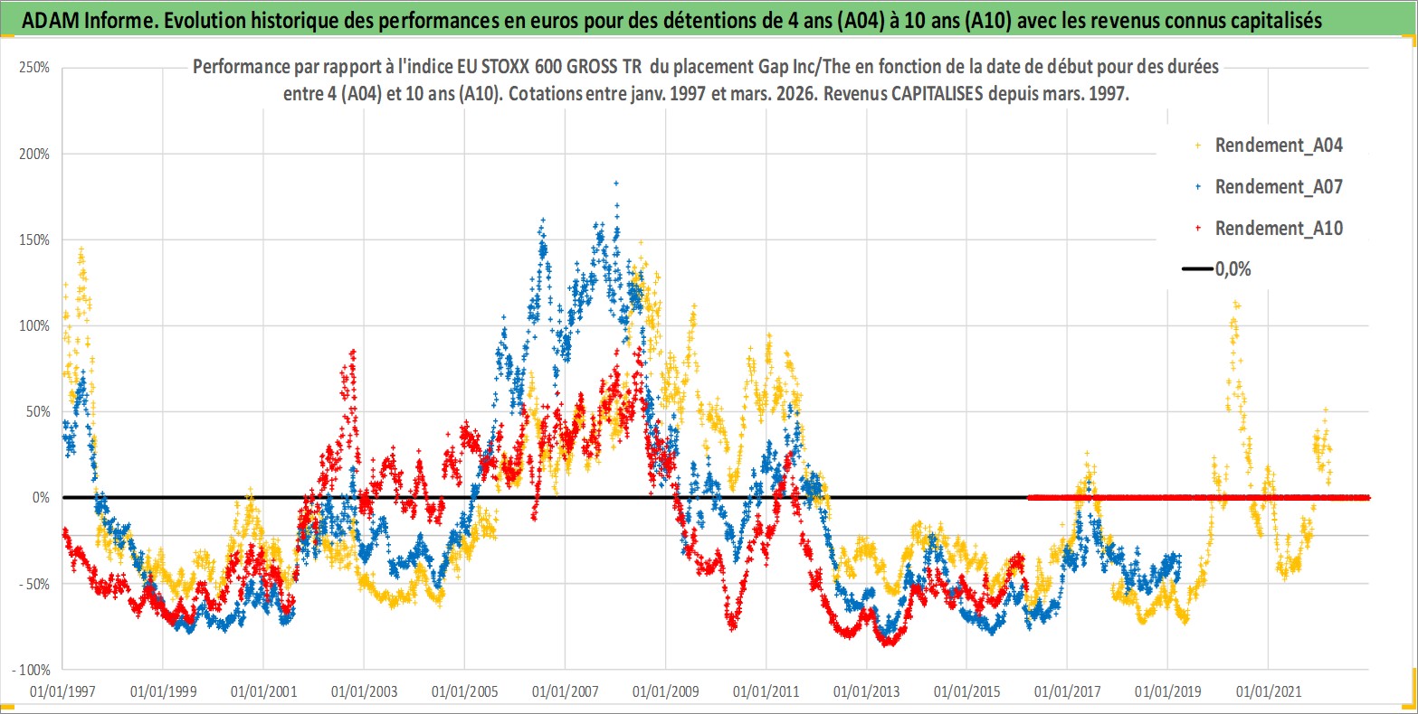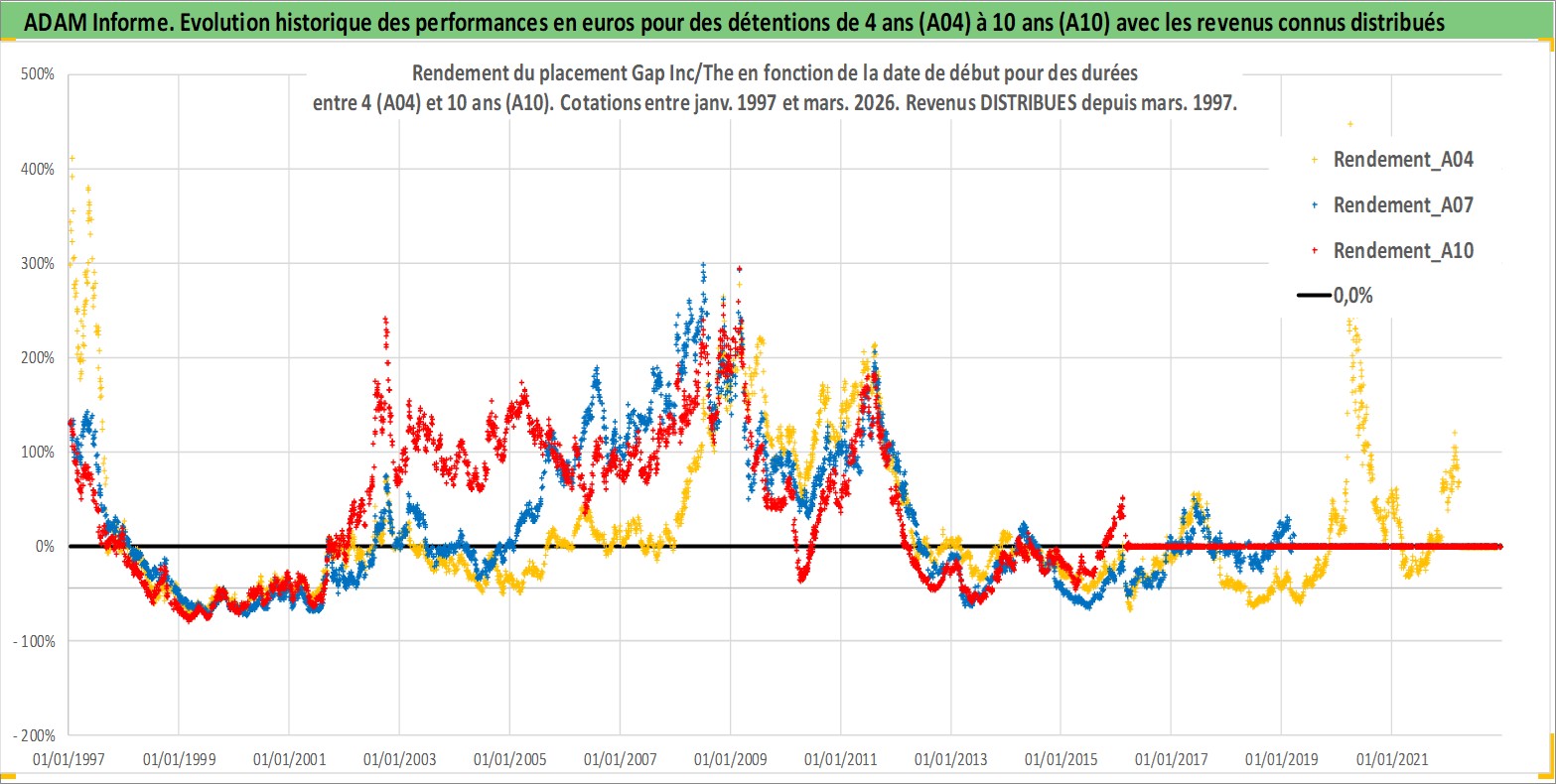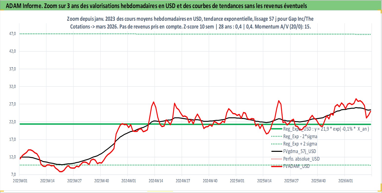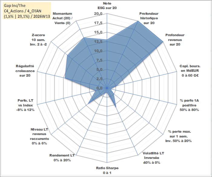 Site dédié aux investisseursPage dédiée sur site financeAnalyse des valorisations hebdomadaires de l'action Gap Inc/The. Cet actif est cote en USD. Les valorisations sont en contrevaleur EURO et couvrent les semaines 1997W01 a 2026W13. Les revenus de cet actif financier sont pris en compte depuis la semaine 1997W10. La note globale ESG de cet actif est estimee a 13.0 (apres rebasage entre 0 et 20).