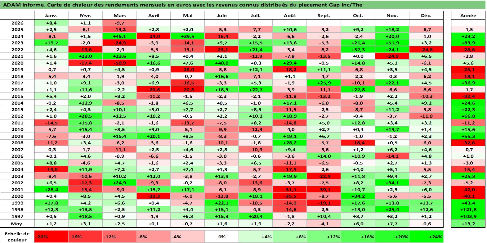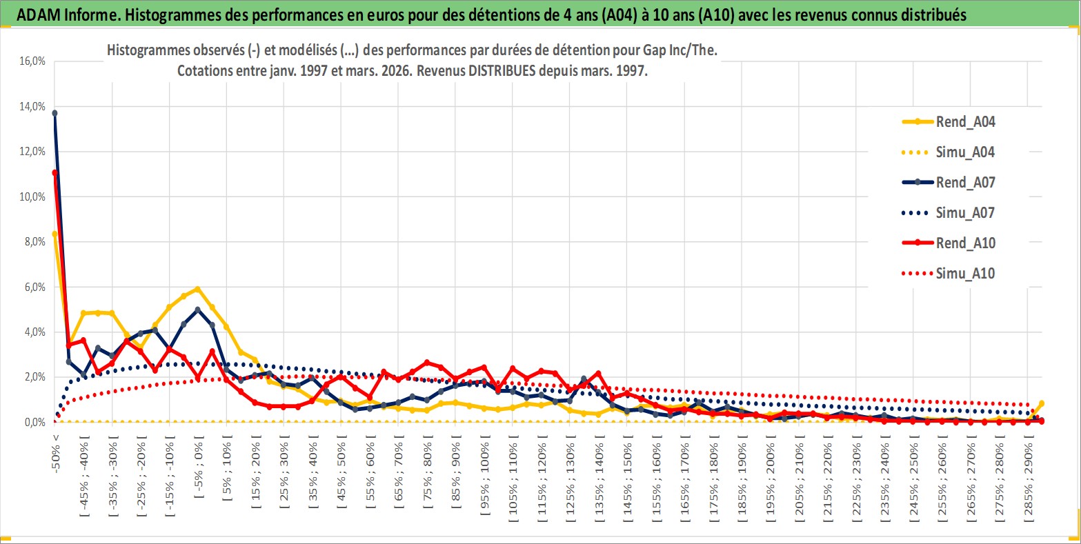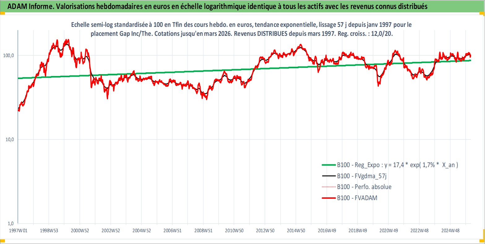 Site dédié aux investisseursPage dédiée sur site financeAnalyse des valorisations hebdomadaires de l'action Gap Inc/The. Cet actif est cote en USD. Les valorisations sont en contrevaleur EURO et couvrent les semaines 1997W01 a 2026W13. Les revenus de cet actif financier sont pris en compte depuis la semaine 1997W10. La note globale ESG de cet actif est estimee a 13.0 (apres rebasage entre 0 et 20).