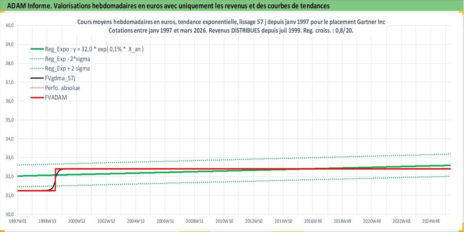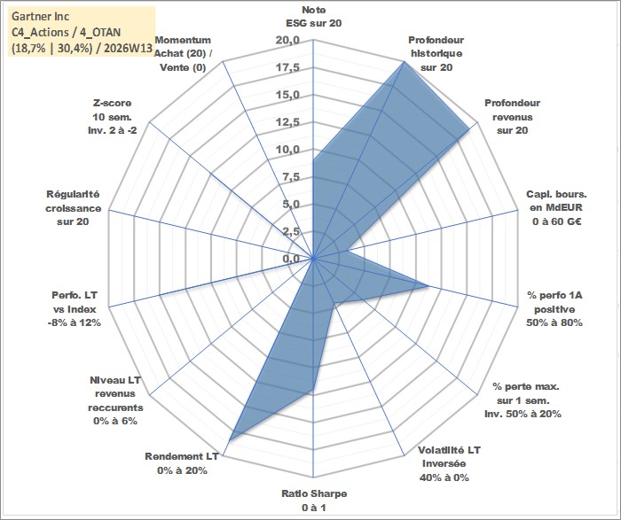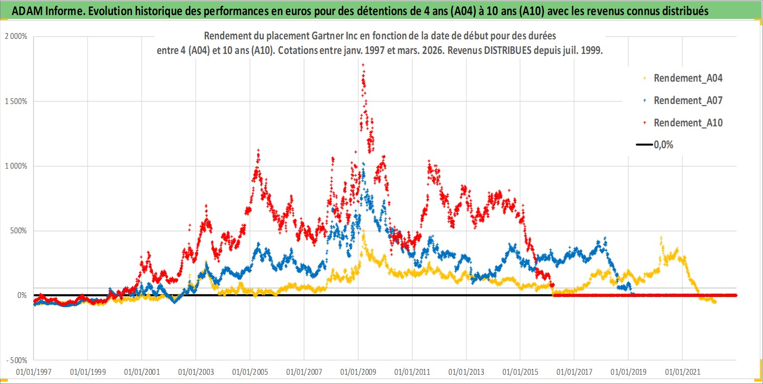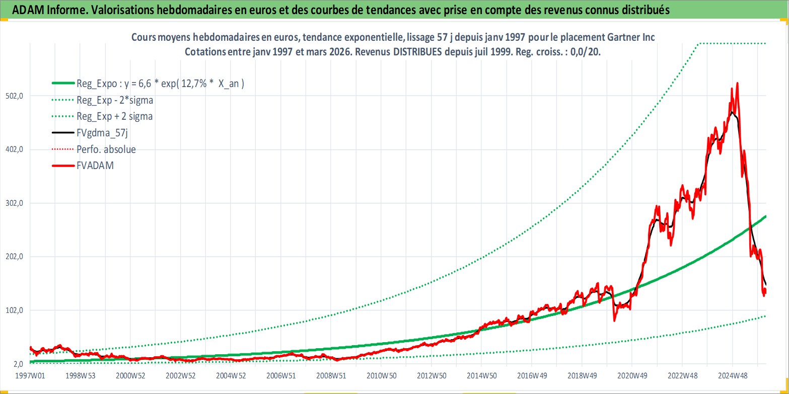 Site dédié aux investisseursPage dédiée sur site financeAnalyse des valorisations hebdomadaires de l'action Gartner Inc. Cet actif est cote en USD. Les valorisations sont en contrevaleur EURO et couvrent les semaines 1997W01 a 2026W13. Les revenus de cet actif financier sont pris en compte depuis la semaine 1999W29. La note globale ESG de cet actif est estimee a 9.0 (apres rebasage entre 0 et 20).