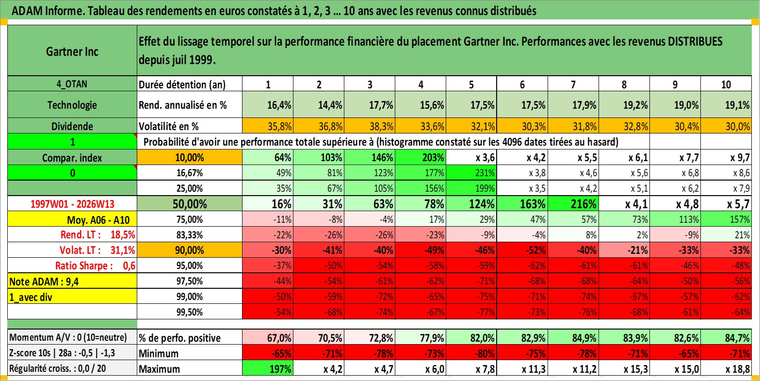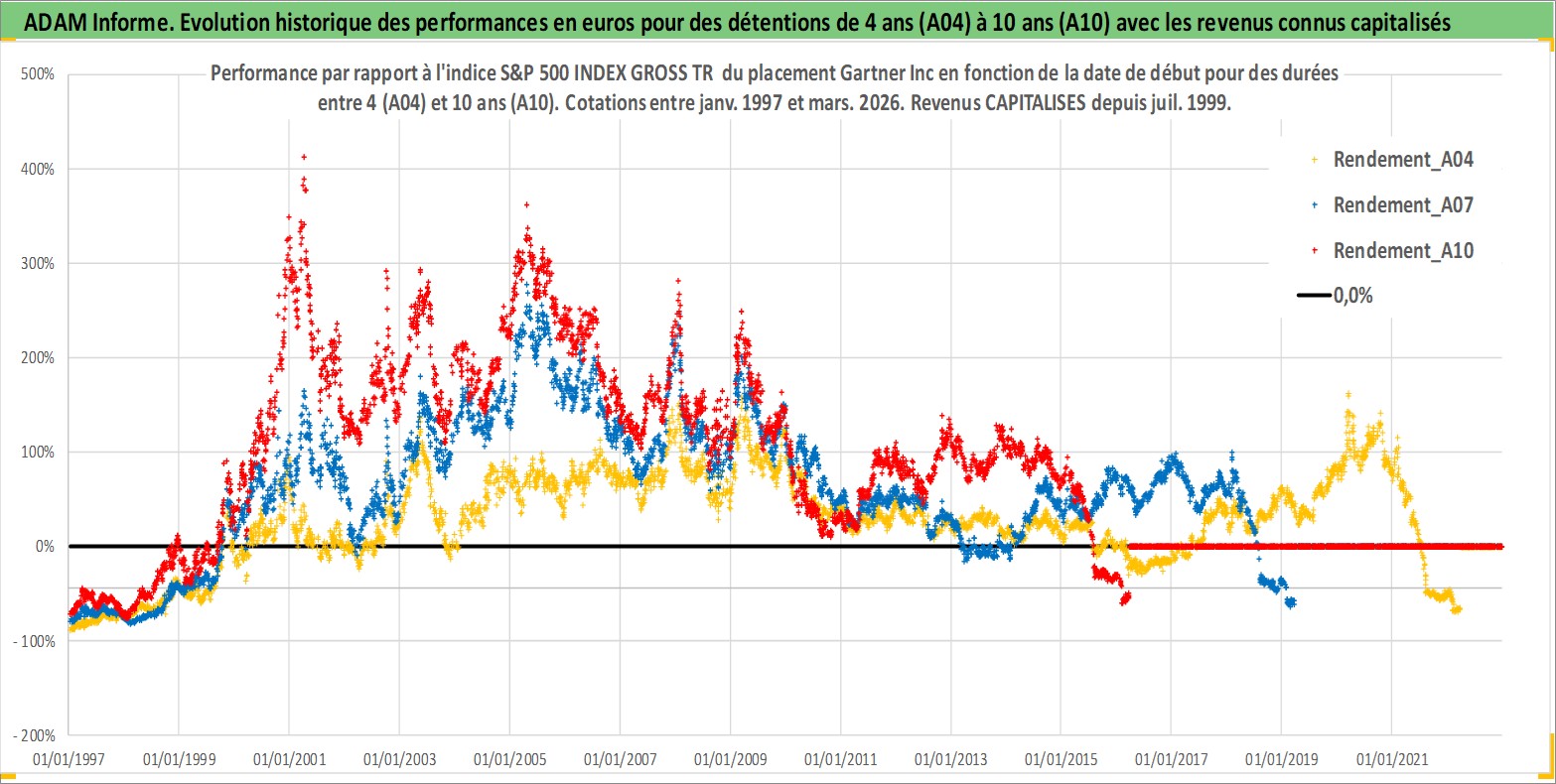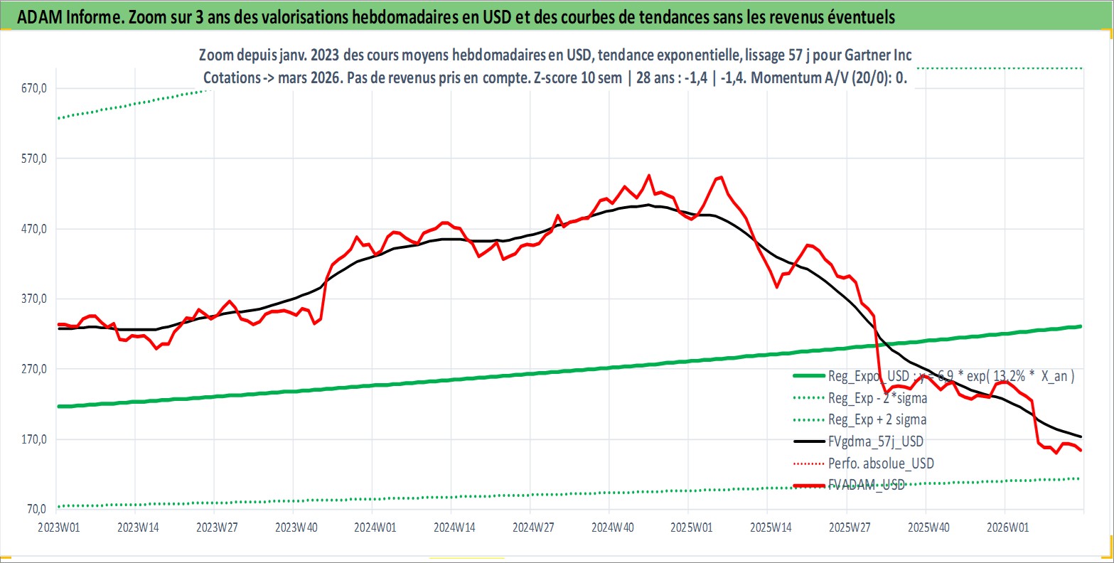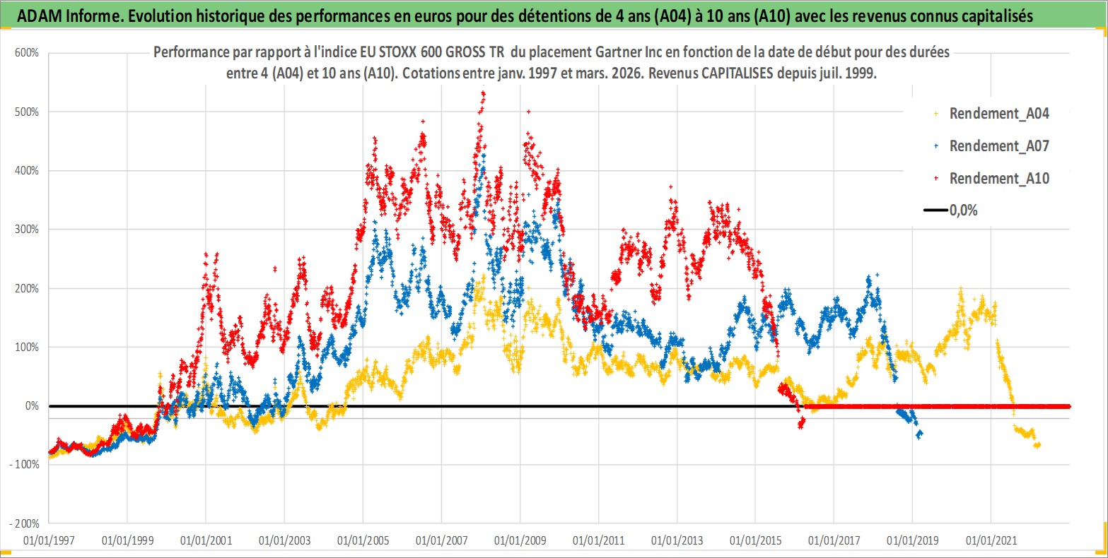 Site dédié aux investisseursPage dédiée sur site financeAnalyse des valorisations hebdomadaires de l'action Gartner Inc. Cet actif est cote en USD. Les valorisations sont en contrevaleur EURO et couvrent les semaines 1997W01 a 2026W13. Les revenus de cet actif financier sont pris en compte depuis la semaine 1999W29. La note globale ESG de cet actif est estimee a 9.0 (apres rebasage entre 0 et 20).