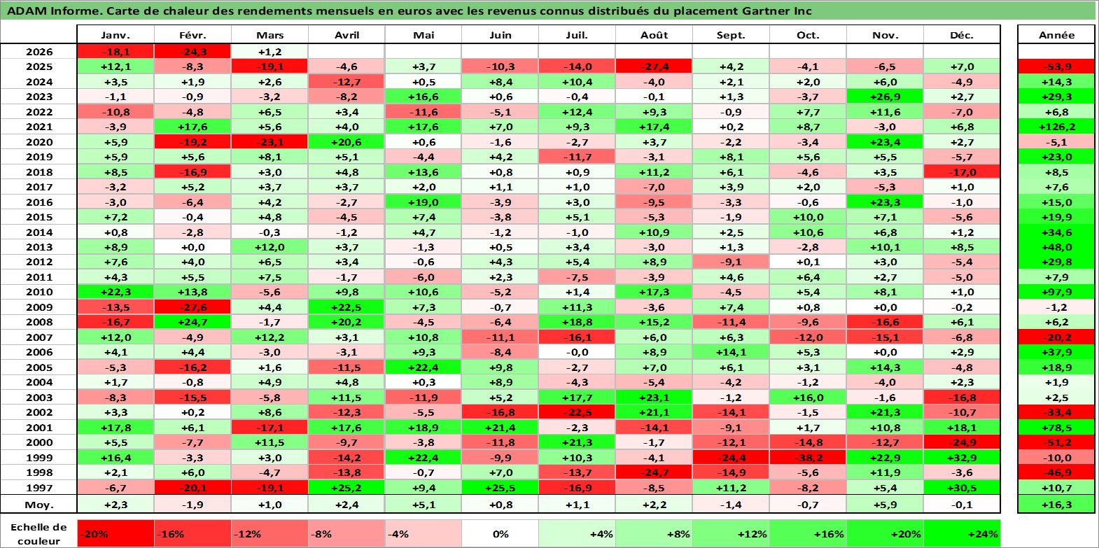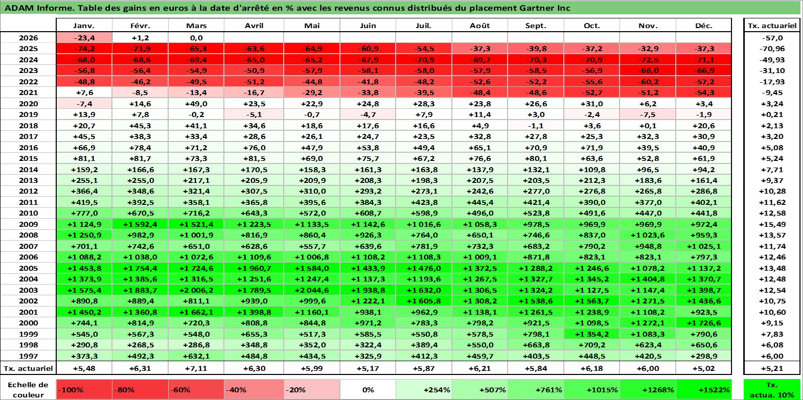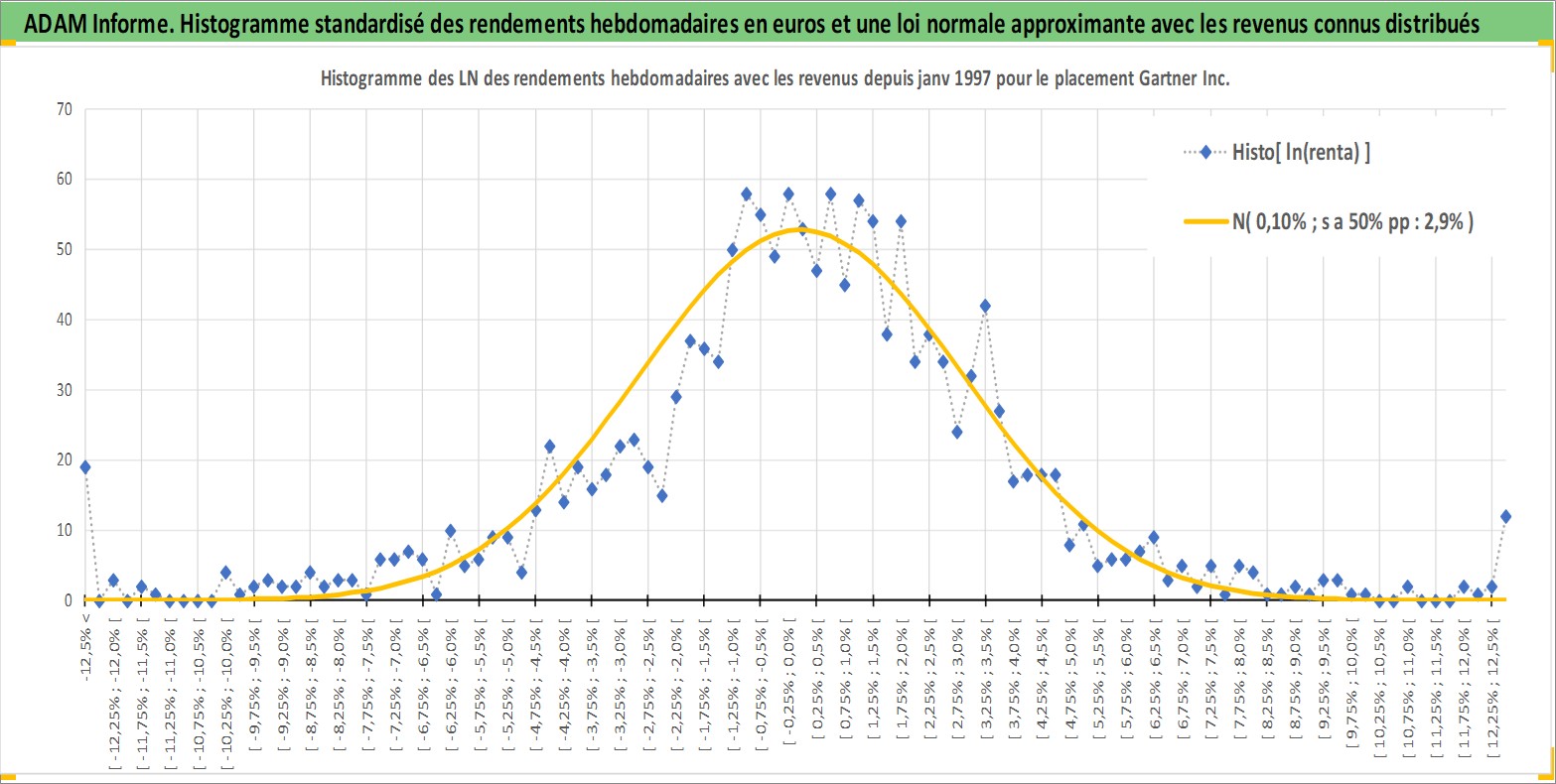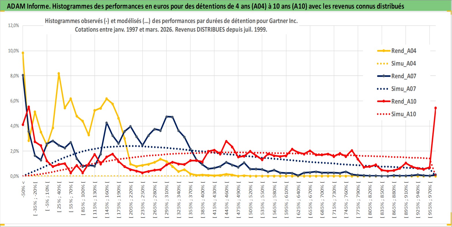 Site dédié aux investisseursPage dédiée sur site financeAnalyse des valorisations hebdomadaires de l'action Gartner Inc. Cet actif est cote en USD. Les valorisations sont en contrevaleur EURO et couvrent les semaines 1997W01 a 2026W13. Les revenus de cet actif financier sont pris en compte depuis la semaine 1999W29. La note globale ESG de cet actif est estimee a 9.0 (apres rebasage entre 0 et 20).