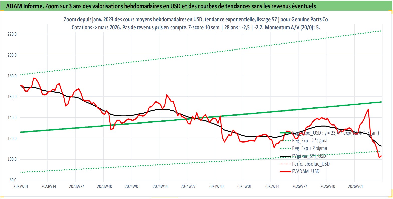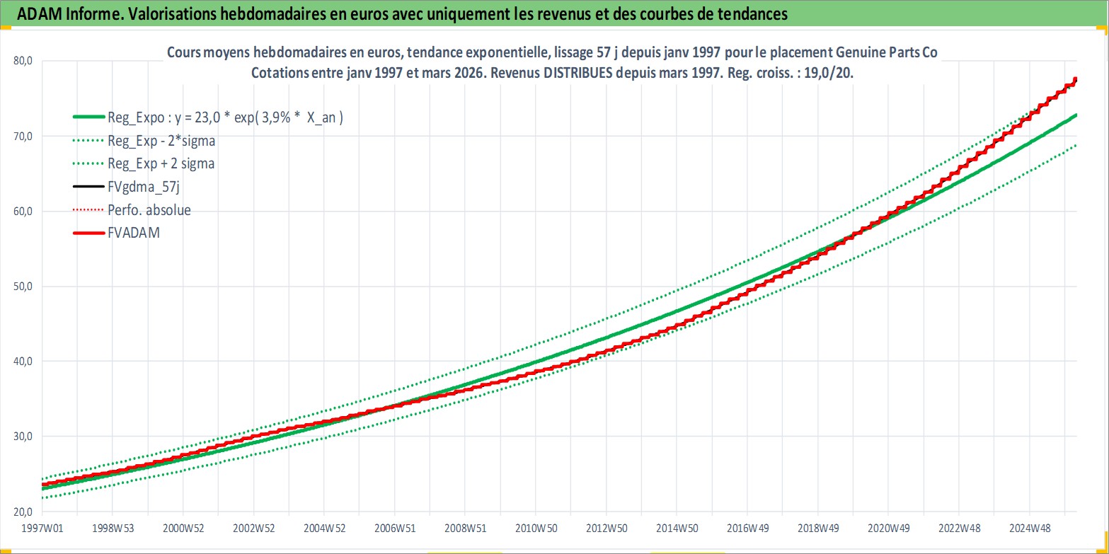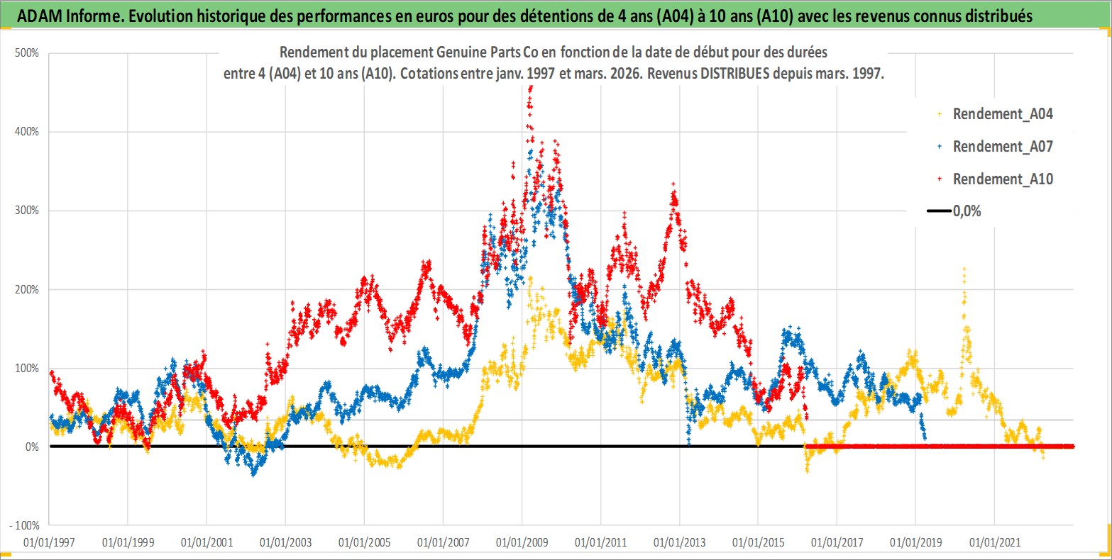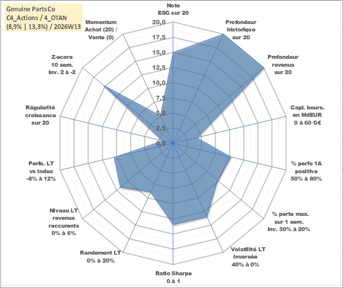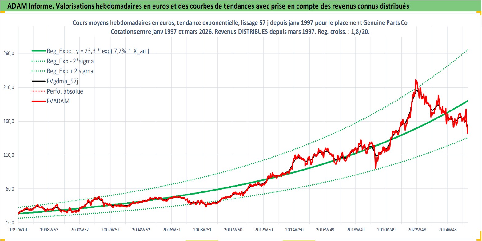 Site dédié aux investisseursPage dédiée sur site financeAnalyse des valorisations hebdomadaires de l'action Genuine Parts Co. Cet actif est cote en USD. Les valorisations sont en contrevaleur EURO et couvrent les semaines 1997W01 a 2026W13. Les revenus de cet actif financier sont pris en compte depuis la semaine 1997W10. La note globale ESG de cet actif est estimee a 15.0 (apres rebasage entre 0 et 20).