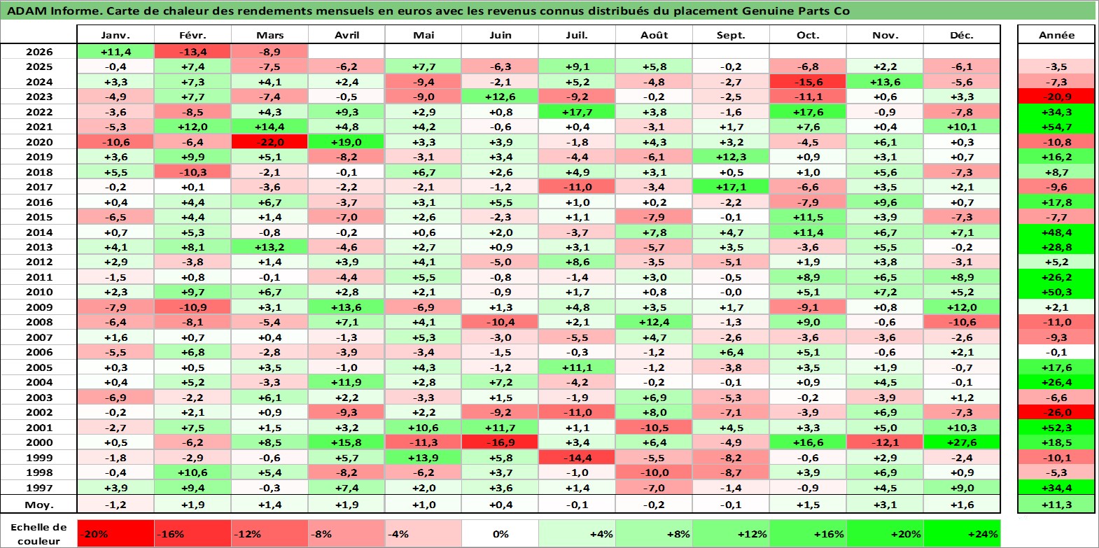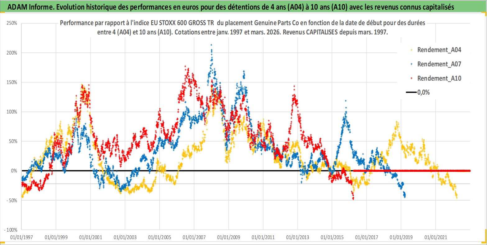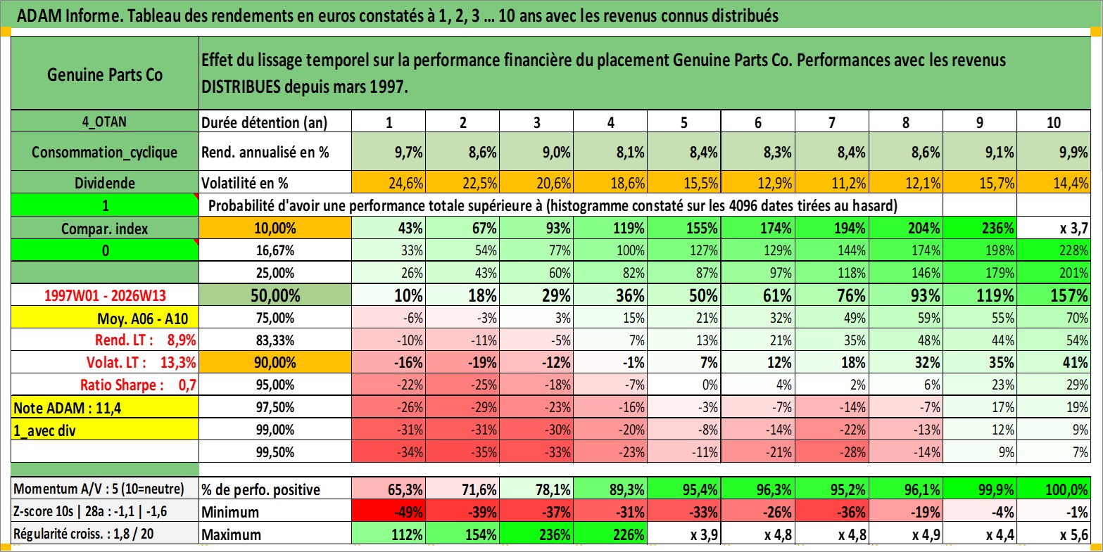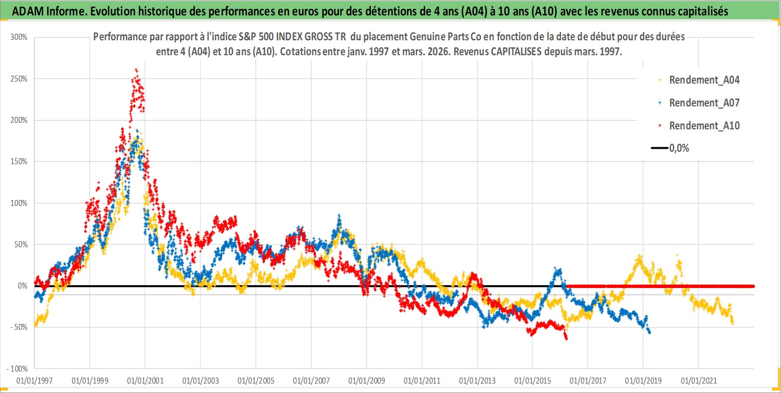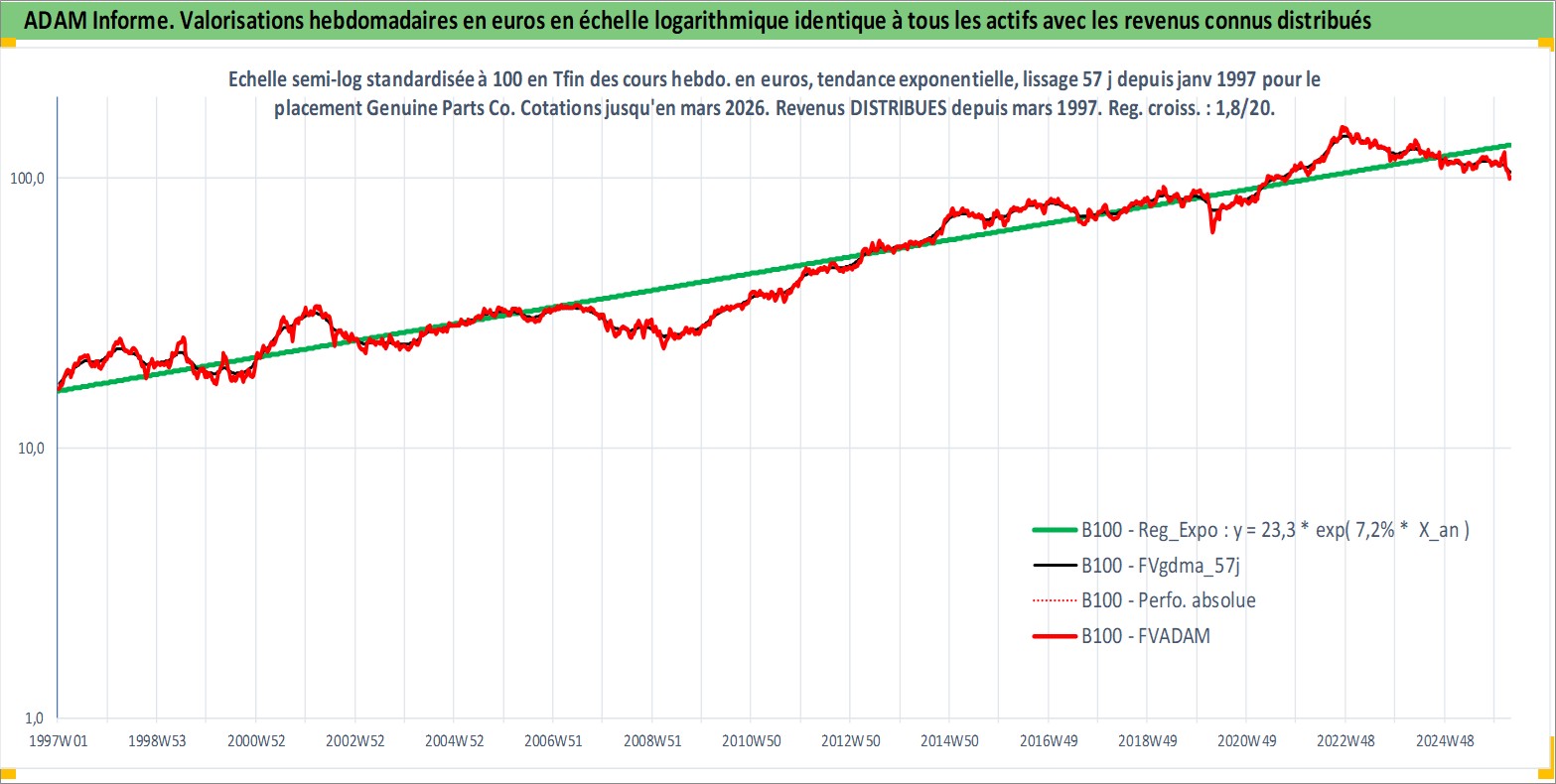 Site dédié aux investisseursPage dédiée sur site financeAnalyse des valorisations hebdomadaires de l'action Genuine Parts Co. Cet actif est cote en USD. Les valorisations sont en contrevaleur EURO et couvrent les semaines 1997W01 a 2026W13. Les revenus de cet actif financier sont pris en compte depuis la semaine 1997W10. La note globale ESG de cet actif est estimee a 15.0 (apres rebasage entre 0 et 20).