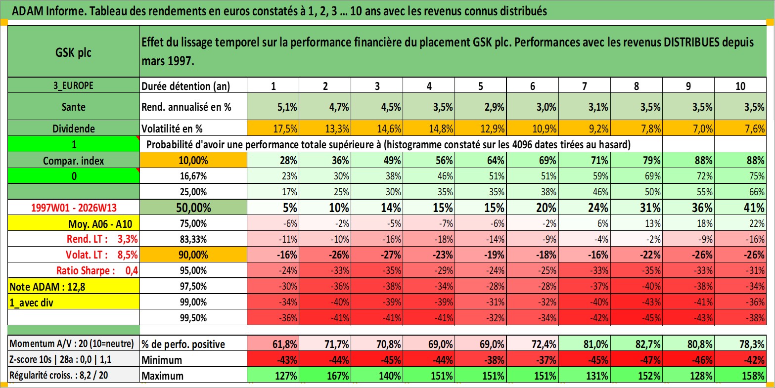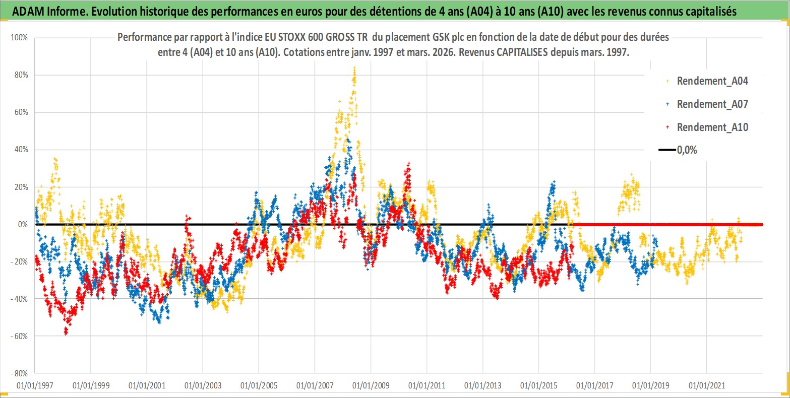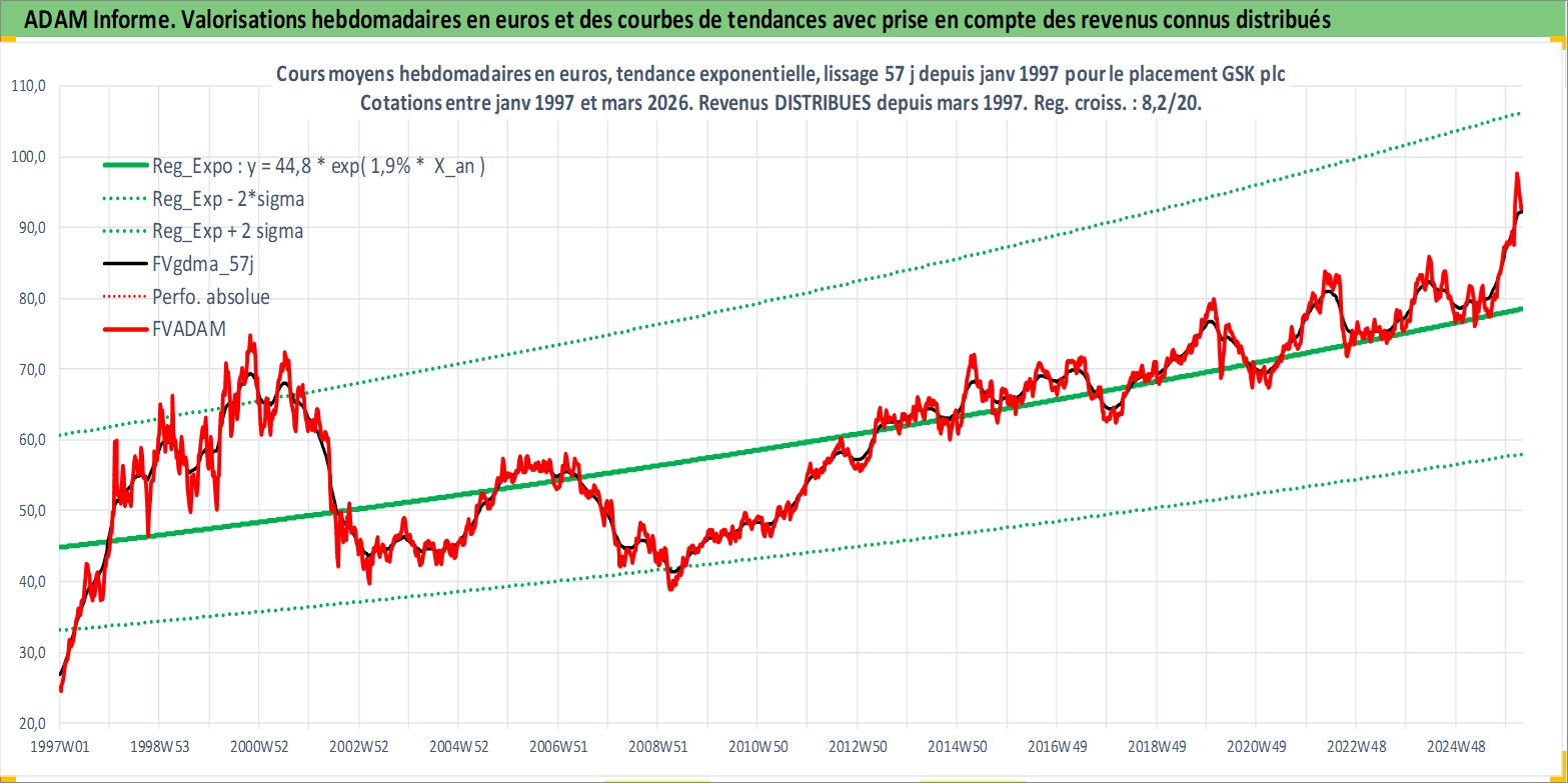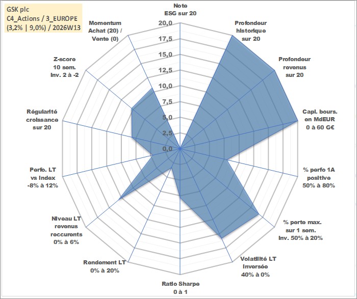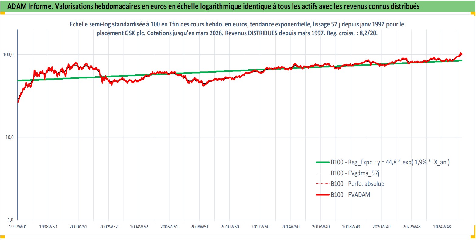 Site dédié aux investisseursPage dédiée sur site financeAnalyse des valorisations hebdomadaires de l'action GSK plc. Cet actif est cote en USD. Les valorisations sont en contrevaleur EURO et couvrent les semaines 1997W01 a 2026W13. Les revenus de cet actif financier sont pris en compte depuis la semaine 1997W12. La note ESG de cet actif n'est pas connue.