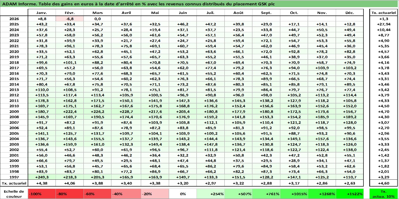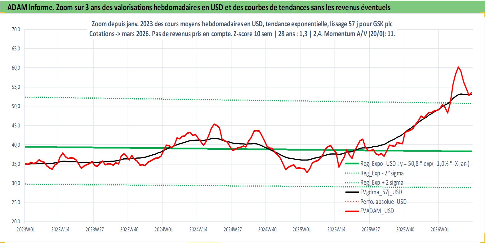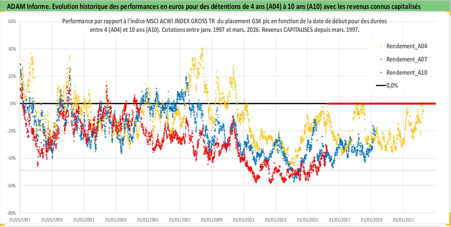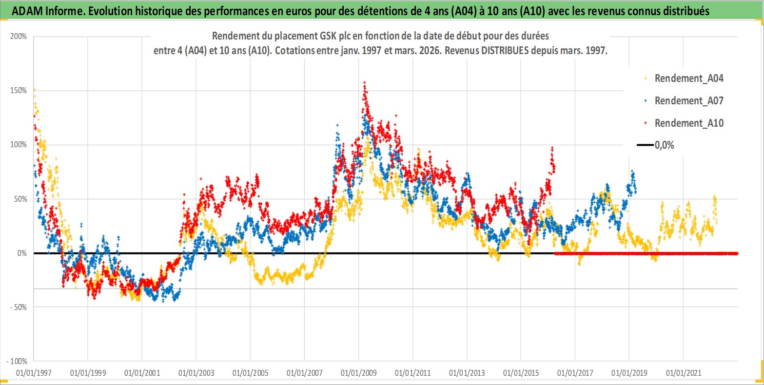 Site dédié aux investisseursPage dédiée sur site financeAnalyse des valorisations hebdomadaires de l'action GSK plc. Cet actif est cote en USD. Les valorisations sont en contrevaleur EURO et couvrent les semaines 1997W01 a 2026W13. Les revenus de cet actif financier sont pris en compte depuis la semaine 1997W12. La note ESG de cet actif n'est pas connue.