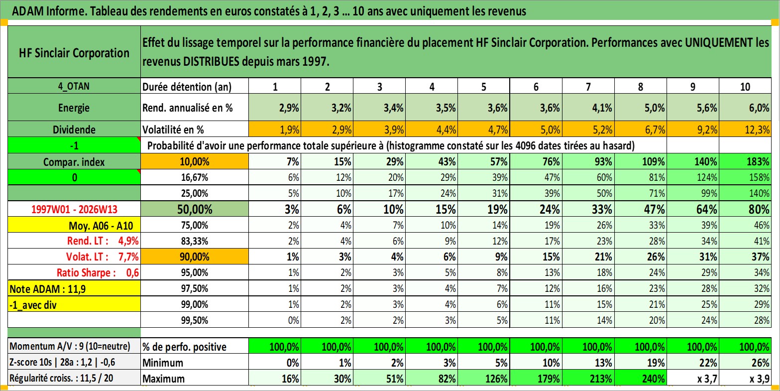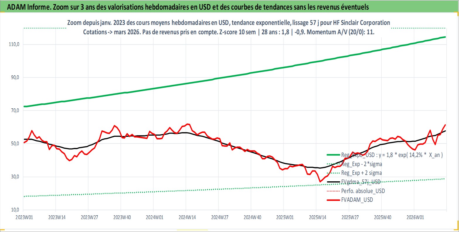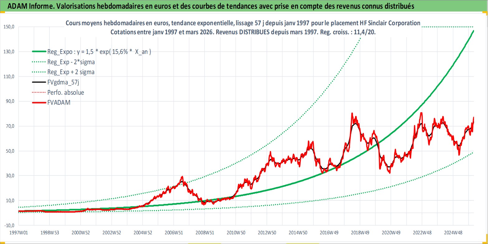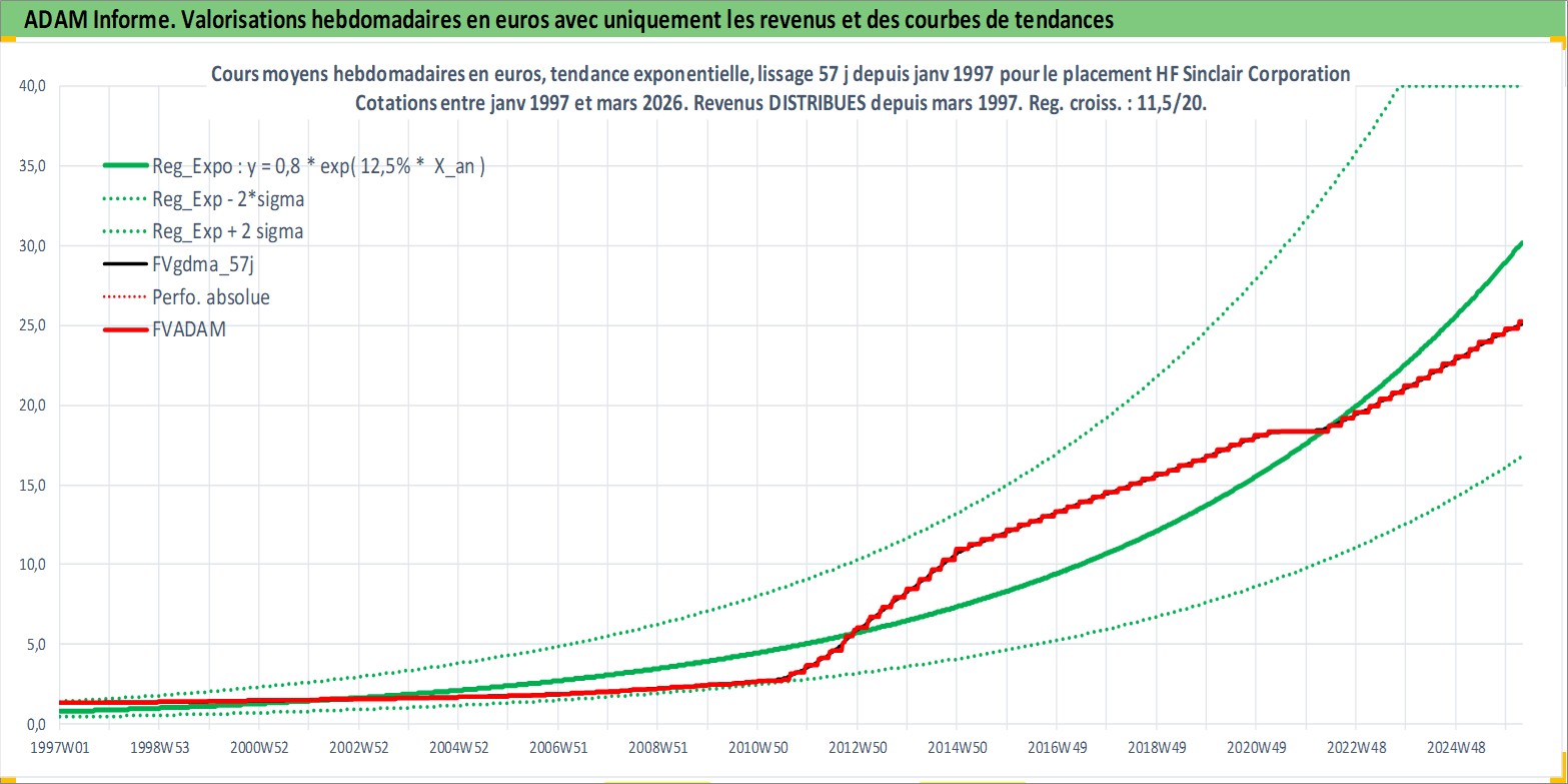 Site dédié aux investisseursPage dédiée sur site financeAnalyse des valorisations hebdomadaires de l'action HF Sinclair Corporation. Cet actif est cote en USD. Les valorisations sont en contrevaleur EURO et couvrent les semaines 1997W01 a 2026W13. Les revenus de cet actif financier sont pris en compte depuis la semaine 1997W12. La note ESG de cet actif n'est pas connue.
