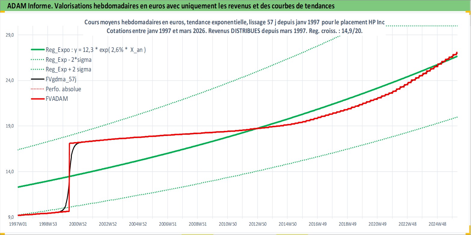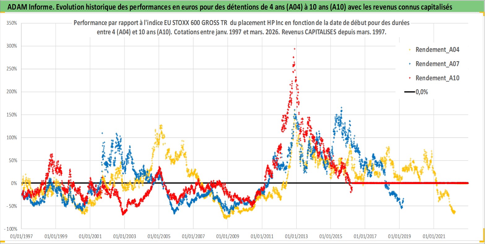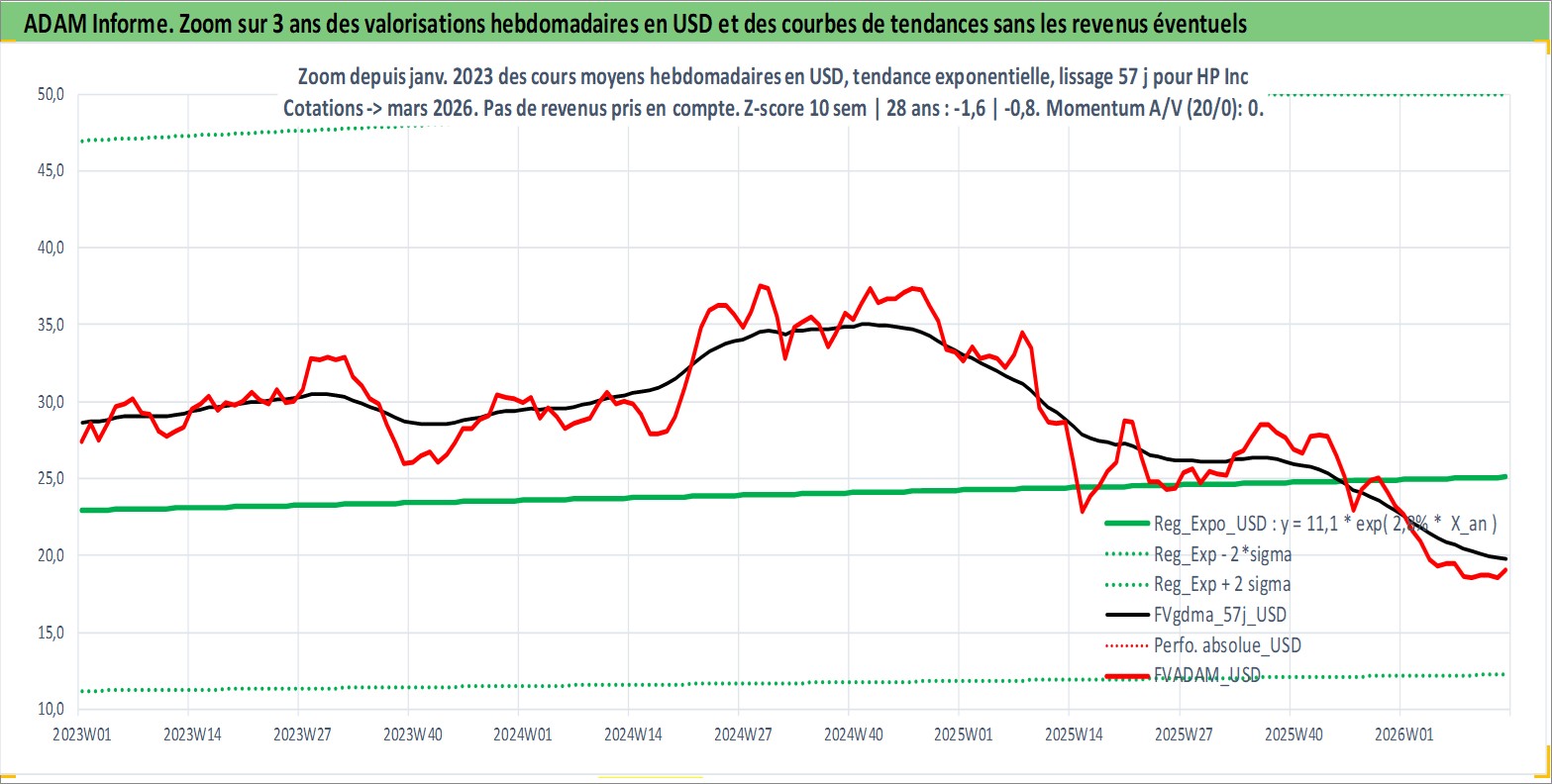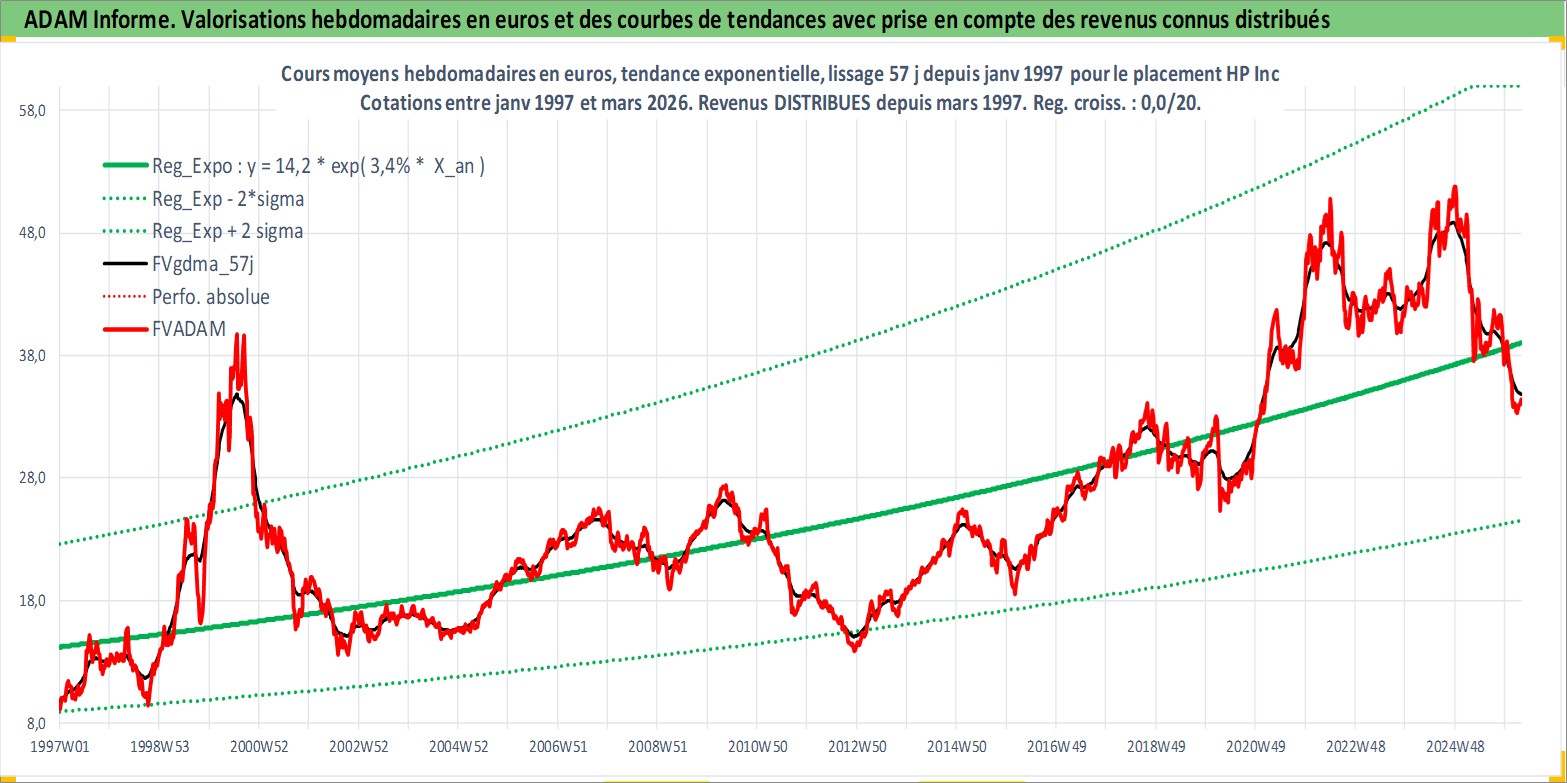 Site dédié aux investisseursPage dédiée sur site financeAnalyse des valorisations hebdomadaires de l'action HP Inc. Cet actif est cote en USD. Les valorisations sont en contrevaleur EURO et couvrent les semaines 1997W01 a 2026W13. Les revenus de cet actif financier sont pris en compte depuis la semaine 1997W13. La note globale ESG de cet actif est estimee a 16.0 (apres rebasage entre 0 et 20).