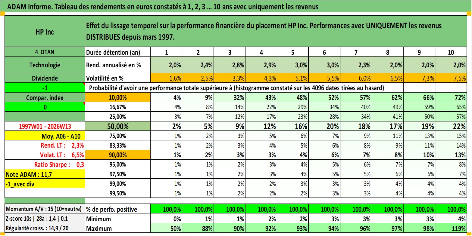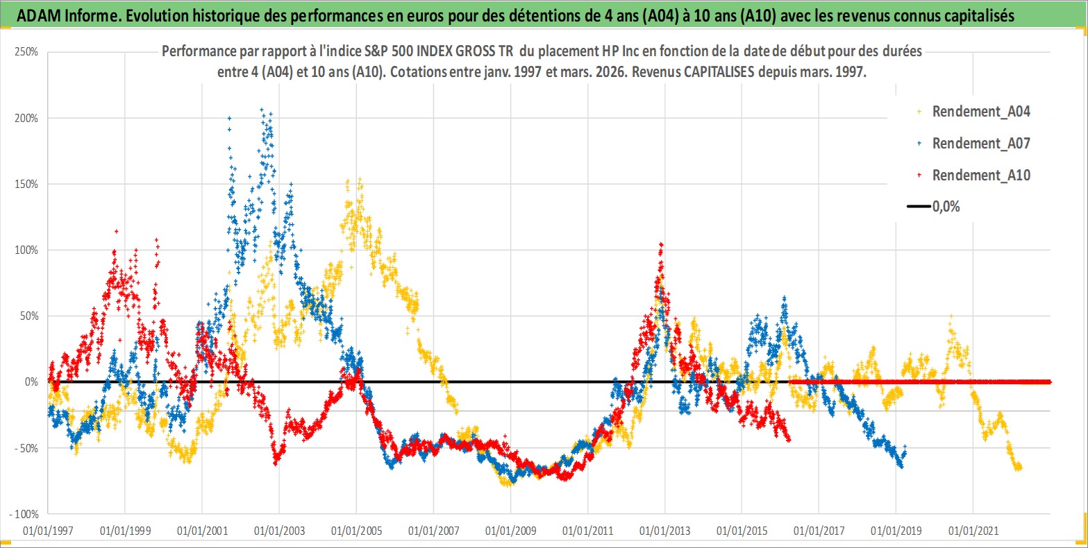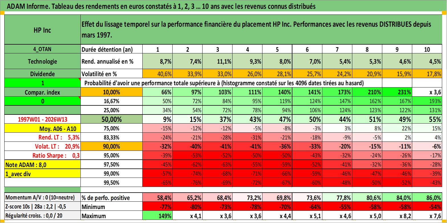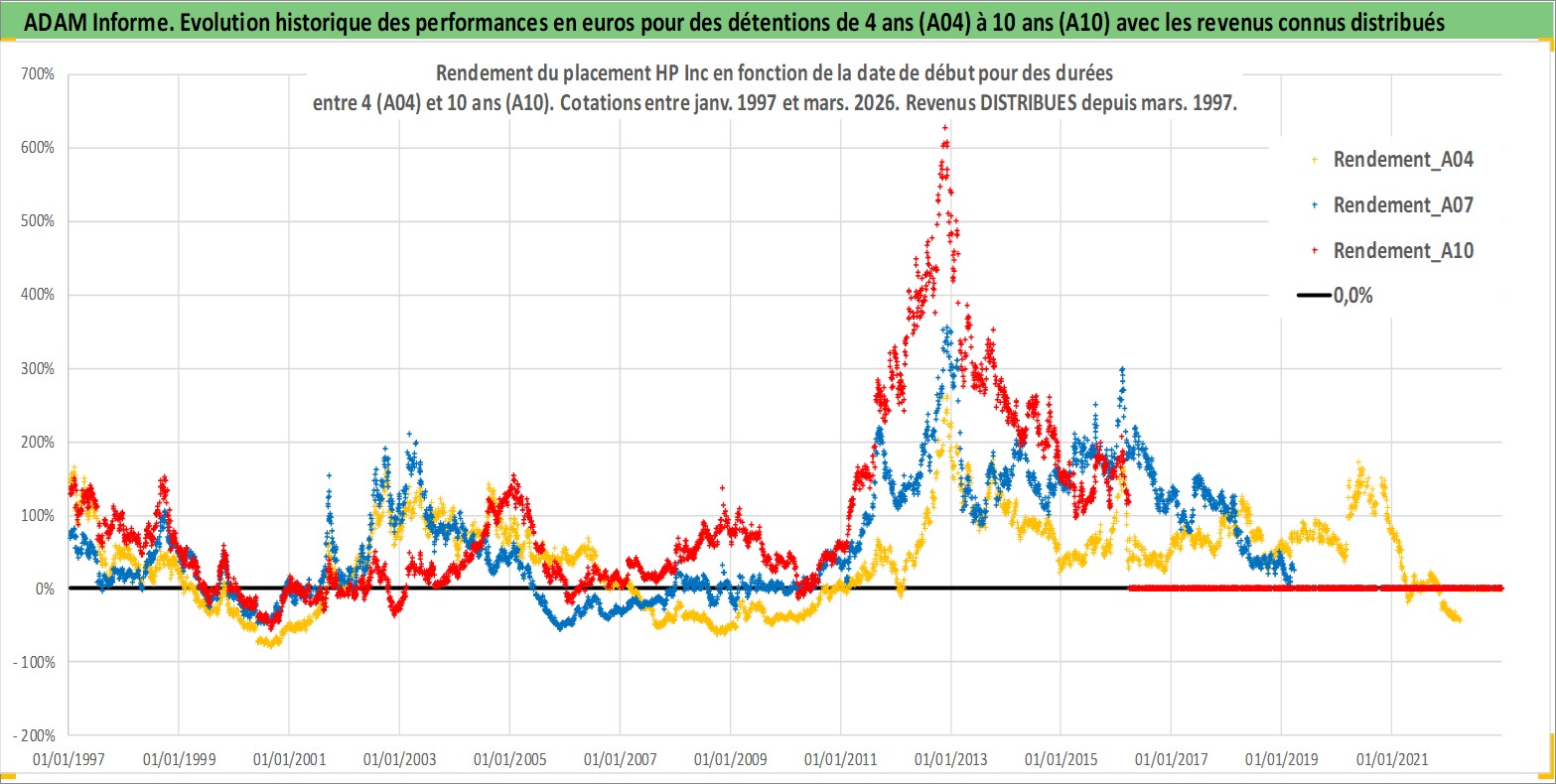 Site dédié aux investisseursPage dédiée sur site financeAnalyse des valorisations hebdomadaires de l'action HP Inc. Cet actif est cote en USD. Les valorisations sont en contrevaleur EURO et couvrent les semaines 1997W01 a 2026W13. Les revenus de cet actif financier sont pris en compte depuis la semaine 1997W13. La note globale ESG de cet actif est estimee a 16.0 (apres rebasage entre 0 et 20).