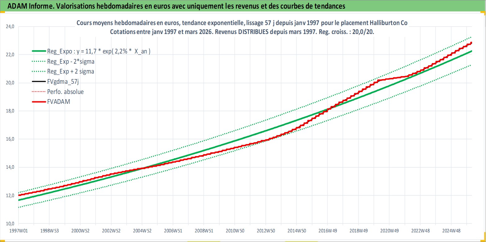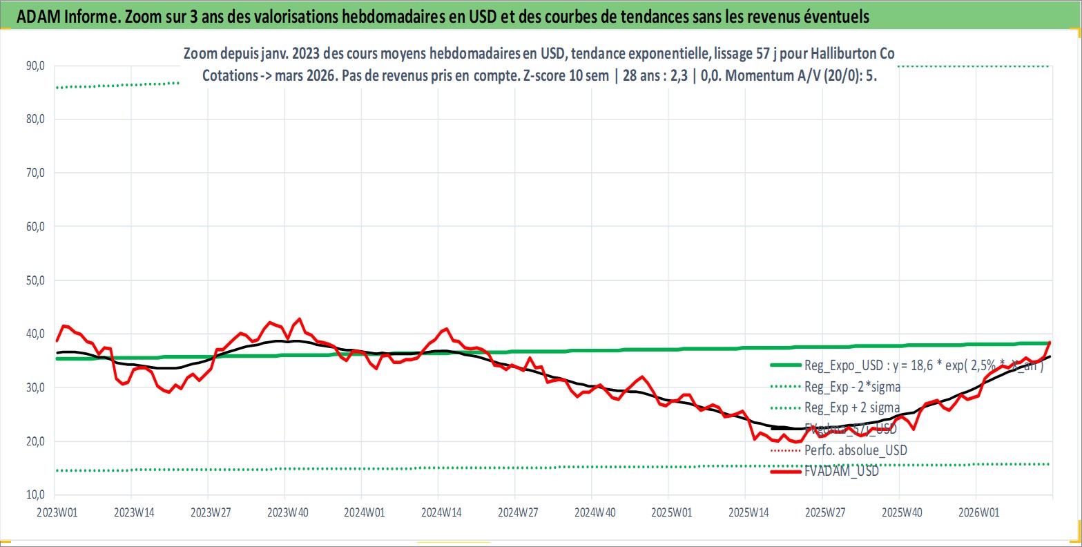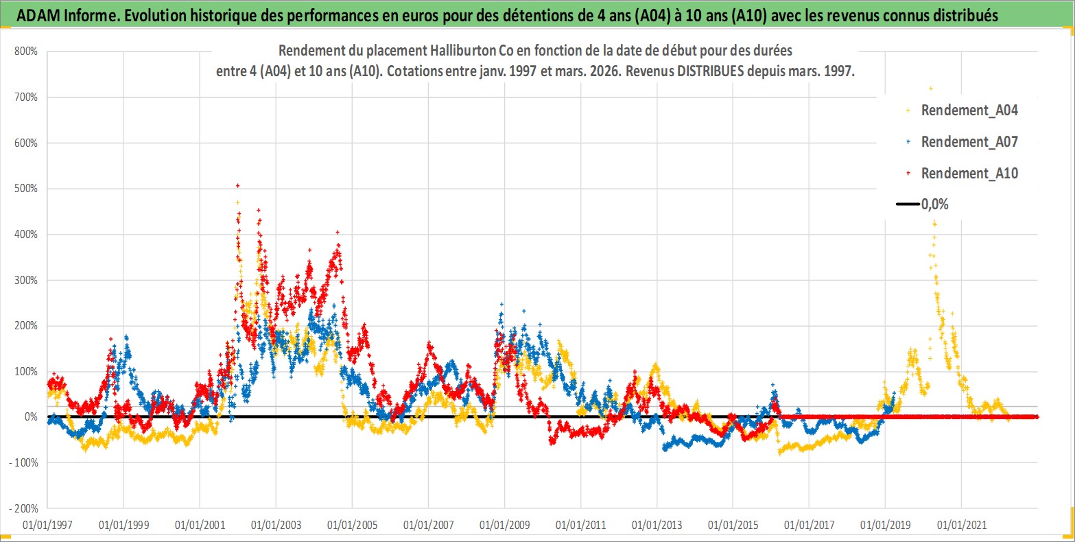 Site dédié aux investisseursPage dédiée sur site financeAnalyse des valorisations hebdomadaires de l'action Halliburton Co. Cet actif est cote en USD. Les valorisations sont en contrevaleur EURO et couvrent les semaines 1997W01 a 2026W13. Les revenus de cet actif financier sont pris en compte depuis la semaine 1997W10. La note globale ESG de cet actif est estimee a 8.0 (apres rebasage entre 0 et 20).