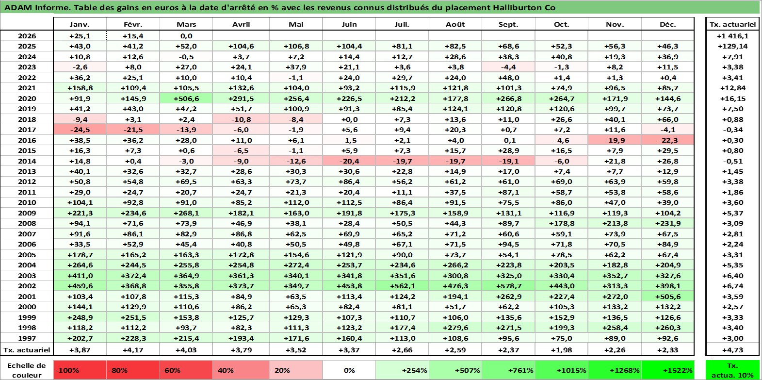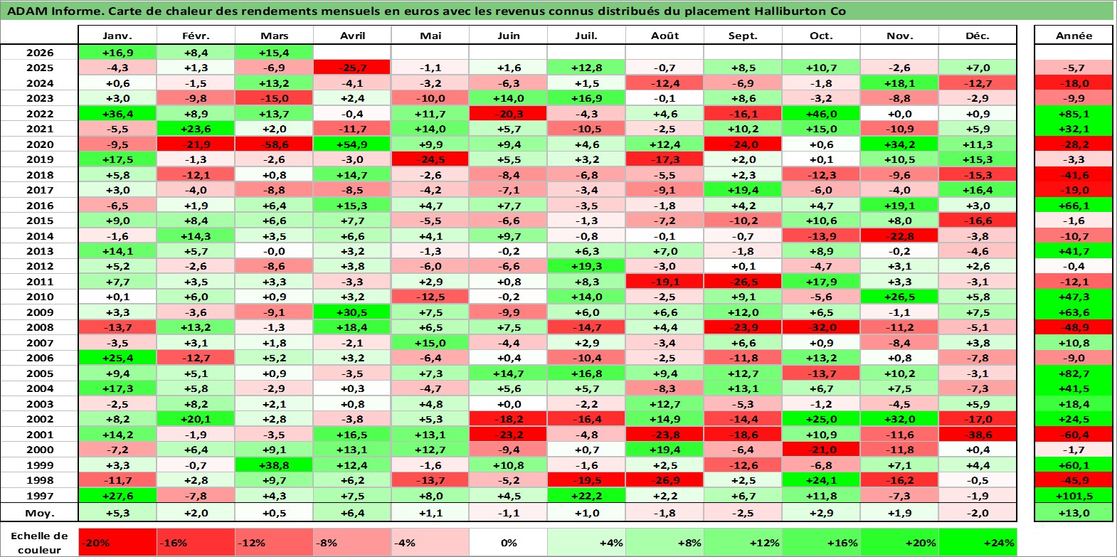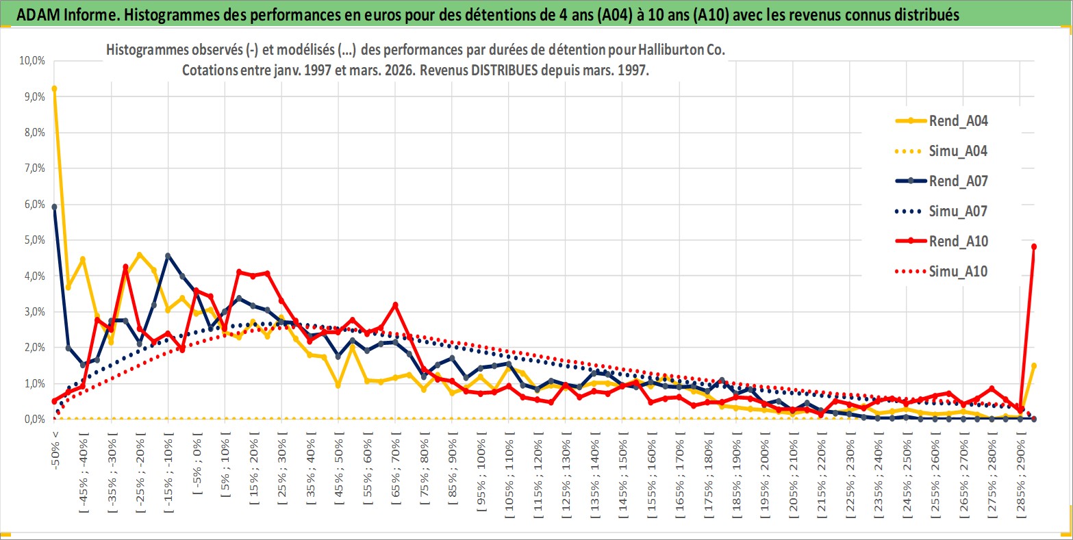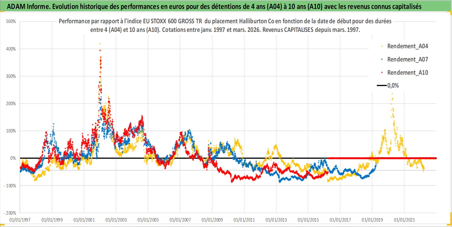 Site dédié aux investisseursPage dédiée sur site financeAnalyse des valorisations hebdomadaires de l'action Halliburton Co. Cet actif est cote en USD. Les valorisations sont en contrevaleur EURO et couvrent les semaines 1997W01 a 2026W13. Les revenus de cet actif financier sont pris en compte depuis la semaine 1997W10. La note globale ESG de cet actif est estimee a 8.0 (apres rebasage entre 0 et 20).