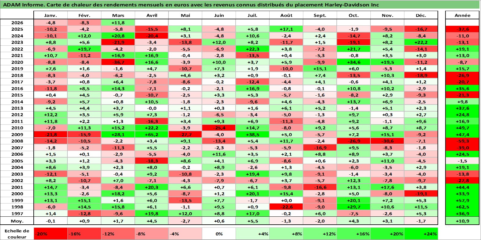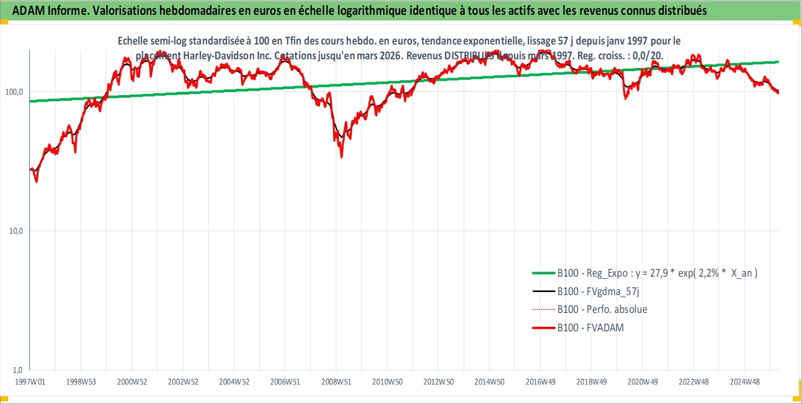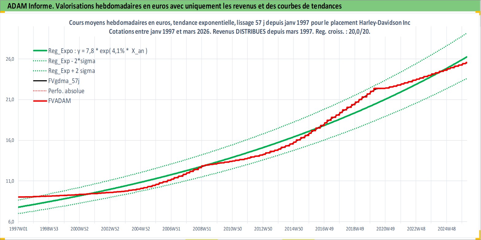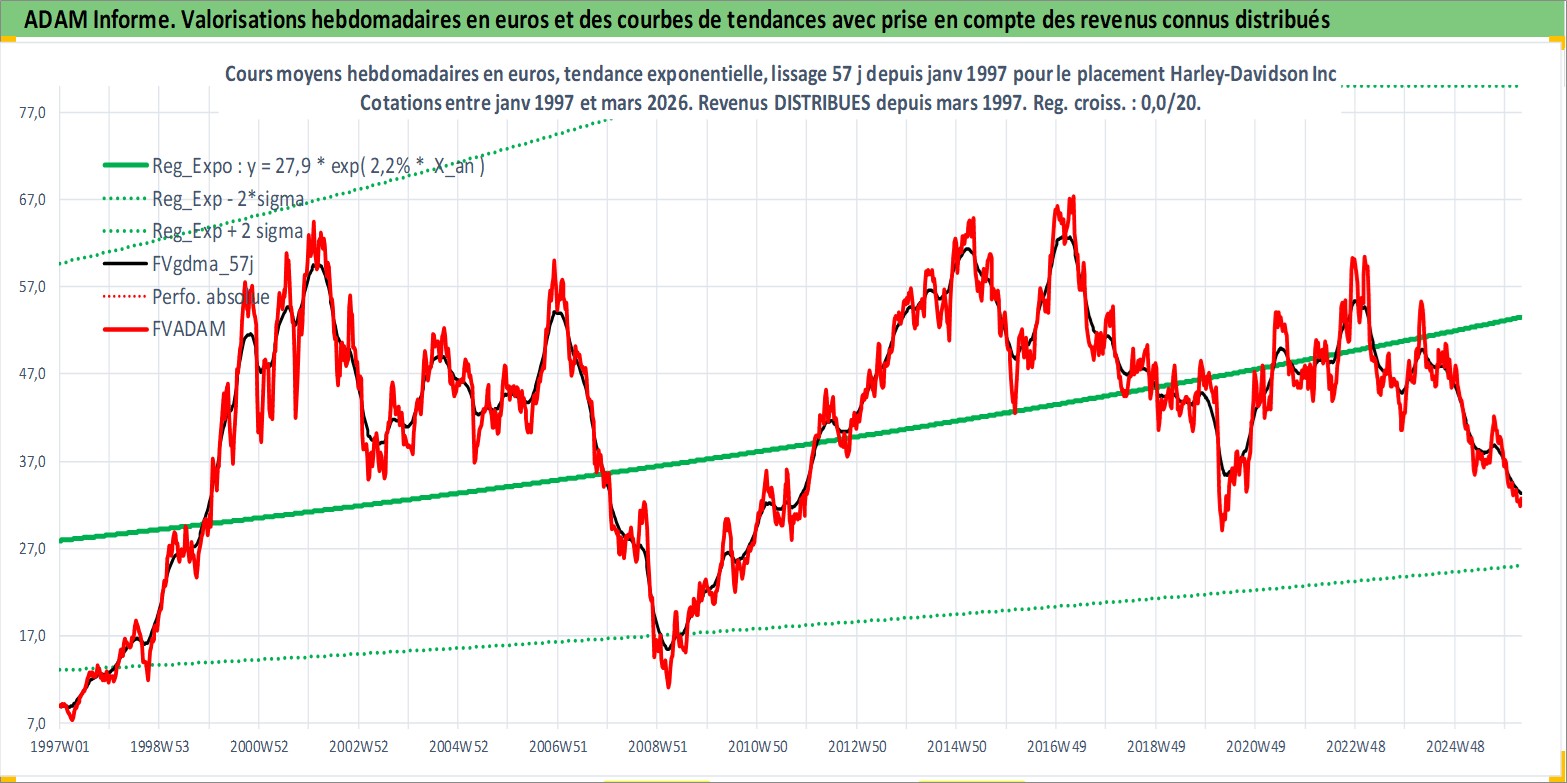 Site dédié aux investisseursPage dédiée sur site financeAnalyse des valorisations hebdomadaires de l'action Harley-Davidson Inc. Cet actif est cote en USD. Les valorisations sont en contrevaleur EURO et couvrent les semaines 1997W01 a 2026W13. Les revenus de cet actif financier sont pris en compte depuis la semaine 1997W11. La note globale ESG de cet actif est estimee a 13.0 (apres rebasage entre 0 et 20).