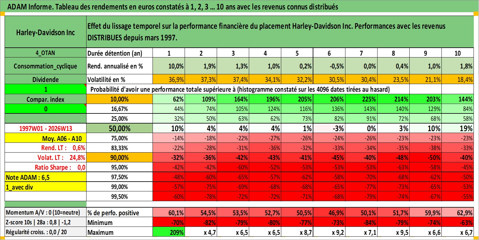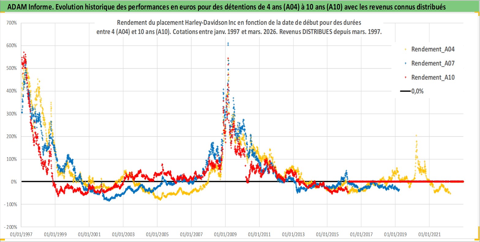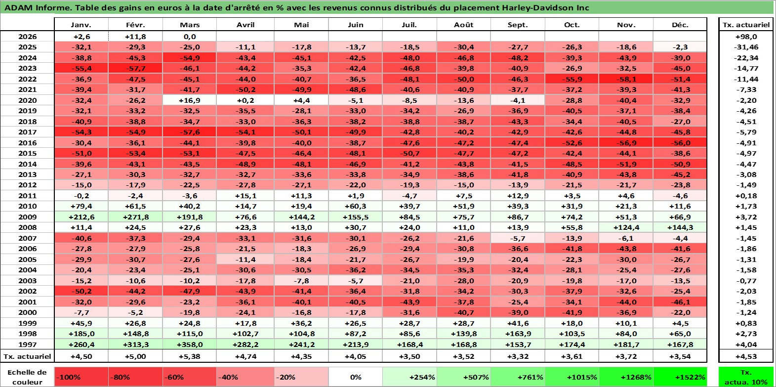 Site dédié aux investisseursPage dédiée sur site financeAnalyse des valorisations hebdomadaires de l'action Harley-Davidson Inc. Cet actif est cote en USD. Les valorisations sont en contrevaleur EURO et couvrent les semaines 1997W01 a 2026W13. Les revenus de cet actif financier sont pris en compte depuis la semaine 1997W11. La note globale ESG de cet actif est estimee a 13.0 (apres rebasage entre 0 et 20).