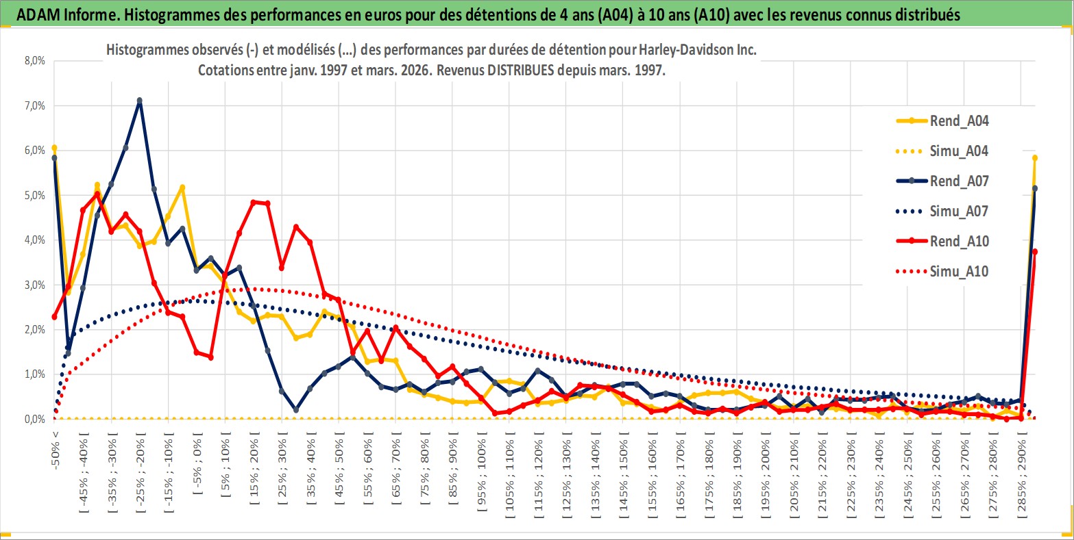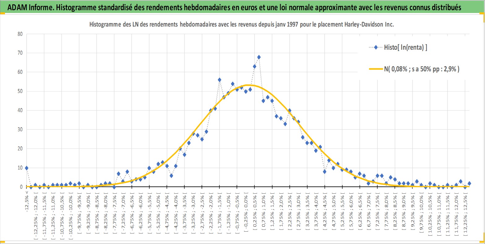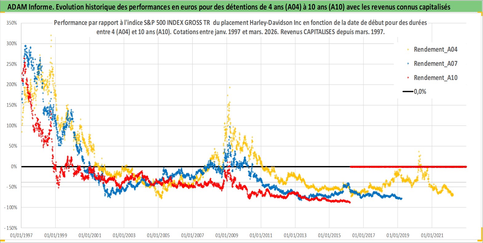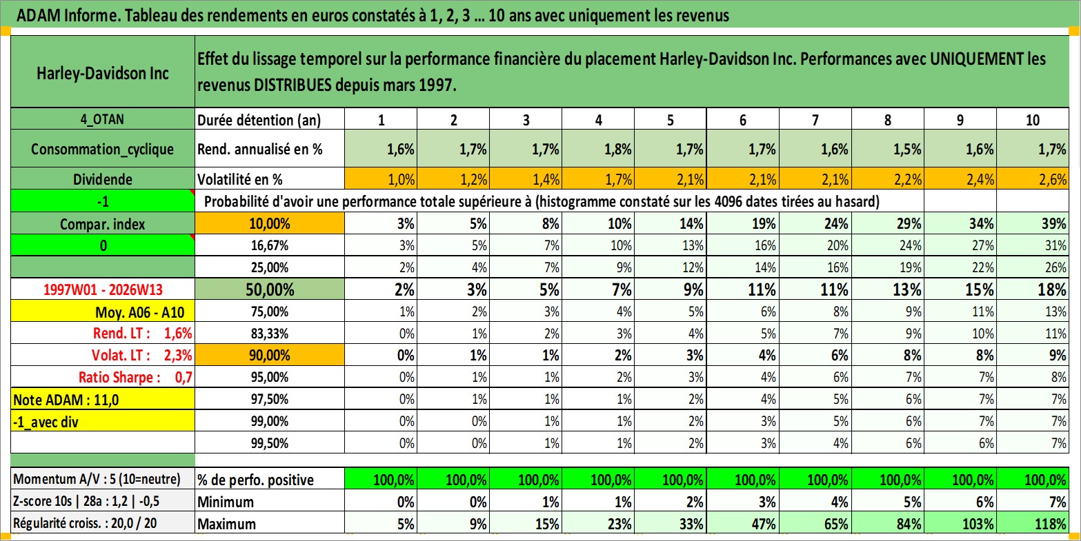 Site dédié aux investisseursPage dédiée sur site financeAnalyse des valorisations hebdomadaires de l'action Harley-Davidson Inc. Cet actif est cote en USD. Les valorisations sont en contrevaleur EURO et couvrent les semaines 1997W01 a 2026W13. Les revenus de cet actif financier sont pris en compte depuis la semaine 1997W11. La note globale ESG de cet actif est estimee a 13.0 (apres rebasage entre 0 et 20).
