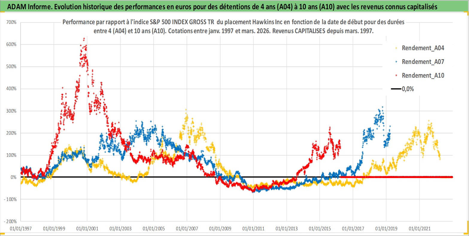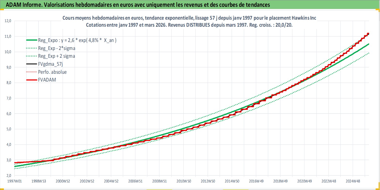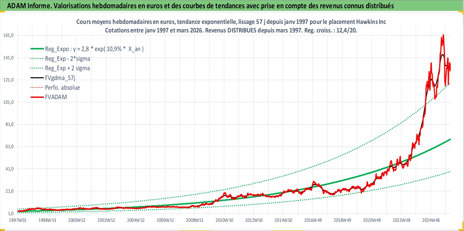 Site dédié aux investisseursPage dédiée sur site financeAnalyse des valorisations hebdomadaires de l'action Hawkins Inc. Cet actif est cote en USD. Les valorisations sont en contrevaleur EURO et couvrent les semaines 1997W01 a 2026W13. Les revenus de cet actif financier sont pris en compte depuis la semaine 1997W13. La note ESG de cet actif n'est pas connue.