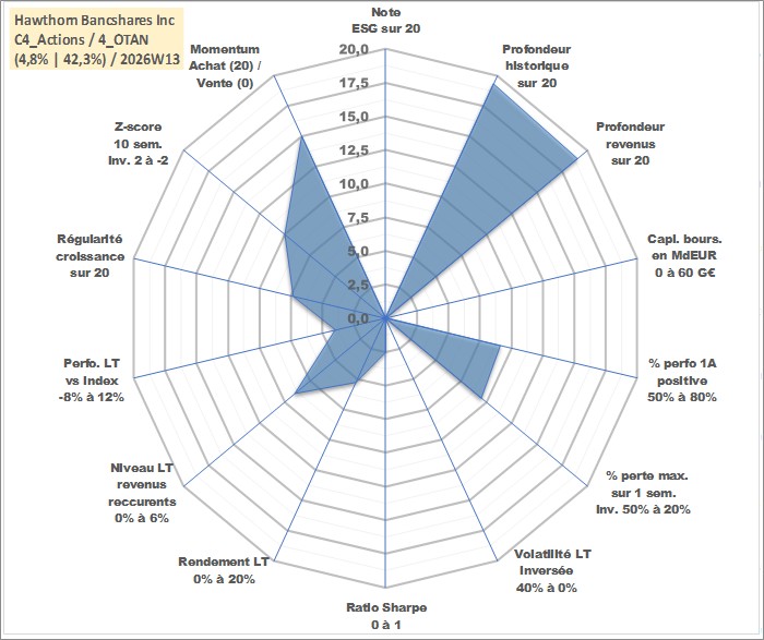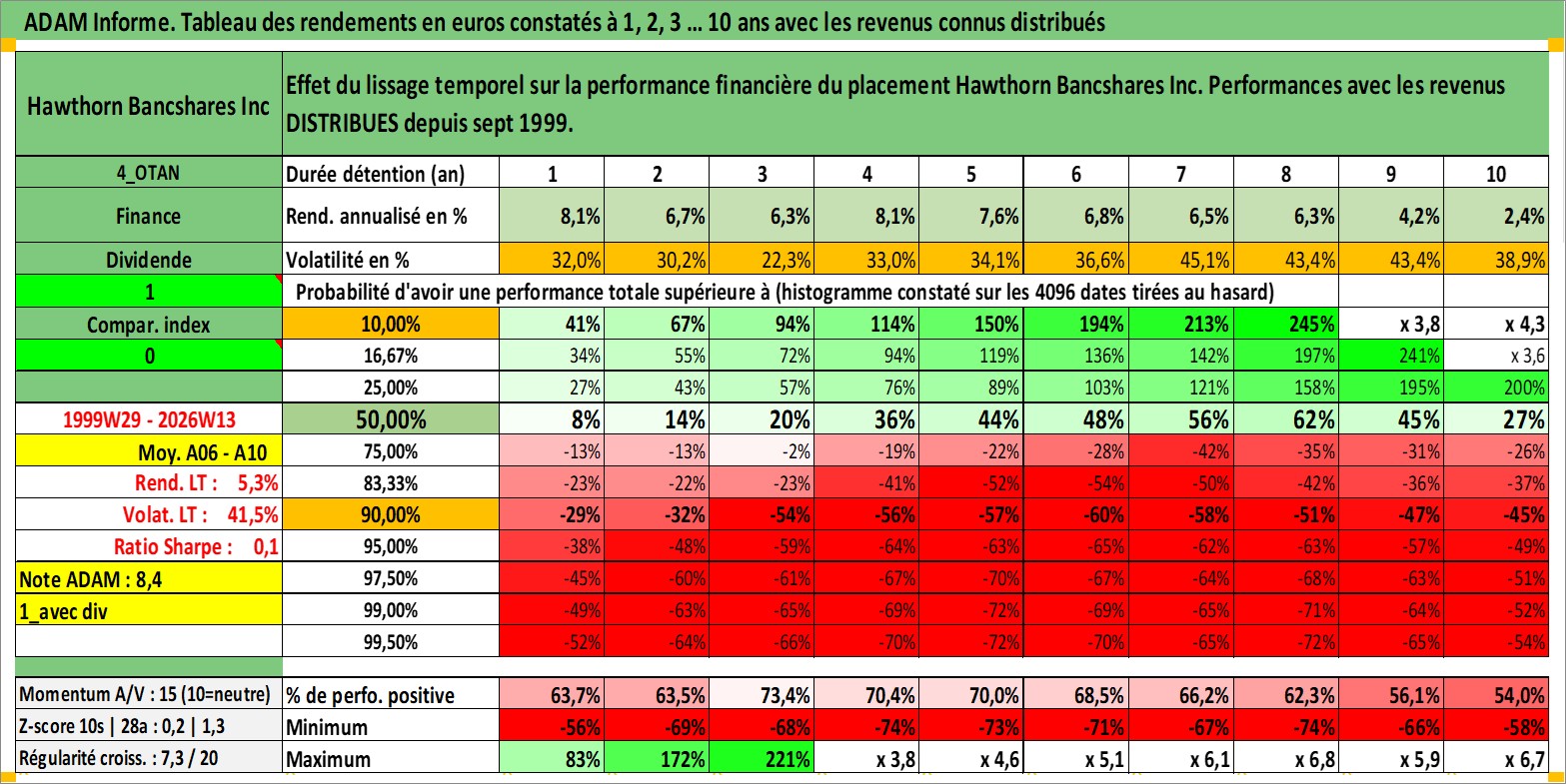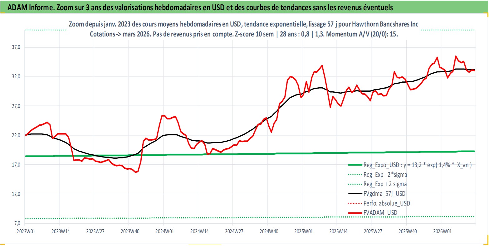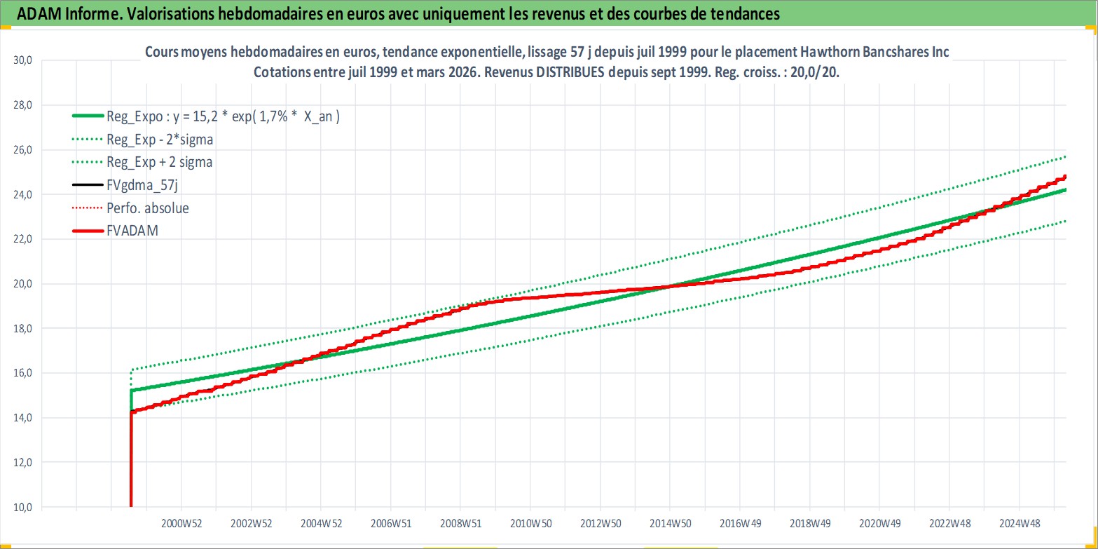 Site dédié aux investisseursPage dédiée sur site financeAnalyse des valorisations hebdomadaires de l'action Hawthorn Bancshares Inc. Cet actif est cote en USD. Les valorisations sont en contrevaleur EURO et couvrent les semaines 1999W29 a 2026W13. Les revenus de cet actif financier sont pris en compte depuis la semaine 1999W37. La note ESG de cet actif n'est pas connue.
