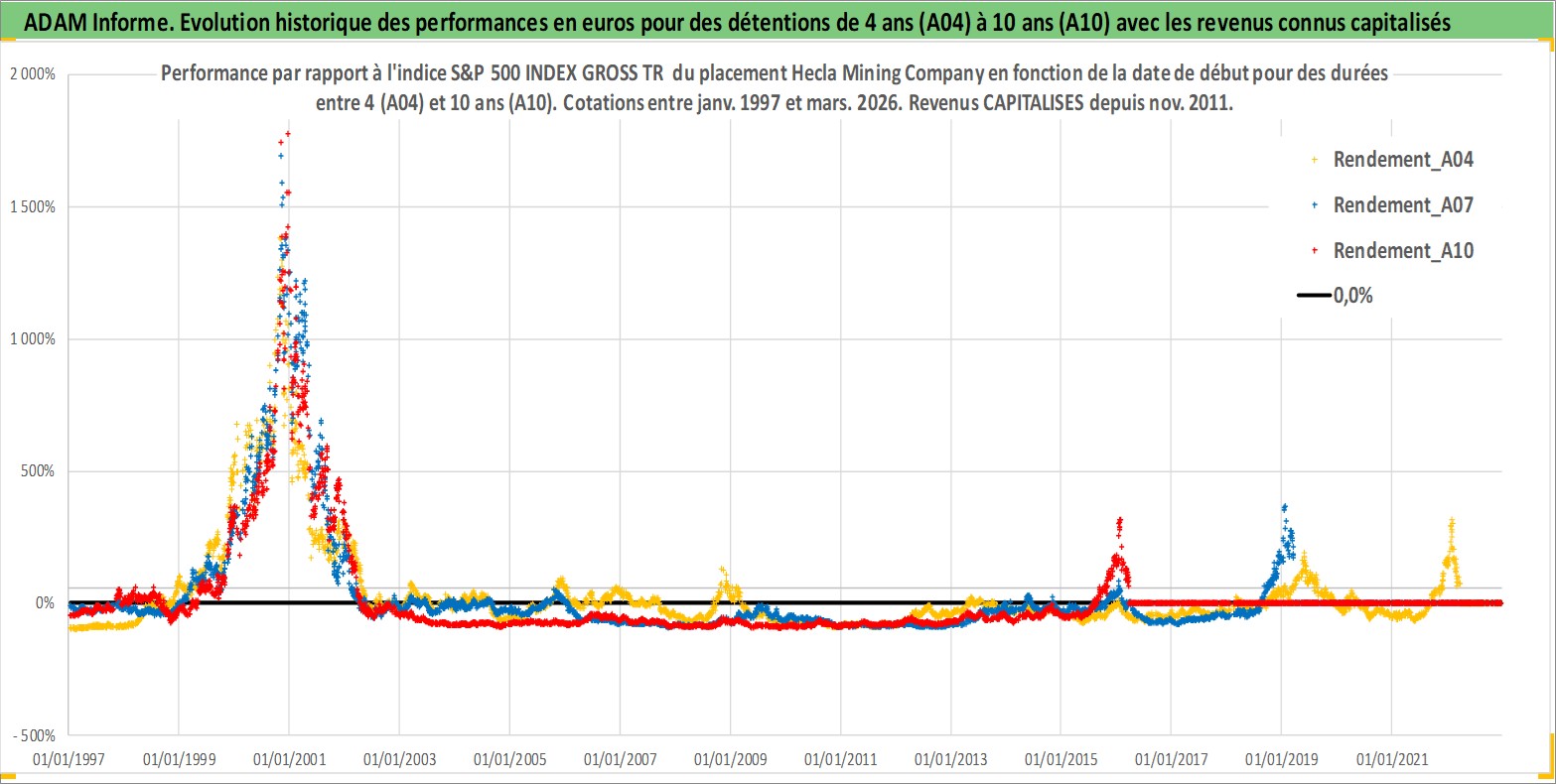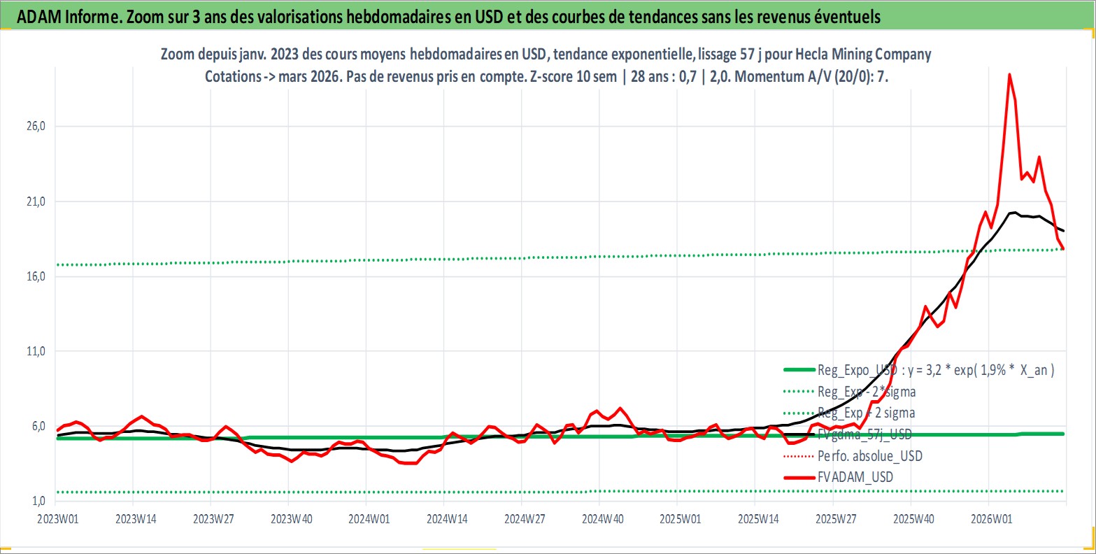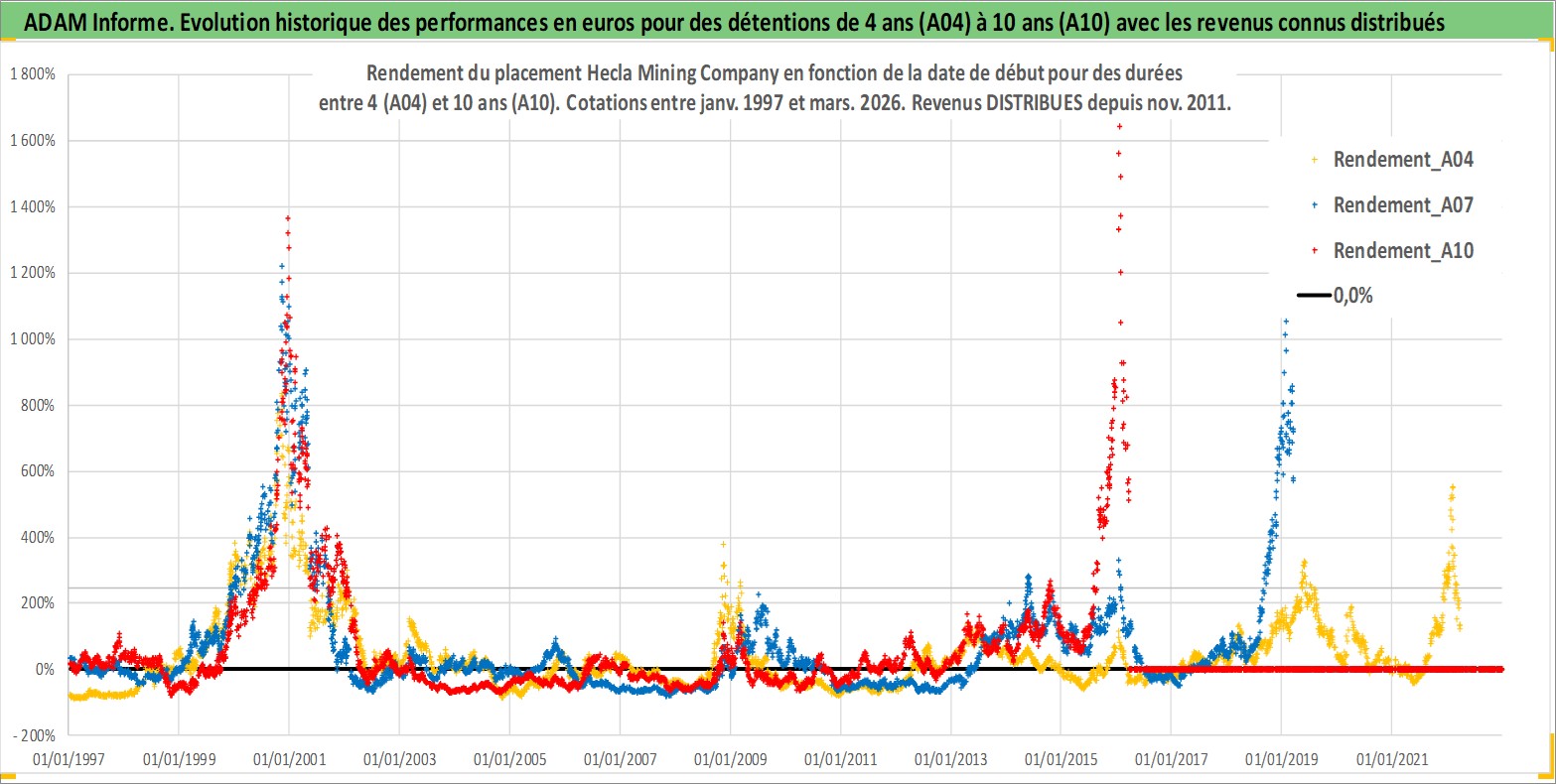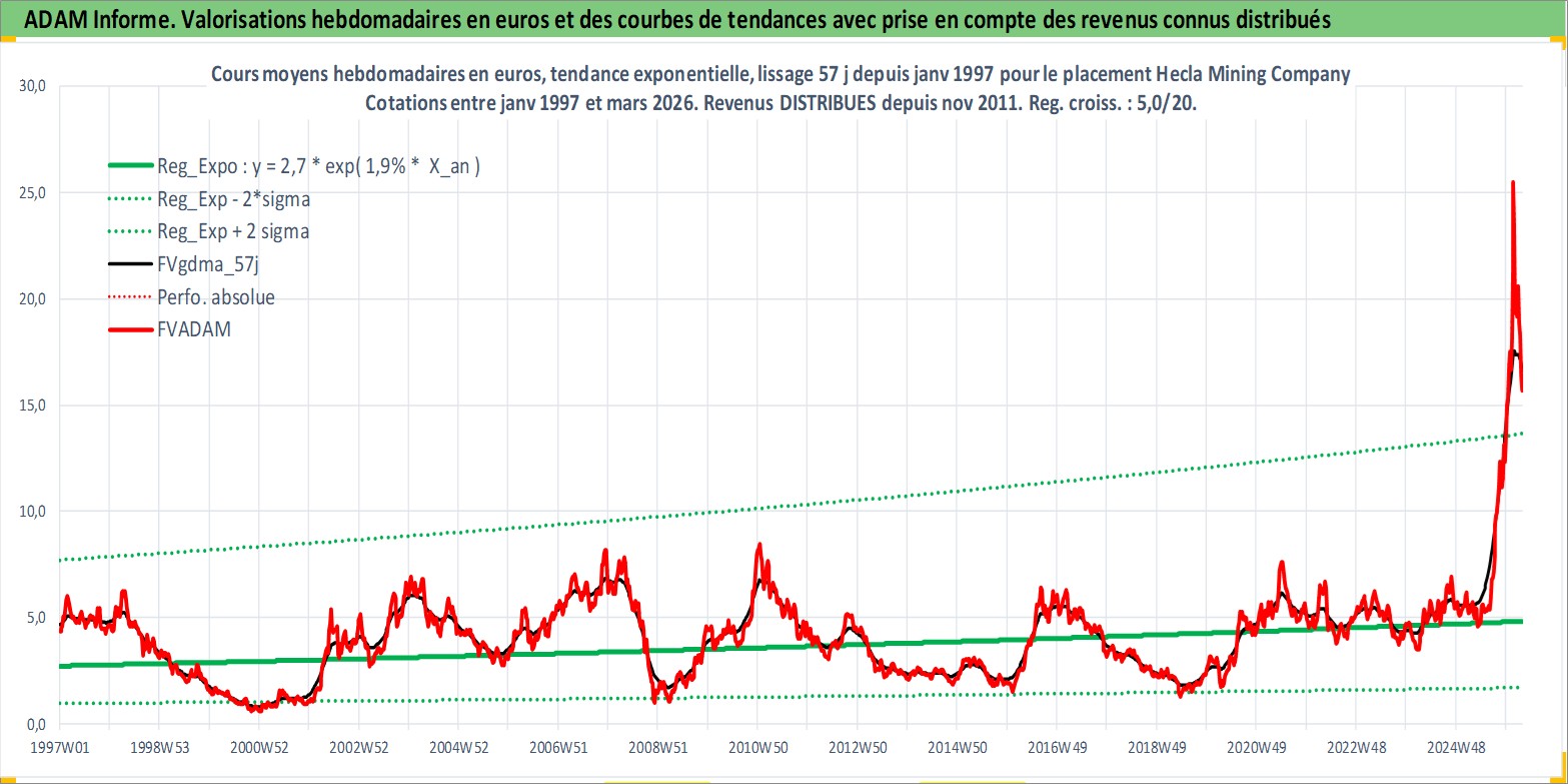 Site dédié aux investisseursPage dédiée sur site financeAnalyse des valorisations hebdomadaires de l'action Hecla Mining Company. Cet actif est cote en USD. Les valorisations sont en contrevaleur EURO et couvrent les semaines 1997W01 a 2026W13. Les revenus de cet actif financier sont pris en compte depuis la semaine 2011W46. La note ESG de cet actif n'est pas connue.