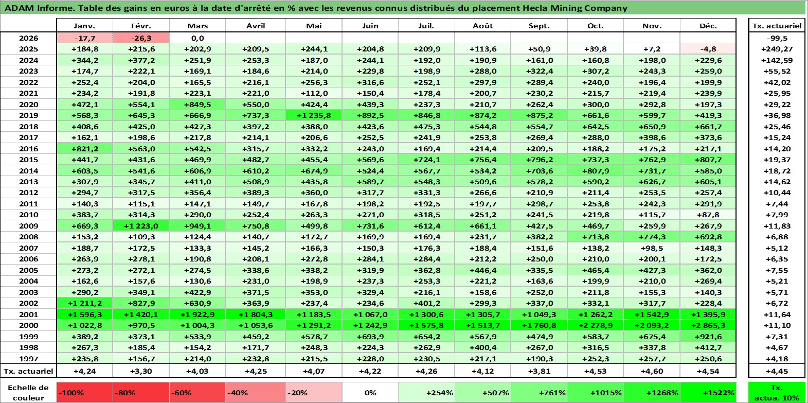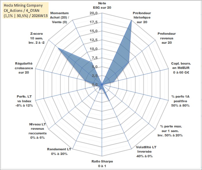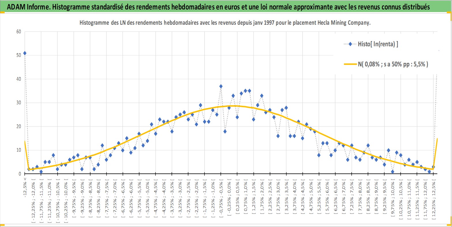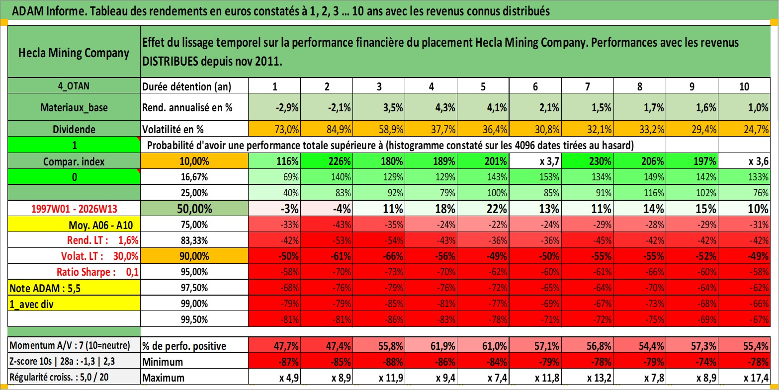 Site dédié aux investisseursPage dédiée sur site financeAnalyse des valorisations hebdomadaires de l'action Hecla Mining Company. Cet actif est cote en USD. Les valorisations sont en contrevaleur EURO et couvrent les semaines 1997W01 a 2026W13. Les revenus de cet actif financier sont pris en compte depuis la semaine 2011W46. La note ESG de cet actif n'est pas connue.