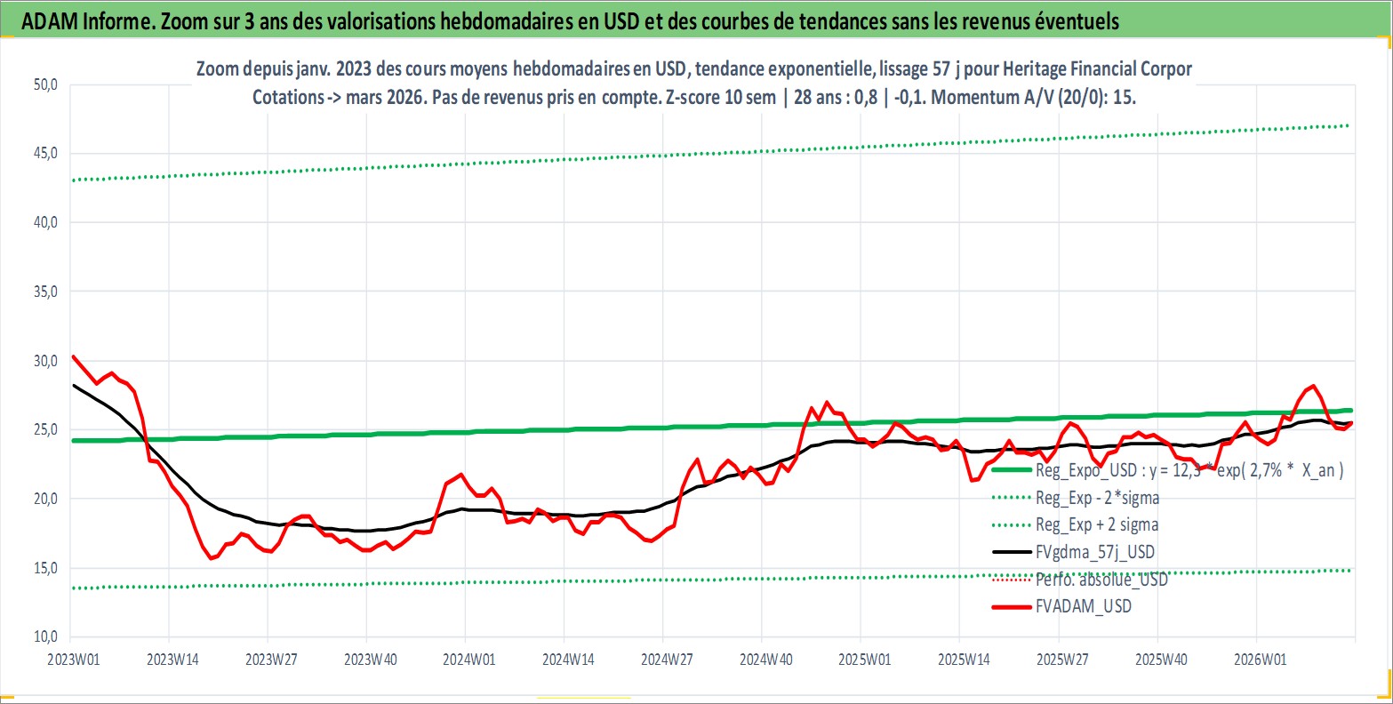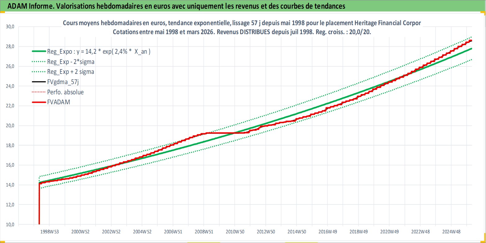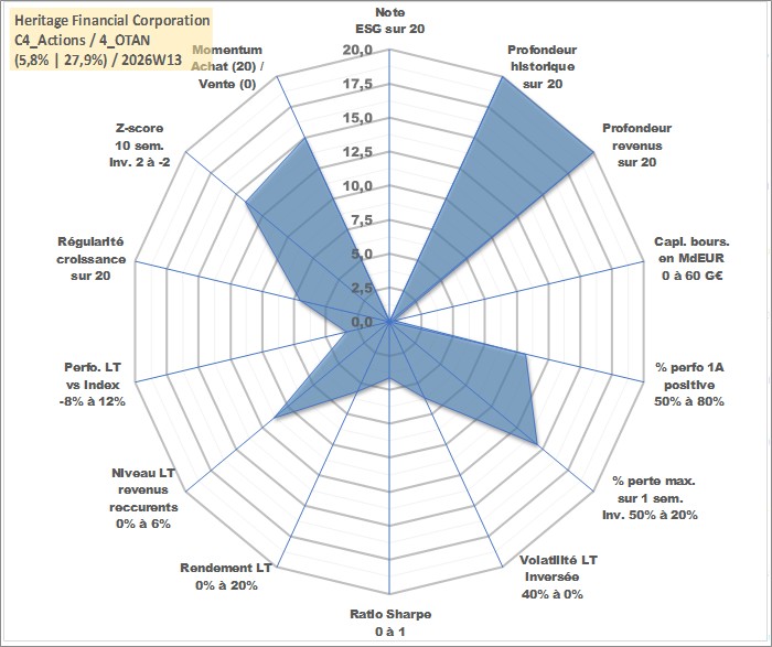 Site dédié aux investisseursPage dédiée sur site financeAnalyse des valorisations hebdomadaires de l'action Heritage Financial Corporation. Cet actif est cote en USD. Les valorisations sont en contrevaleur EURO et couvrent les semaines 1998W19 a 2026W13. Les revenus de cet actif financier sont pris en compte depuis la semaine 1998W27. La note ESG de cet actif n'est pas connue.