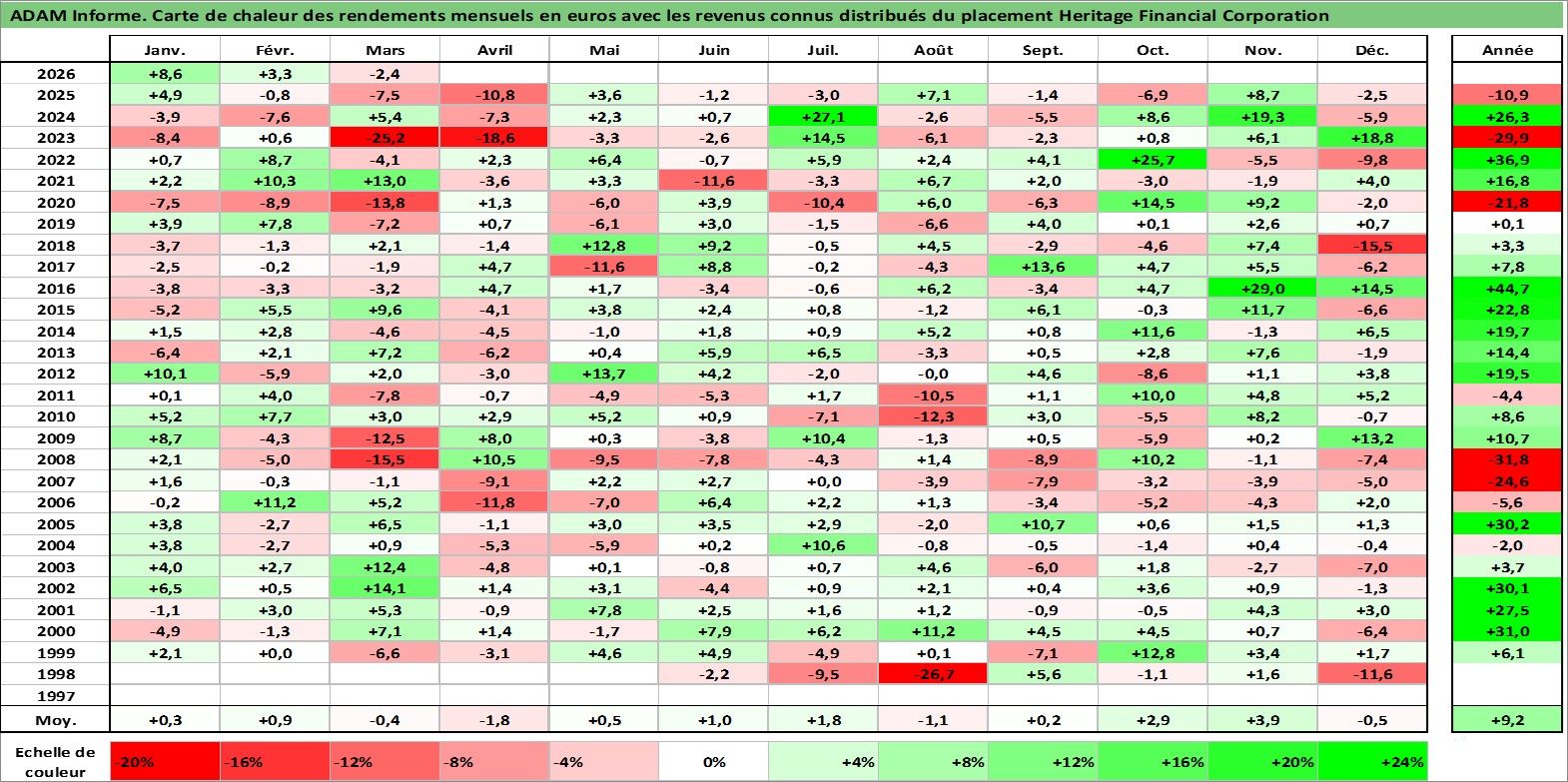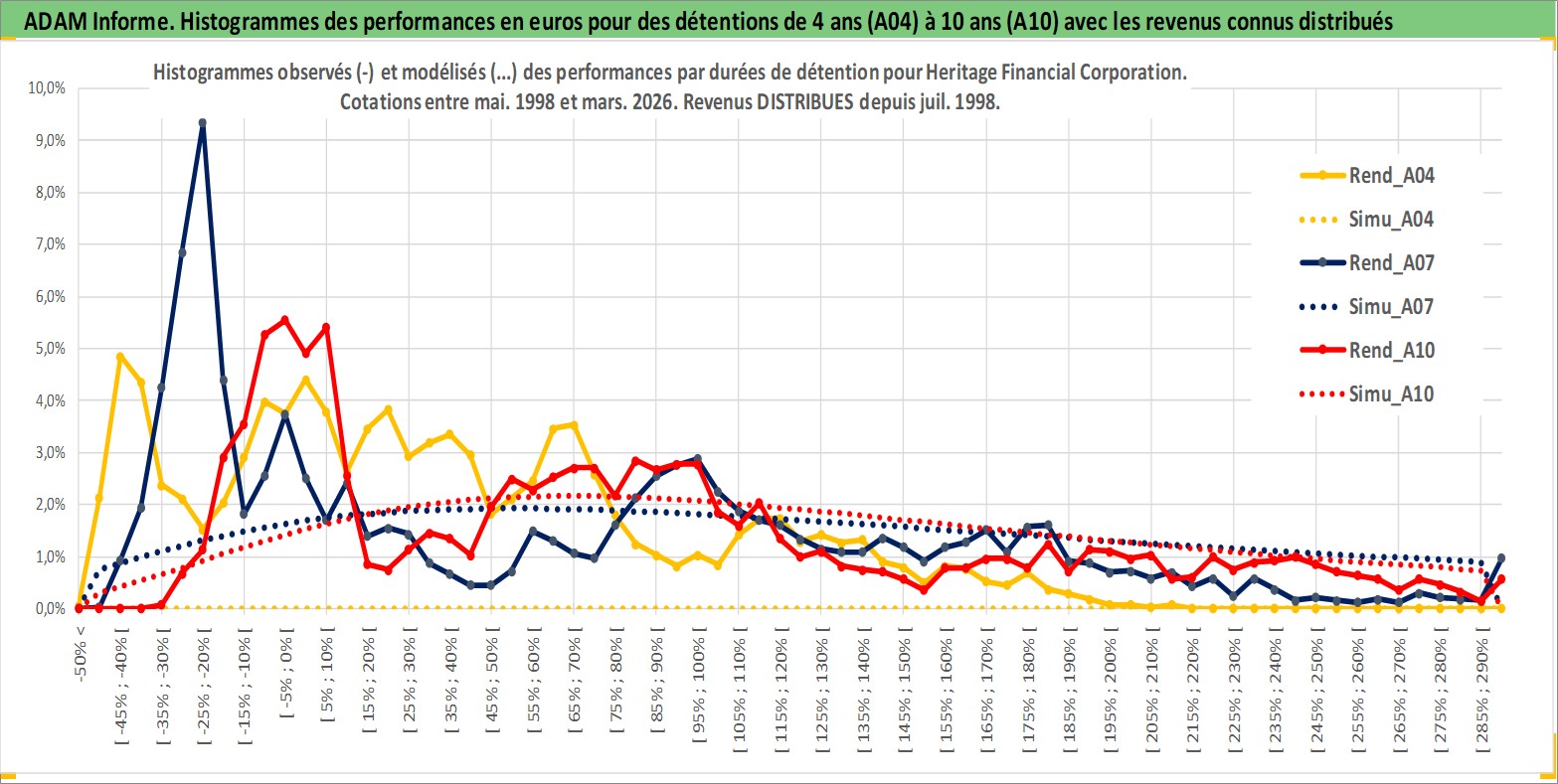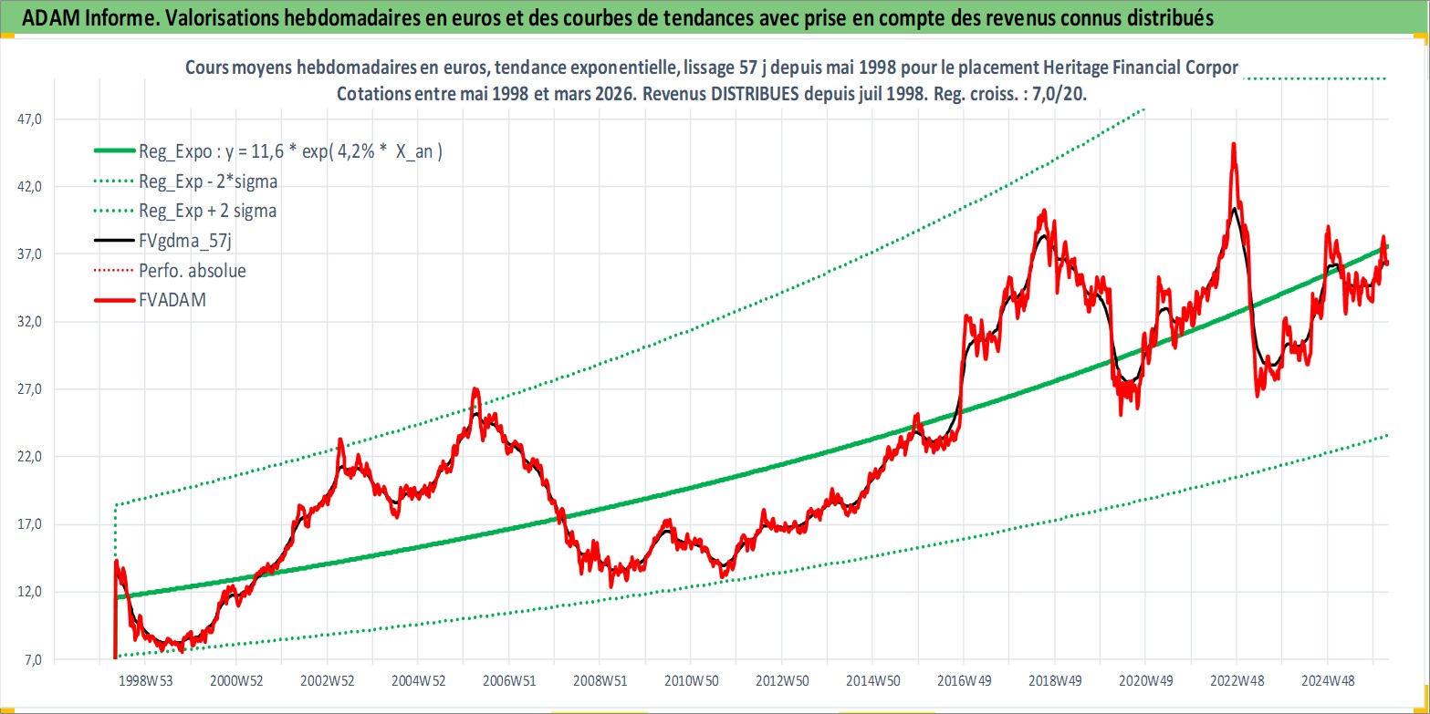 Site dédié aux investisseursPage dédiée sur site financeAnalyse des valorisations hebdomadaires de l'action Heritage Financial Corporation. Cet actif est cote en USD. Les valorisations sont en contrevaleur EURO et couvrent les semaines 1998W19 a 2026W13. Les revenus de cet actif financier sont pris en compte depuis la semaine 1998W27. La note ESG de cet actif n'est pas connue.