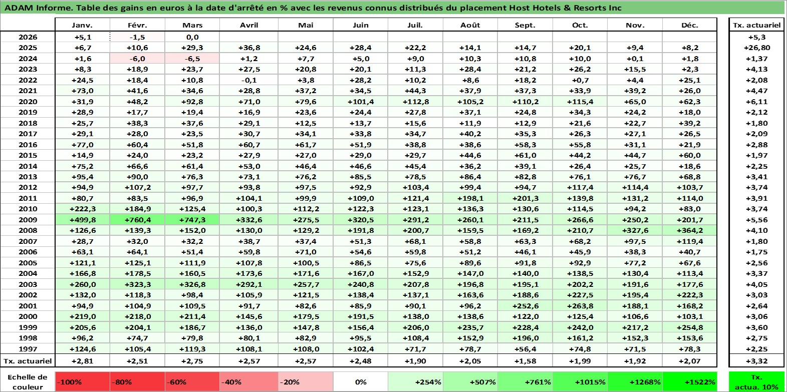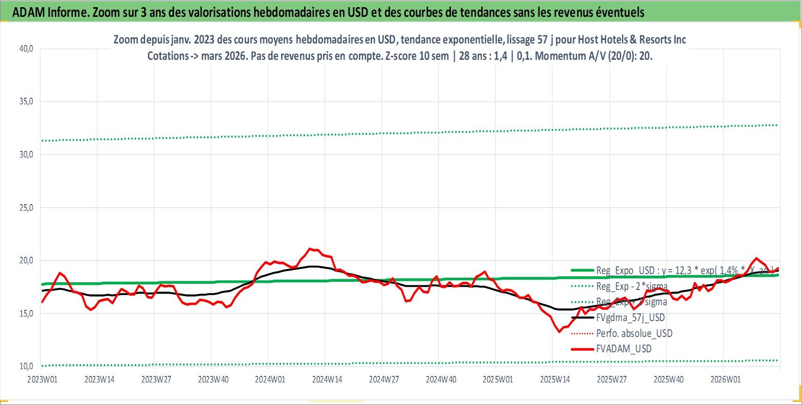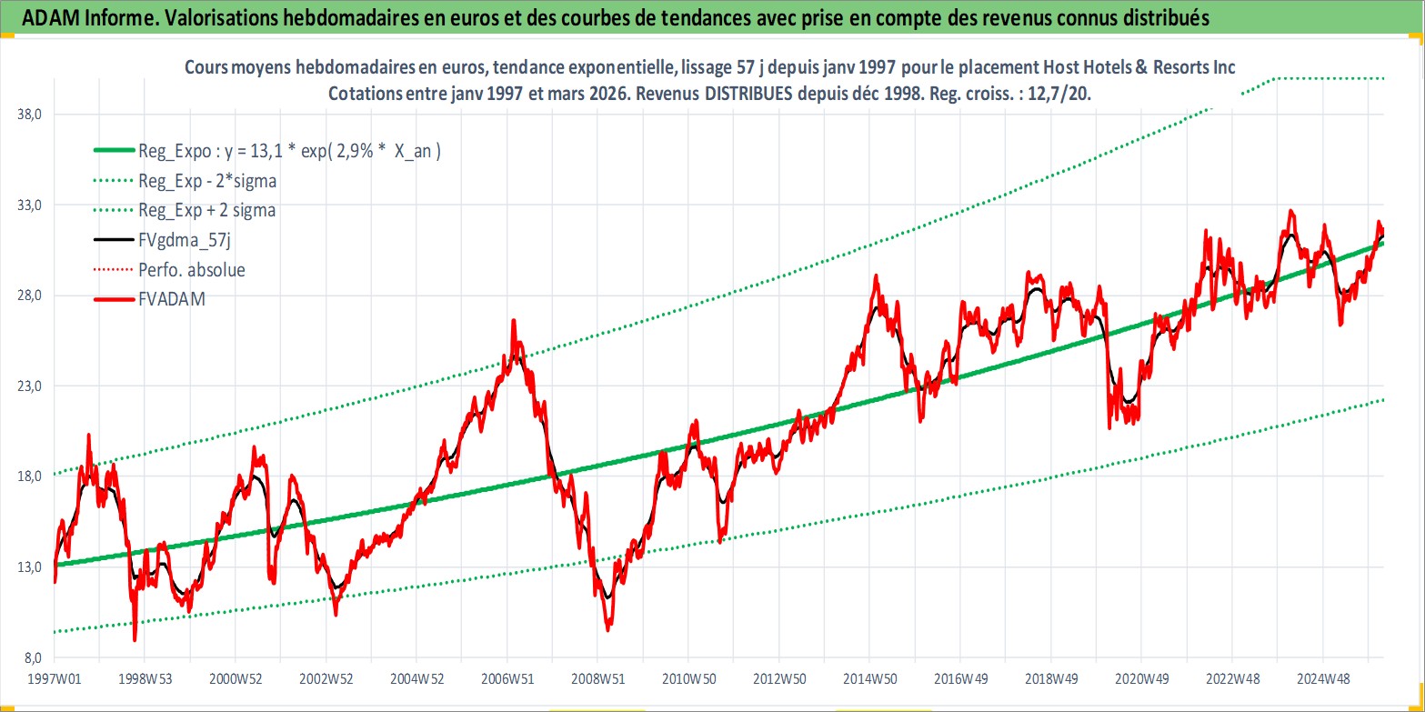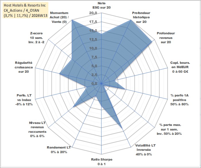 Site dédié aux investisseursPage dédiée sur site financeAnalyse des valorisations hebdomadaires de l'action Host Hotels & Resorts Inc. Cet actif est cote en USD. Les valorisations sont en contrevaleur EURO et couvrent les semaines 1997W01 a 2026W13. Les revenus de cet actif financier sont pris en compte depuis la semaine 1998W52. La note globale ESG de cet actif est estimee a 14.0 (apres rebasage entre 0 et 20).