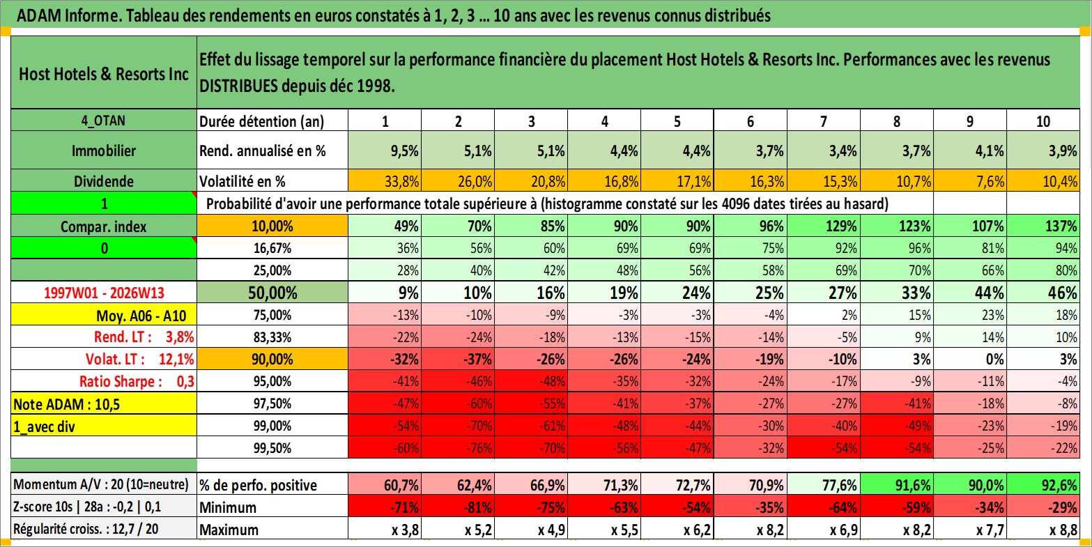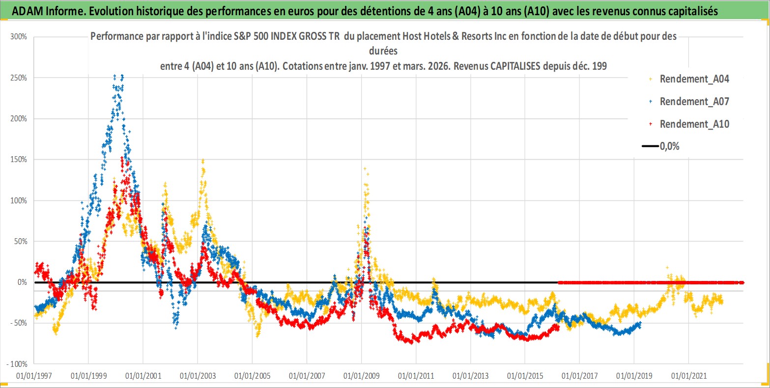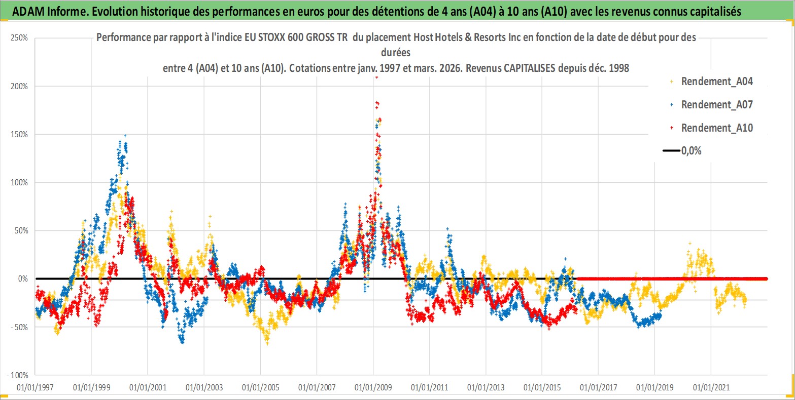 Site dédié aux investisseursPage dédiée sur site financeAnalyse des valorisations hebdomadaires de l'action Host Hotels & Resorts Inc. Cet actif est cote en USD. Les valorisations sont en contrevaleur EURO et couvrent les semaines 1997W01 a 2026W13. Les revenus de cet actif financier sont pris en compte depuis la semaine 1998W52. La note globale ESG de cet actif est estimee a 14.0 (apres rebasage entre 0 et 20).