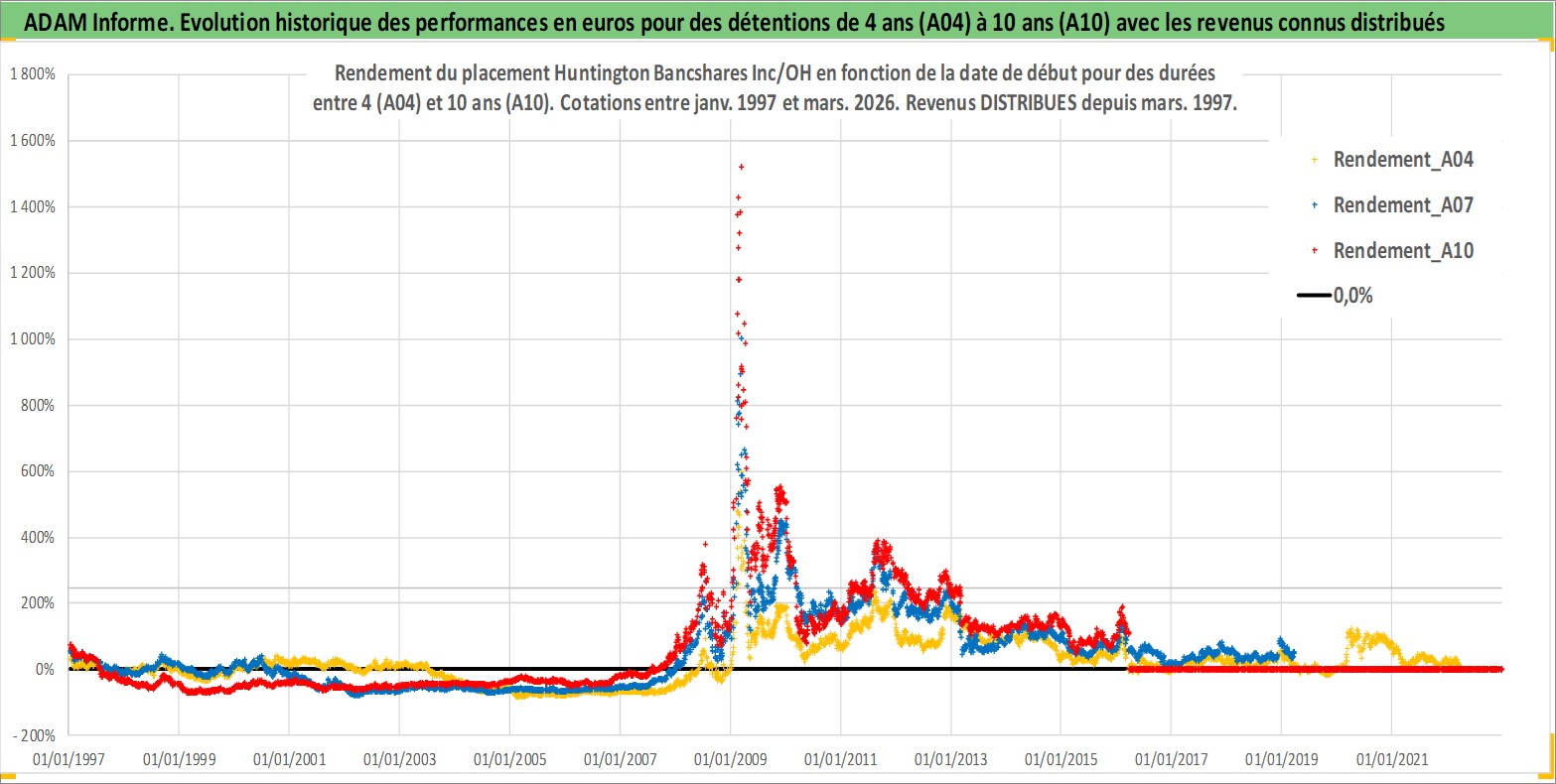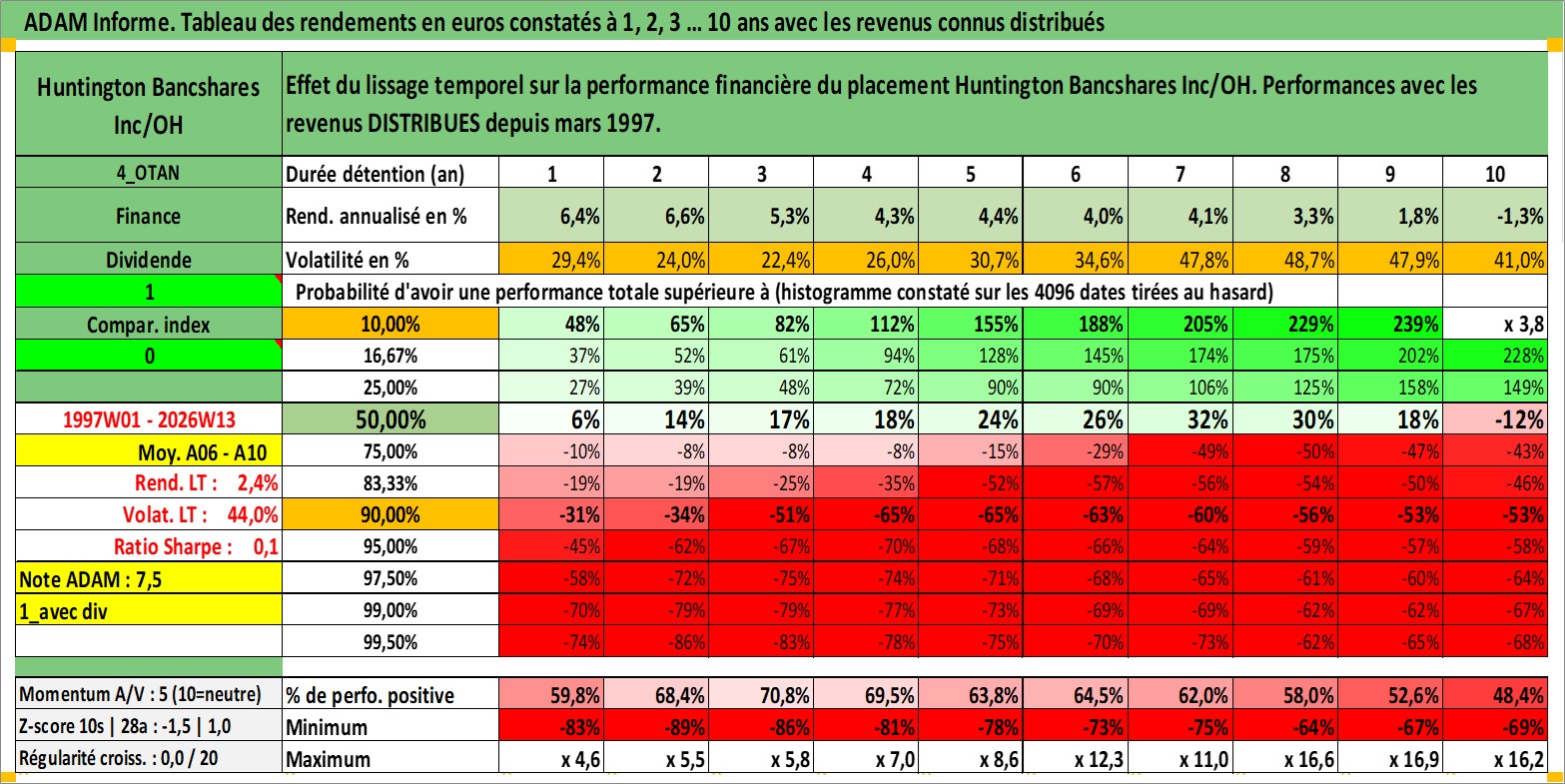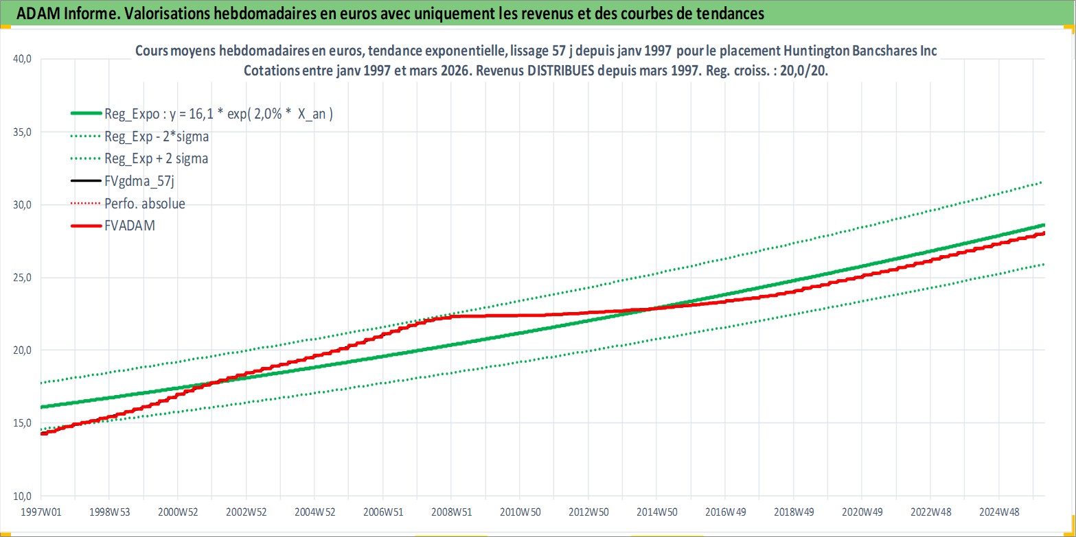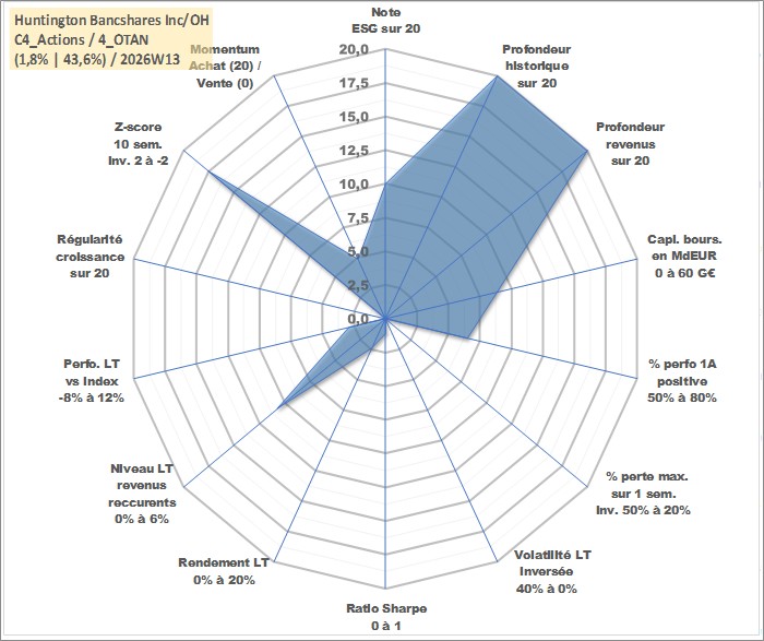 Site dédié aux investisseursPage dédiée sur site financeAnalyse des valorisations hebdomadaires de l'action Huntington Bancshares Inc/OH. Cet actif est cote en USD. Les valorisations sont en contrevaleur EURO et couvrent les semaines 1997W01 a 2026W13. Les revenus de cet actif financier sont pris en compte depuis la semaine 1997W11. La note globale ESG de cet actif est estimee a 10.0 (apres rebasage entre 0 et 20).