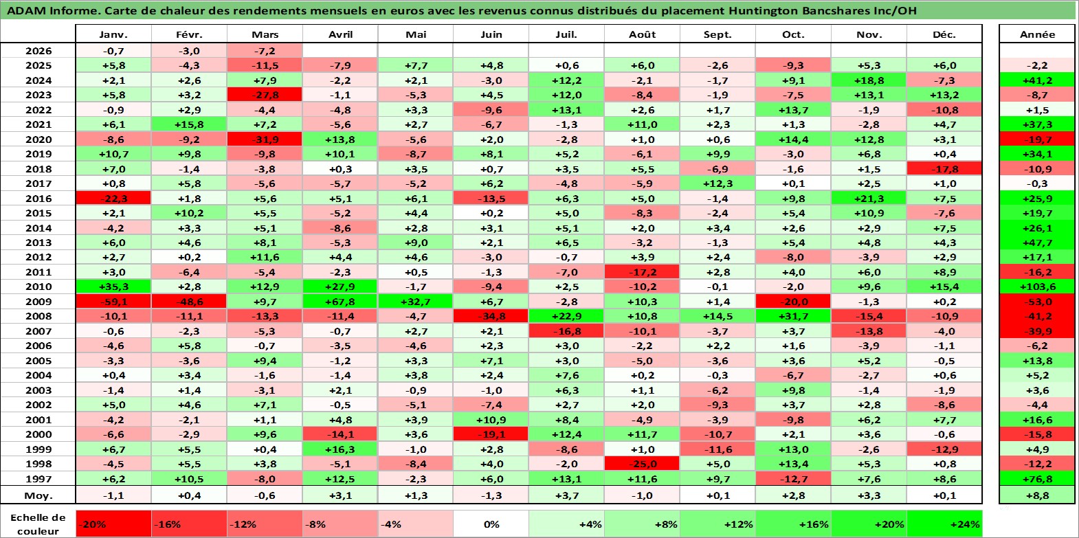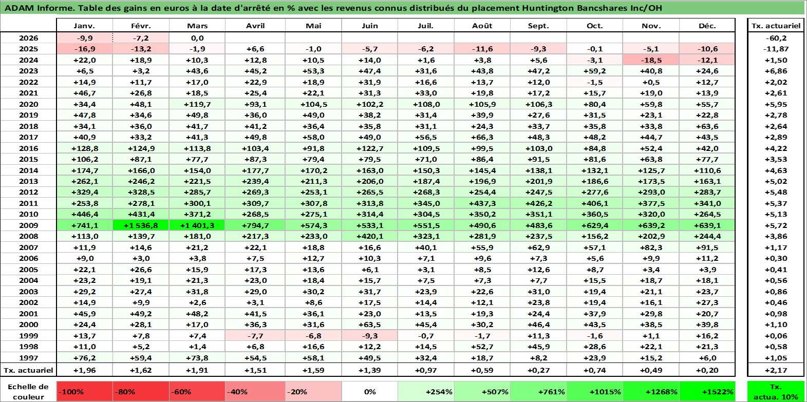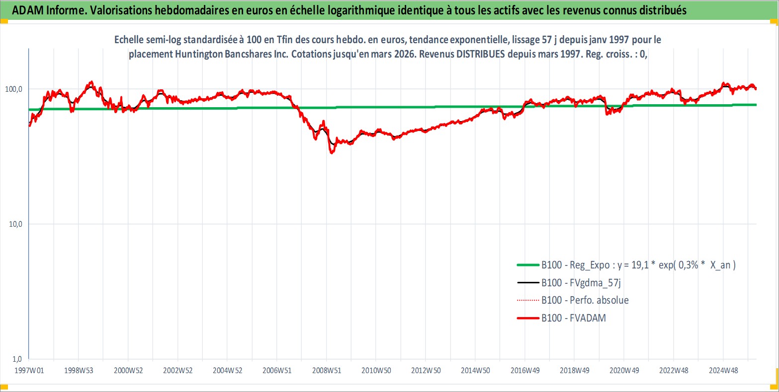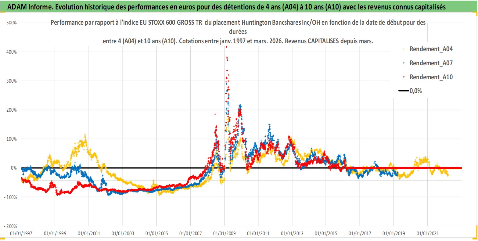 Site dédié aux investisseursPage dédiée sur site financeAnalyse des valorisations hebdomadaires de l'action Huntington Bancshares Inc/OH. Cet actif est cote en USD. Les valorisations sont en contrevaleur EURO et couvrent les semaines 1997W01 a 2026W13. Les revenus de cet actif financier sont pris en compte depuis la semaine 1997W11. La note globale ESG de cet actif est estimee a 10.0 (apres rebasage entre 0 et 20).
