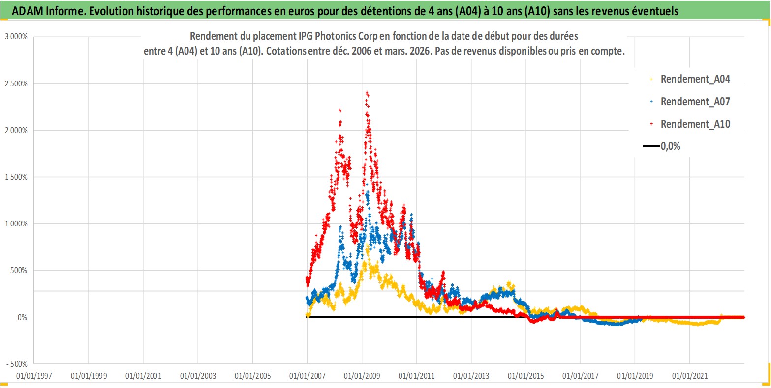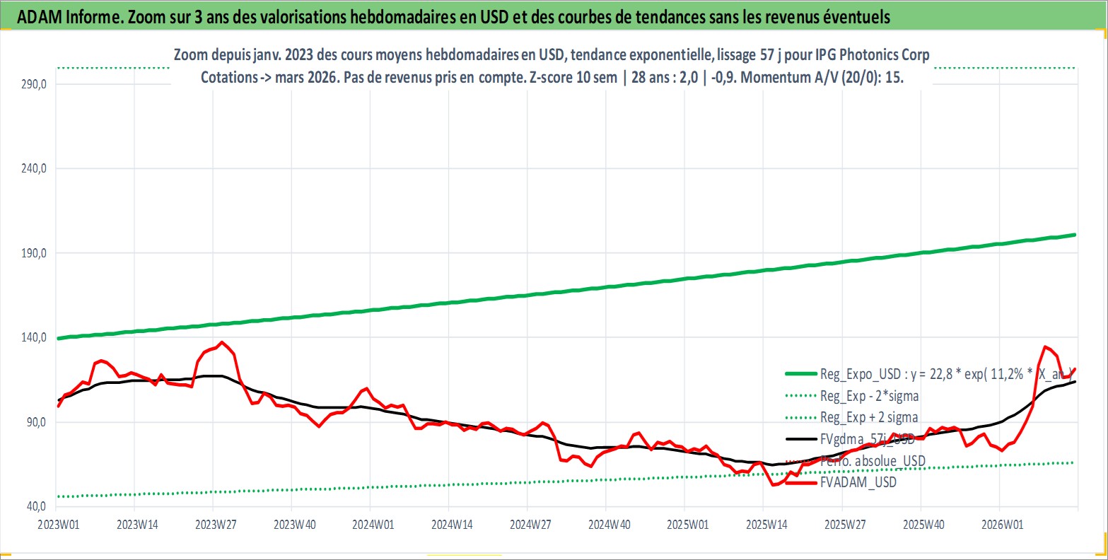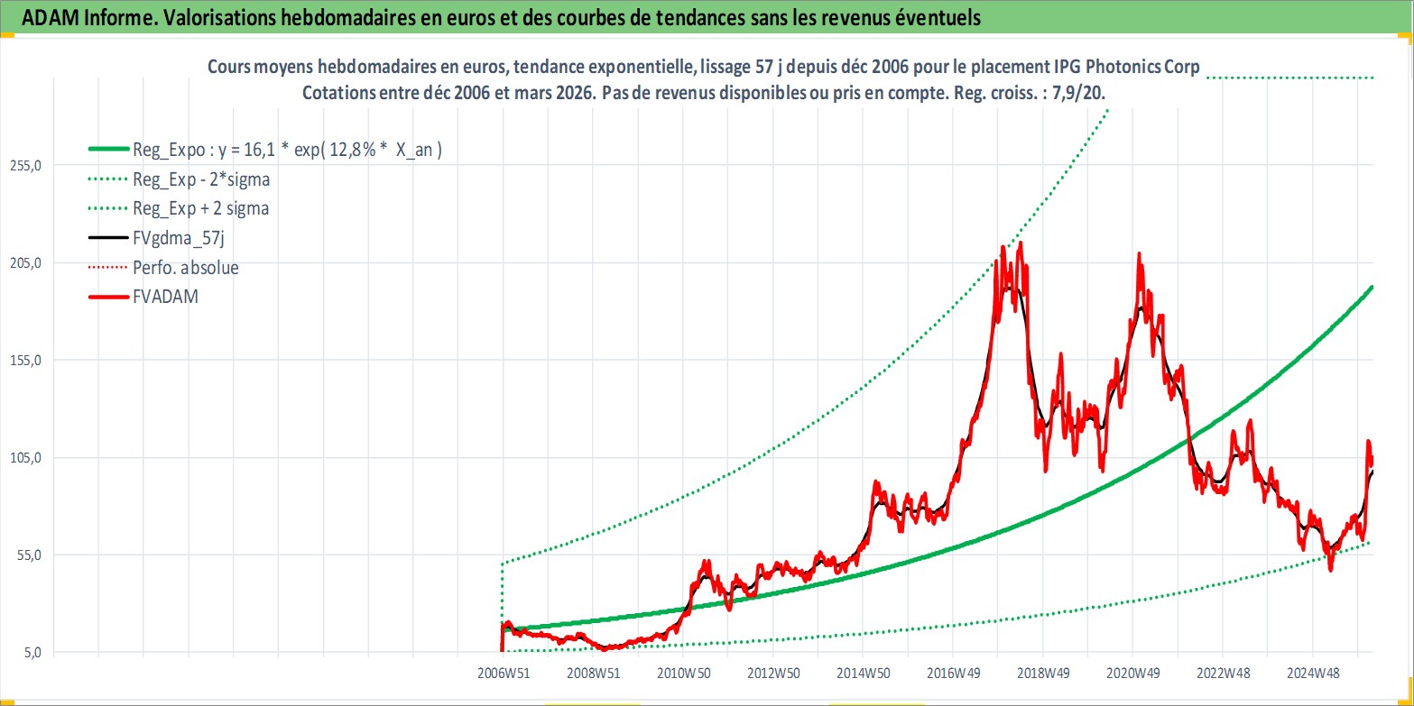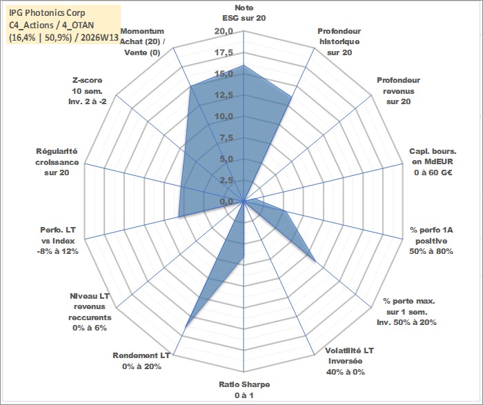 Site dédié aux investisseursPage dédiée sur site financeAnalyse des valorisations hebdomadaires de l'action IPG Photonics Corp. Cet actif est cote en USD. Les valorisations sont en contrevaleur EURO et couvrent les semaines 2006W50 a 2026W13. Les revenus de cet actif financier ne sont pas connus car non existants ou non disponibles sur le site Yahoo Finance. La note globale ESG de cet actif est estimee a 16.0 (apres rebasage entre 0 et 20).